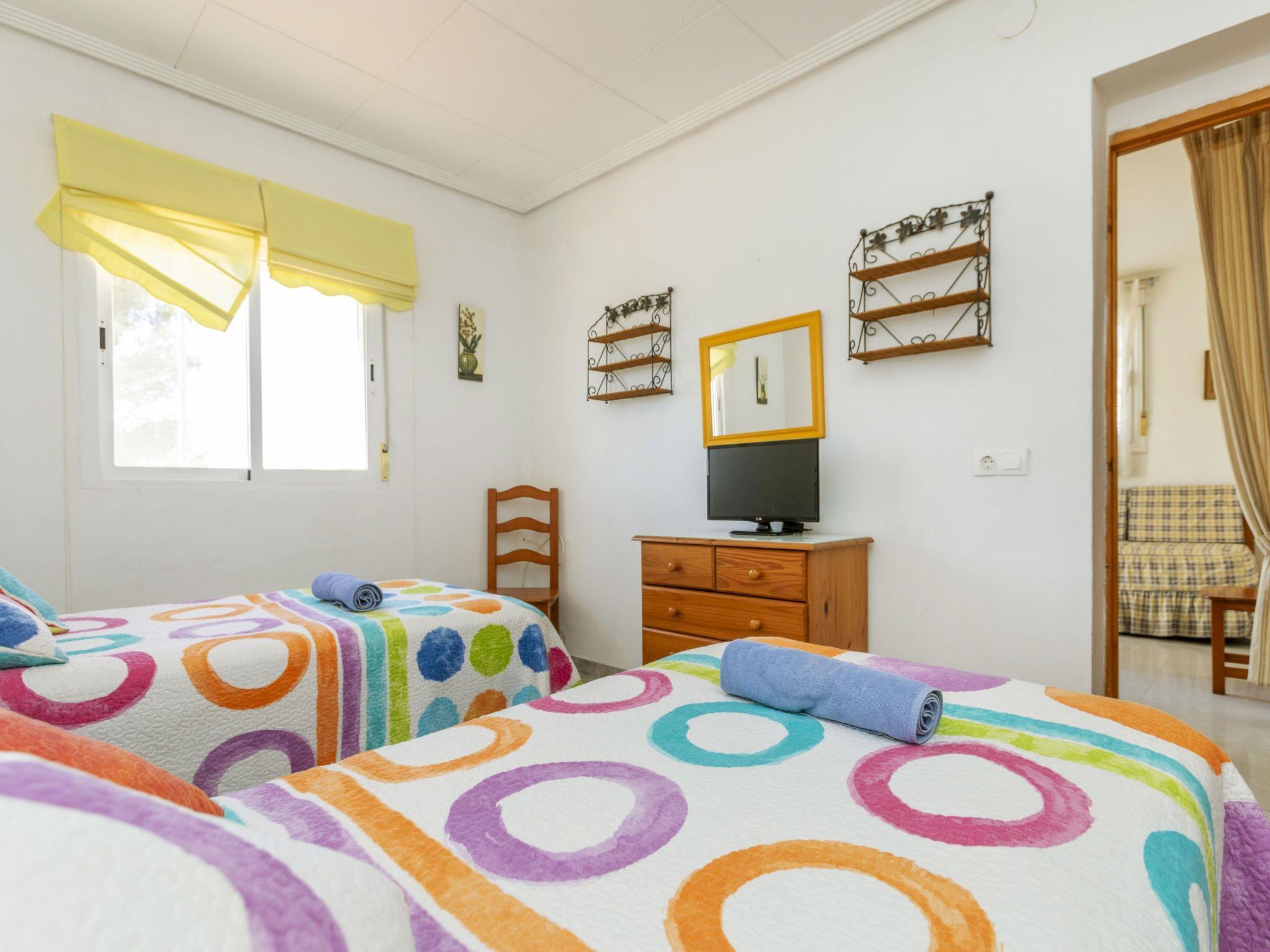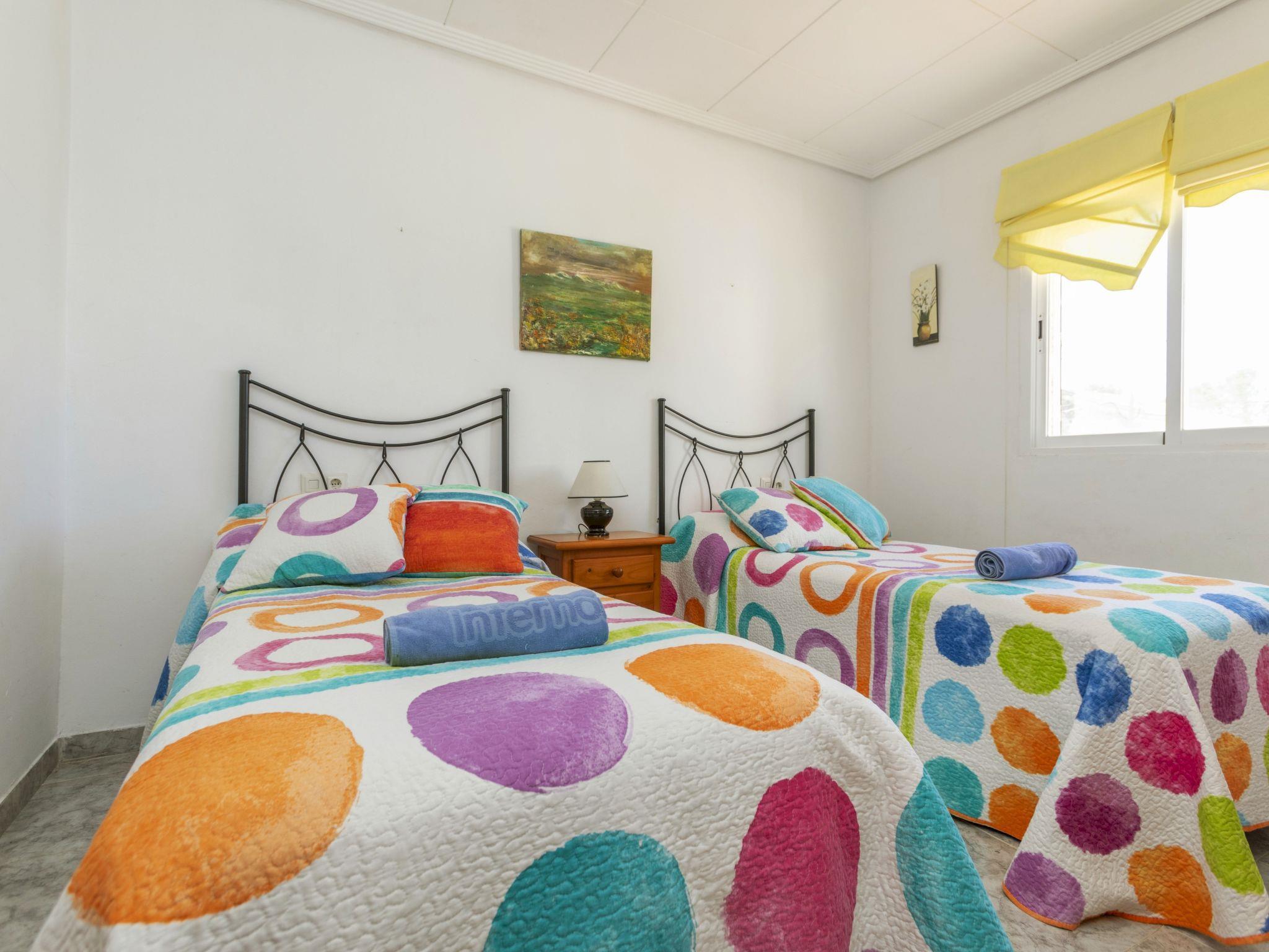 "Palmera III", 4-room terraced house 90 m2 on 2 levels. Comfortable and cosy furnishings: living/dining room with dining table, digital TV and air conditioning. Exit to the terrace. 1 room with 1 french bed (135 cm, length 190 cm), shower/bidet/WC. Kitchen (oven, dishwasher, 3 ceramic glass hob hotplates, toaster, microwave, electric coffee machine). Exit to the garden, to the swimming pool. Shower/WC. Upper floor: 1 room with 1 french bed (150 cm, length 190 cm). Exit to the balcony. 1 room with 2 beds (90 cm, length 190 cm). Interconnecting room with air conditioning. Shower/WC. Garden, lawn. Terrace furniture, barbecue. View of the swimming pool and the garden. Facilities: washing machine, iron, mosquito net, hair dryer. Internet (WiFi, free). Parking at the house. Maximum 2 pets/ dogs allowed. HUTTE-000680