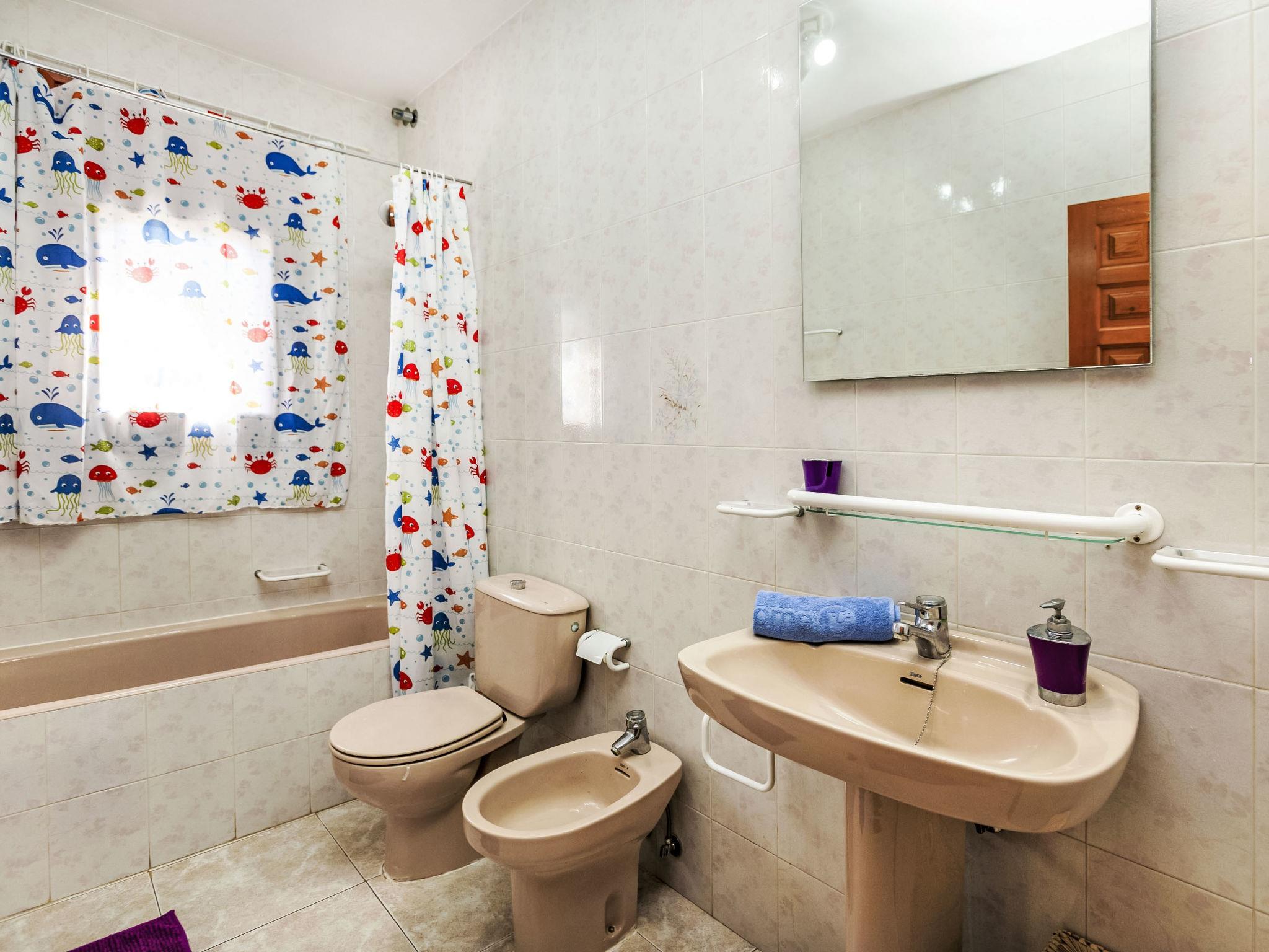 "Villa Barcelona", 4-room villa 130 m2. Comfortable and cosy furnishings: living/dining room with dining table, digital TV, air conditioning and fan. 1 room with 1 french bed (135 cm). 2 rooms, each room with 2 beds (90 cm). Walk-through room with air conditioning. Open kitchen (4 hot plates, oven, dishwasher, toaster, kettle, microwave, electric coffee machine). Bath/bidet/WC, shower/WC. Air-conditioning, boiler (120 litres). No heating option. Patio. Terrace furniture, barbecue. Facilities: washing machine, iron, children's high chair, baby cot, hair dryer. Internet (WiFi, free). Parking at the house. HUTTE-066823 // Reg. Nr.: ESFCTU00004302000007838500000000000000HUTTE-066823-049
