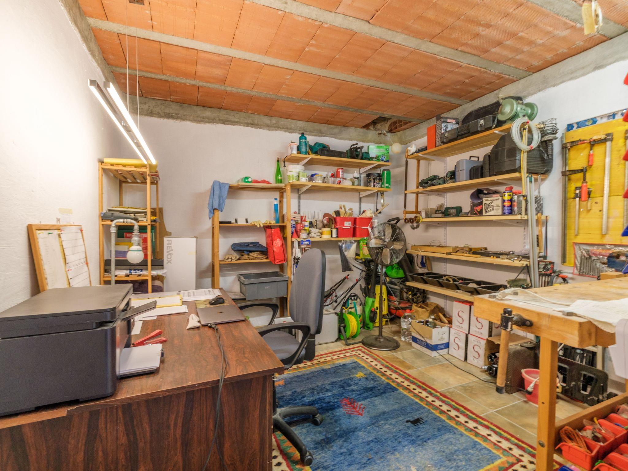 Outside, you will find the 800 m² property with no direct neighbours. The subtropical garden surrounds a large private pool (10 m x 5 m x 1.20 m, depth up to 2.10 m). Next to the pool ate two sun loungers and a dining table and chairs, where you can enjoy your meals al fresco. The garage offers a gym and a ping pong table.