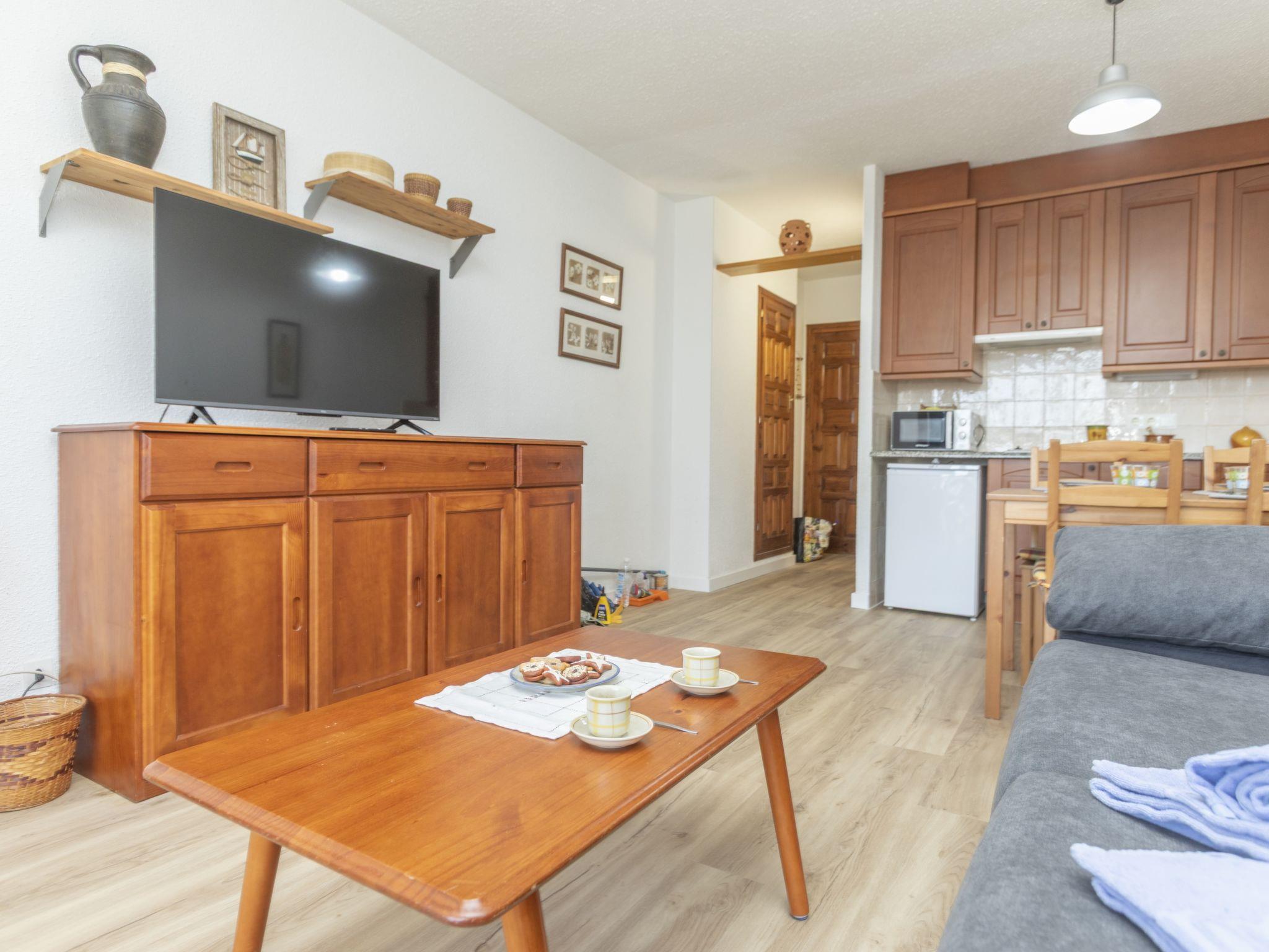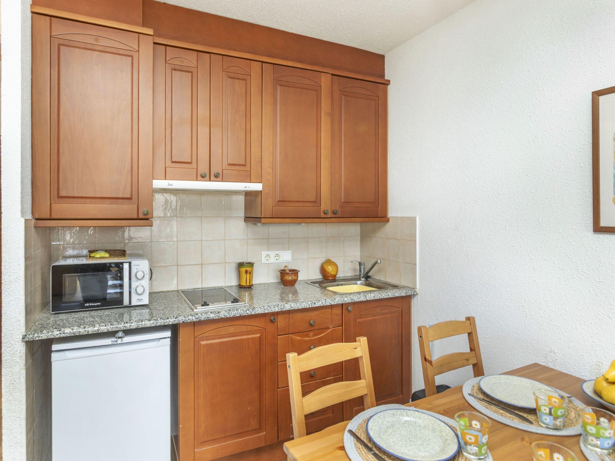 1-room apartment 25 m2 on 1st floor. Comfortable furnishings: living/dining room with 1 double sofabed (135 cm, length 190 cm), cable TV (flat screen). Open kitchen (2 ceramic glass hob hotplates, toaster, kettle, microwave, electric coffee machine). Bath/bidet/WC. No heating option. Panoramic view of the sea and the resort. Facilities: iron, hair dryer. Internet (WiFi, free). HUTG-006831 // Reg. Nr.: ESFCTU00001701000025081700000000000000HUTG-006831-563