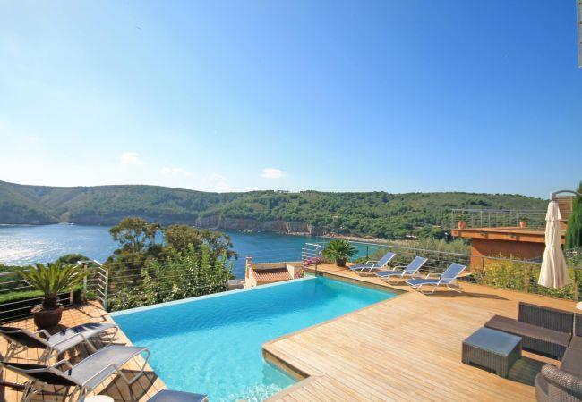 The house has three large terraces, a pool that overflows to the deep blue sea and a big garden where children can play freely. In total in the villa can sleep 8 people (3 double beds and 2 single beds).