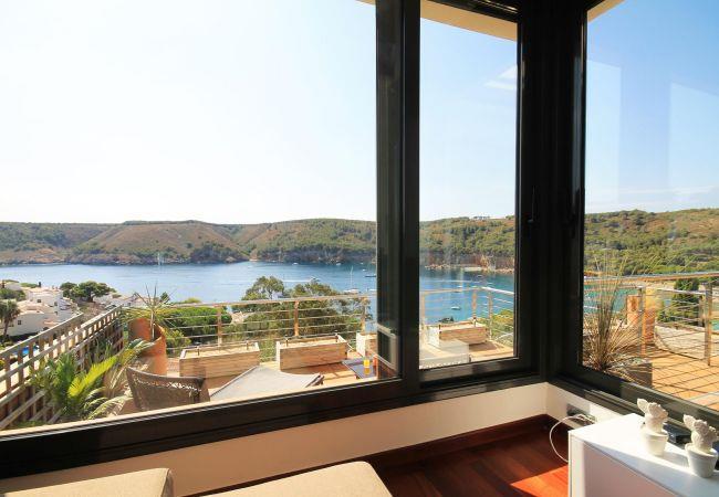 This villa is distributed so that three of its four bedrooms as well as the living and dining room has panoramic views of the Mediterranean Sea, the Natural Park of Montgrí and the lovely beach of Cala Montgo. The villa also has a fully equipped kitchen, two bathrooms and a toilet.