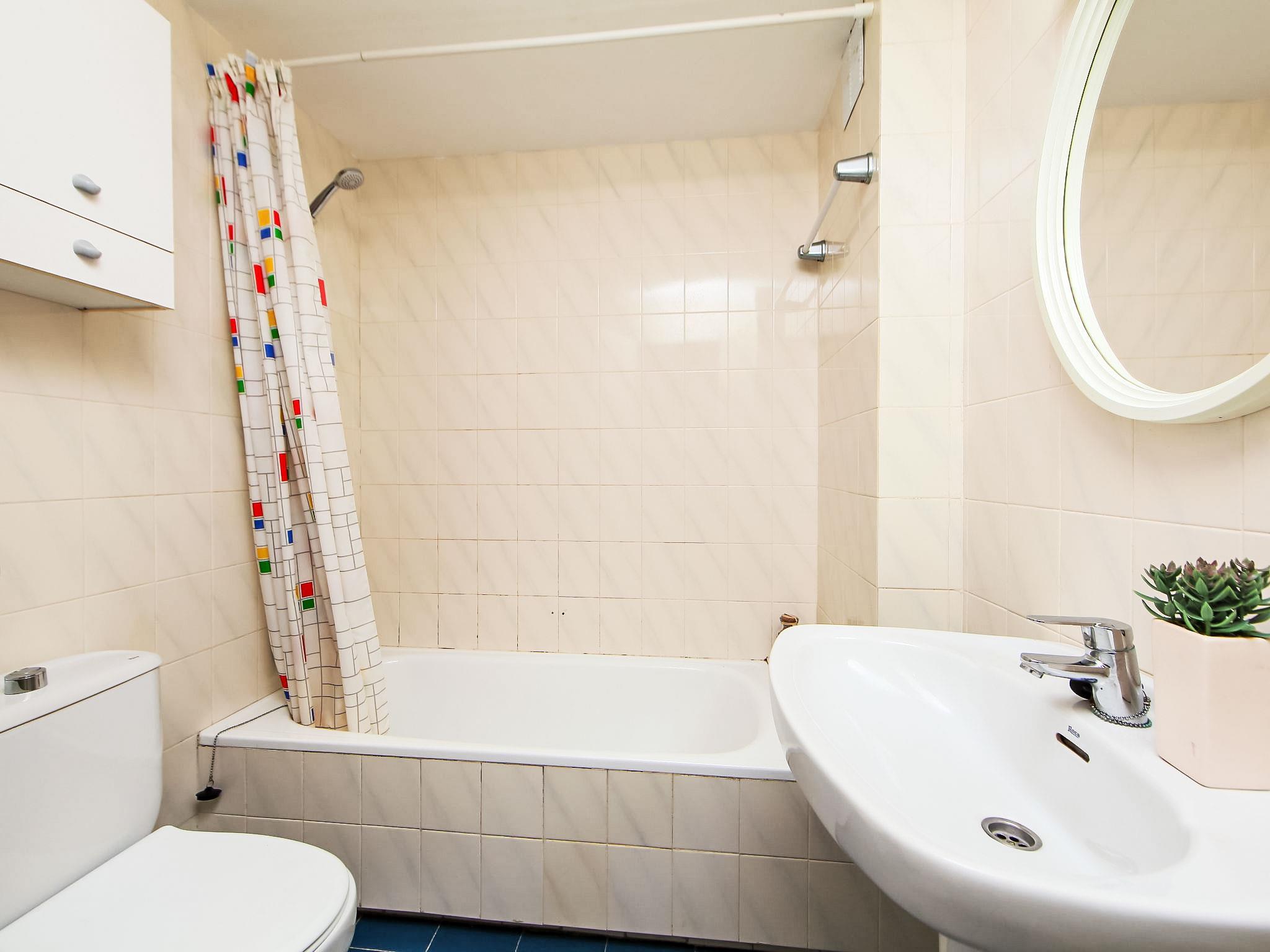 "Residencial Manureva II", 1-room apartment 27 m2 on 1st floor. Living/dining room with 2 pull-out beds (2 pers.), 1 folding bed (80 cm), digital TV and flat screen. Kitchenette (microwave). Bath/bidet/WC. Electric heating, boiler (50 litres). Terrace. Terrace furniture. Beautiful view of the sea, the mountains and the swimming pool. Facilities: Internet (WiFi, free). Garage, height 210 cm. Please note: TV only ES. HUTG005670 // Reg. Nr.: ESFCTU00001700700002532300000000000000000HUTG005670