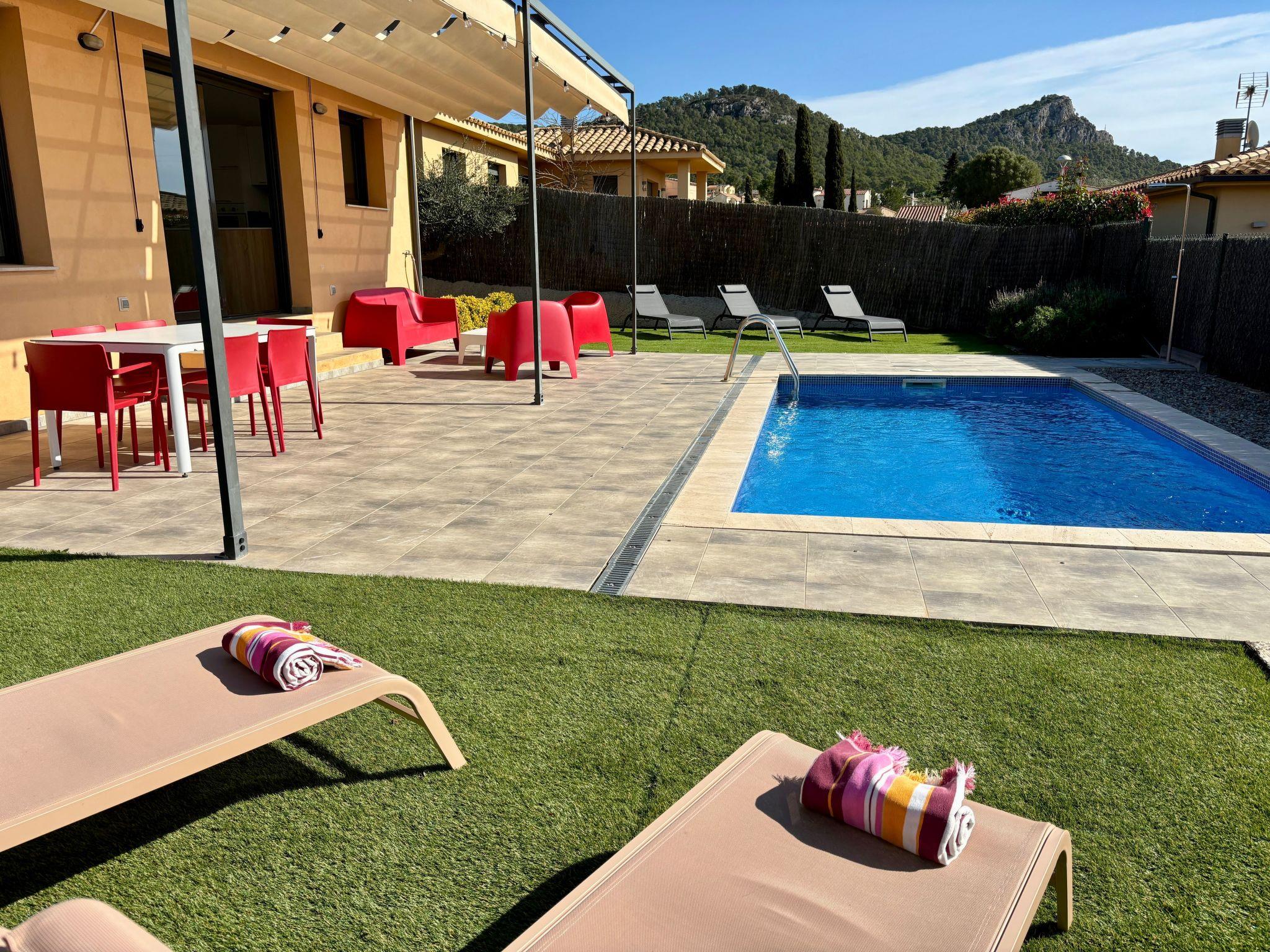 Villa with private pool and garden. They consist of a large living room with high ceilings, a dining area, a modern open and well-equipped kitchen, three bedrooms, two bathrooms, a large garden terrace with garden furniture and an area with sun loungers. The fully fenced property has artificial lawn, trees, bushes and a parking lot for 1.5 cars. The centre of Estartit and the beach are less than 3 kilometres away. The next supermarket you find in 850 metres. The nearest golf course is Empordà Golf, 8 km away. The golf course of Pals is 15 km and the Pitch & Putt of Gualta 5 km away. In 900 meters distance there is a tennis club.