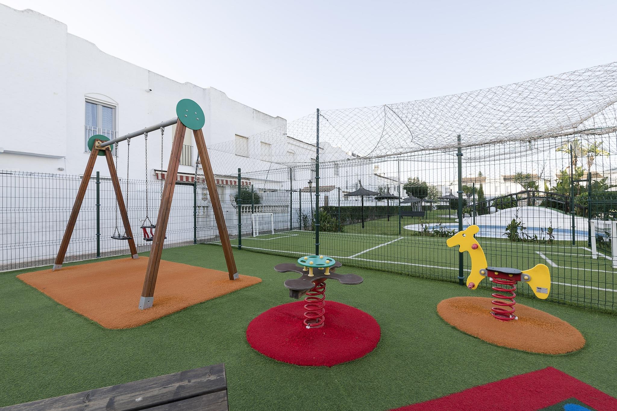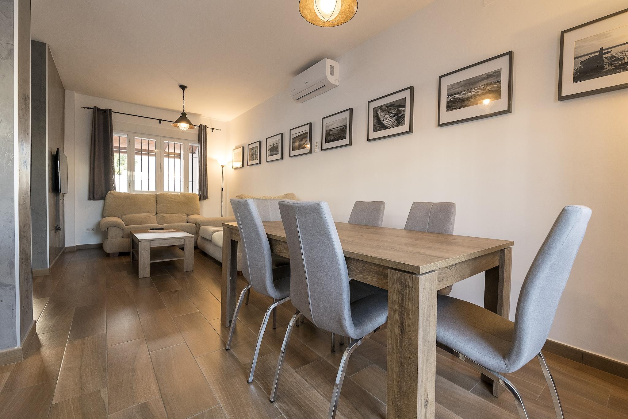 De buitenkant van het pand is ideaal om te genieten van het zuidelijke klimaat. In de gemeenschappelijke ruimtes vindt u een grote tuin waar zich een gemeenschappelijk zwembad van 32 x 18 m met een dieptebereik tussen 1,10 en 2 m bevindt, evenals een ander zwembad voor de kleintjes met een diameter van 7,5 m en een constante diepte van 0,4 m. Er is ook een speeltuin voor kinderen en, voor de meer sportievelingen, verschillende banen waar u kunt tennissen of voetballen. Eenmaal in het huis kunt u genieten van een patio met een gemeubileerde veranda en een barbecue, ideaal om met uw gezelschap gezellig te eten of te borrelen. Omdat het huis zich in een urbanisatie bevindt, heeft het directe buren. Het huis met twee verdiepingen is ontworpen om u de rust te bieden die u verdient. Op de begane grond bevindt zich een woon-eetkamer met airconditioning en Smart TV. De keuken, in open verbinding met de woonkamer, beschikt over een keramische kookplaat en de benodigde apparatuur om comfortabel te kunnen koken. In het huis is er een wasmachine, strijkijzer en strijkplank. Op deze verdieping bevindt zich een badkamer met douche. Via een trap komt u op de eerste verdieping, waar zich de drie slaapkamers bevinden, allemaal met AC en ventilator. Twee ervan hebben twee eenpersoonsbedden, terwijl de andere een tweepersoonsbed heeft. Op deze verdieping bevindt zich een badkamer met ligbad. Als u met uw baby reist, kunnen wij u voorzien van een kinderbedje en een kinderstoel. De woning is gelegen in La Barrosa, een gebied vlakbij Chiclana de la Frontera, een van de meest charmante gemeenten in de provincie. Bij u in de buurt vindt u alle noodzakelijke diensten om van een zelfstandig verblijf te genieten. Op slechts 5 km afstand ligt het bekende strand van La Barrosa, een 8 km lang zandstrand dat een unieke ruimte wordt waar u kunt genieten van de zee, frisse lucht kunt inademen en kunt profiteren van het geweldige toeristische aanbod dat onder zijn invloed is ontstaan. Als je daar zin in hebt, kun je naar Chiclana gaan en een route nemen langs de zeven "magische punten", uitkijkpunten vanwaar je een prachtig uitzicht over de stad kunt bewonderen. De meest avontuurlijken vinden ook nabijgelegen routes om te voet of met de fiets te volgen en waar ze kunnen genieten van de natuur van de omgeving. Het zwembad is geopend van 1 juni tot en met 30 september. Voor eventuele bijkomende kosten kunt u contact opnemen met de adverteerder. Wij accepteren geen huisdieren. Het vieren van evenementen is niet toegestaan. Er is buiten parkeergelegenheid voor 1 auto. Afstanden Strand: 5 km - Playa de la Barrosa Luchthaven: 59,6 km - Jerez Golfbaan: 8,3 km - Golfclub La Estancia Chiclana Stad: 3,7 km - Chiclana de la Frontrera Treinstation: 20,7 km - San Fernando Bushalte: 0,17 km - Chiclana de la Frontera Veerboot: 30,8 km - Cádiz Ziekenhuis: 3,9 km - Viamed Bahía de Cádiz-ziekenhuis Toeristenvergunning: VUT/CA/00005