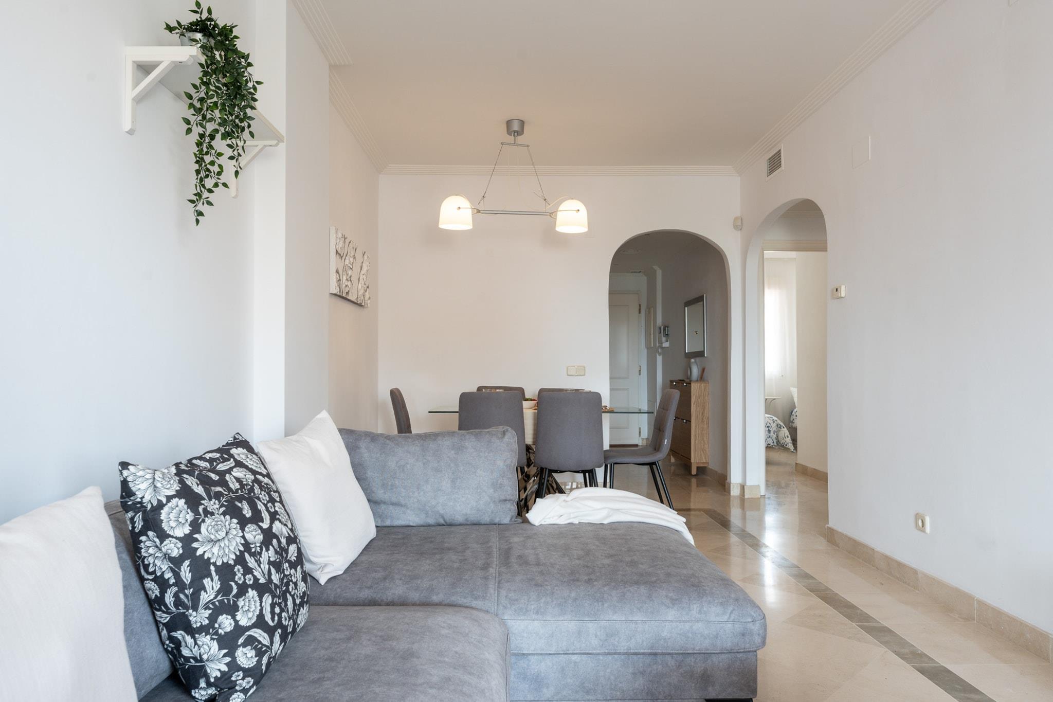 Fordyb dig i den fredfyldte luksus i denne udsøgte lejlighed, perfekt placeret på den allerførste linje af den berømte "Calanova Golf"-bane. Her møder en betagende udsigt over de frodige, grønne fairways det glitrende Middelhav og skaber en idyllisk kulisse for din ferie på Costa del Sol. Dette er mere end bare et ophold; det er en invitation til at slappe af i prestigefyldte omgivelser. Denne indbydende lejlighed har to komfortable soveværelser og to veludstyrede badeværelser, der tilbyder rigelig plads til afslapning. Den store stue er et centrum for underholdning, udstyret med alle mulige udenlandske tv-kanaler, mens det fuldt udstyrede køkken tilbyder alt, hvad du behøver til dejlige kulinariske kreationer. Gå ud på den dejlige terrasse, dit private udendørsparadis, hvor du kan nyde morgenkaffe eller aftendrinks med virkelig spektakulær golf- og havudsigt. Beliggende i en privat urbanisering med dedikeret sikkerhed, er din ro i sindet sikret. Du er kun en bekvem 10 minutters kørsel fra både Marbellas glamour og Fuengirolas pulserende charme, hvilket placerer det bedste af Costa del Sol inden for rækkevidde. Malaga Internationale Lufthavn ligger også kun 25 minutter væk. Calanova GRAND Golf ligger i Mijas Costa og har en unik og privilegeret beliggenhed omgivet af rekreative faciliteter, herunder marinaen, Club del Sol Tennis School og den symbolske Cala de Mijas. Komplekset i sig selv løfter din oplevelse med to forfriskende swimmingpools, paddletennisbaner, en sommerbar-restaurant, concierge-service og store haver fyldt med subtropisk vegetation.