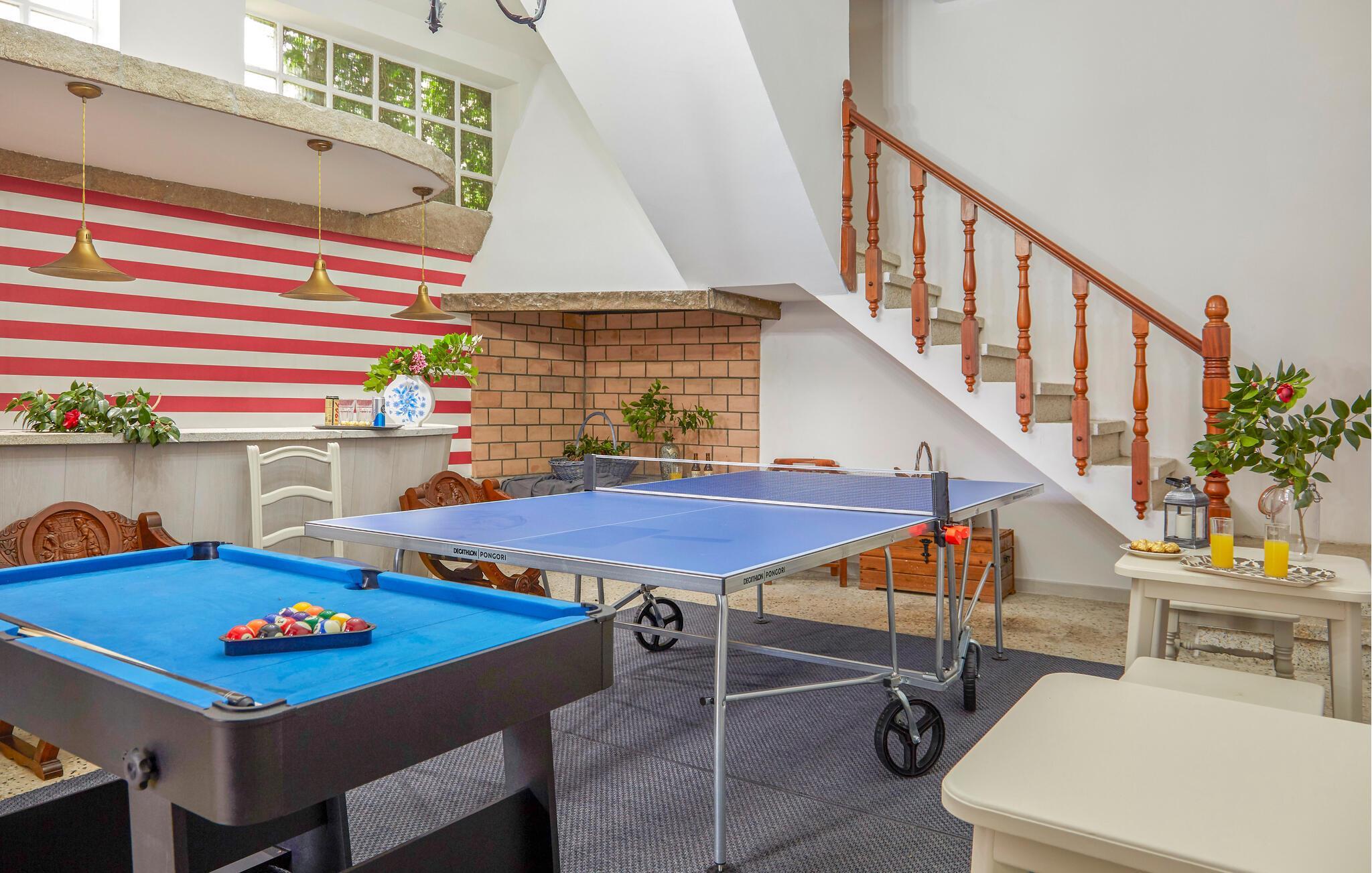 Oplev det fortryllende interiør i denne store grund, hvor antikke møbler er blevet flot præsenteret og skaber en indbydende, atmosfære. Lad jer inspirere af udsigten til det grønne i det charmerende køkken og glæd jer til hyggelige stunder i den stilrene spiseplads. Hav det sjovt ved bordtennisbordet, udfordr jer selv ved poolbordet eller nyd gode samtaler i den behagelige sofa.