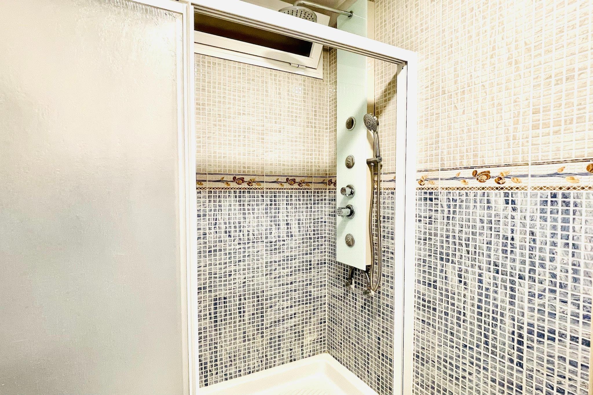 Stueetage: (Indgang (deles med andre gæster, adgang udefra)(elevator)) På 5. etage: (Indgang , åbent køkken(via forholdsvis stejle trapper)(kogeplade, elkedel, emhætte, kaffemaskine, ovn, mikrobølgeovn, køle-fryseskab), Stue/soveværelse(via forholdsvis stejle trapper)(enkeltsovesofa(120 x 200 cm), Fjernsyn(fladskærm), spisebord, sofahjørne), soveværelse(dobbeltseng(135 x 190 cm)), badeværelse(bruser, håndvask, toilet), varme, klimaanlæg, terrasse(privat, 8 m2)) havemøbler, parking lot(public), swimmingpool(deles med andre gæster, udendørs)