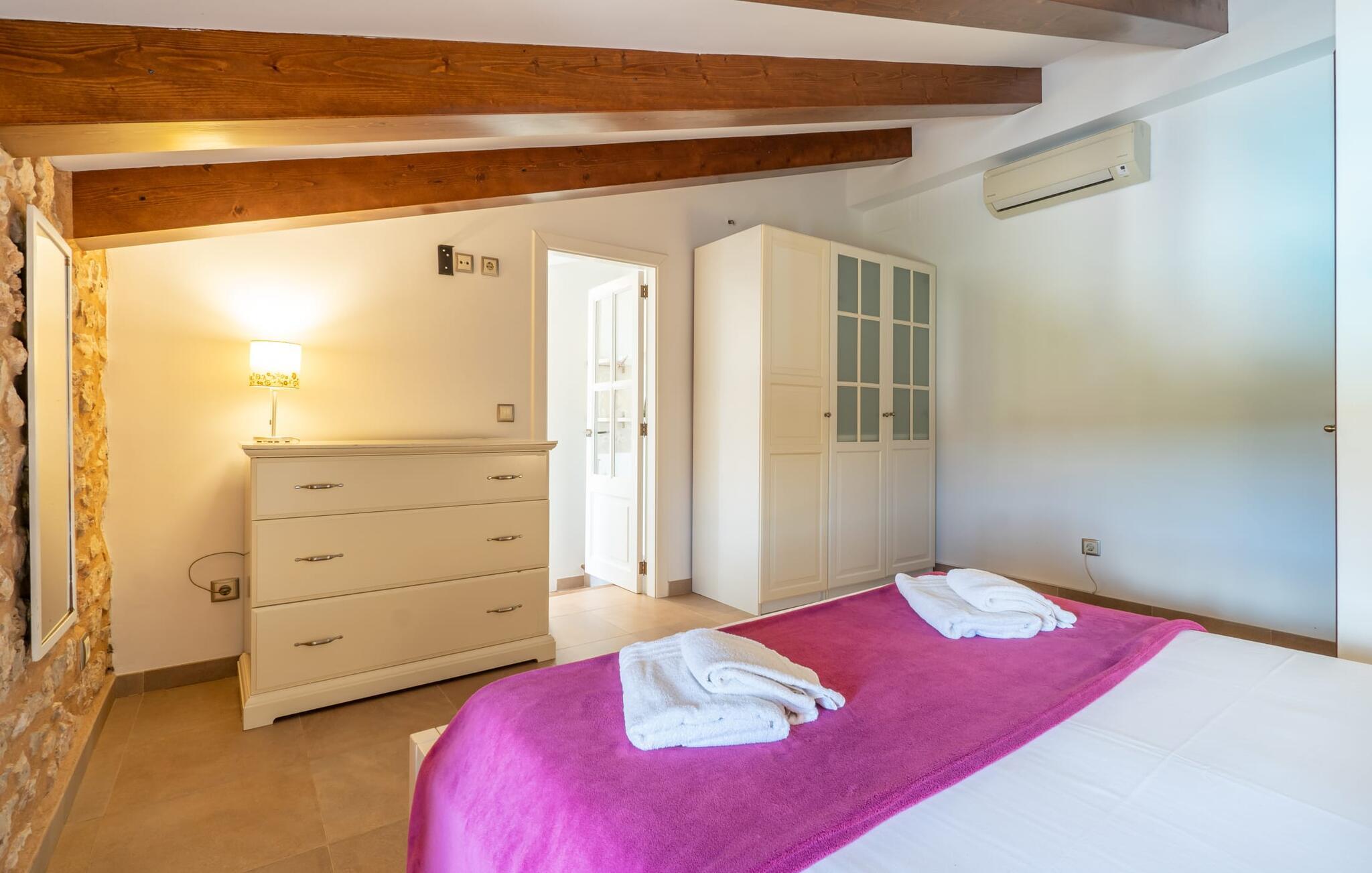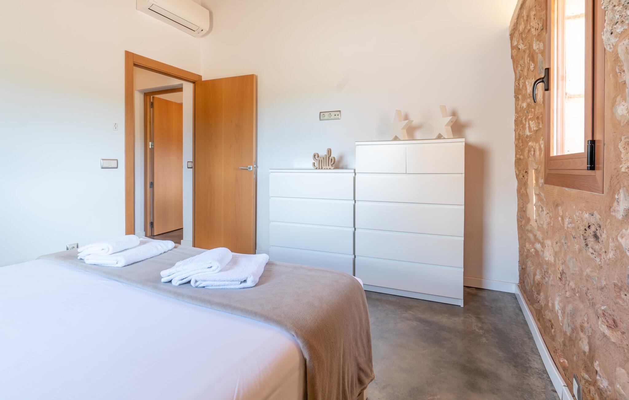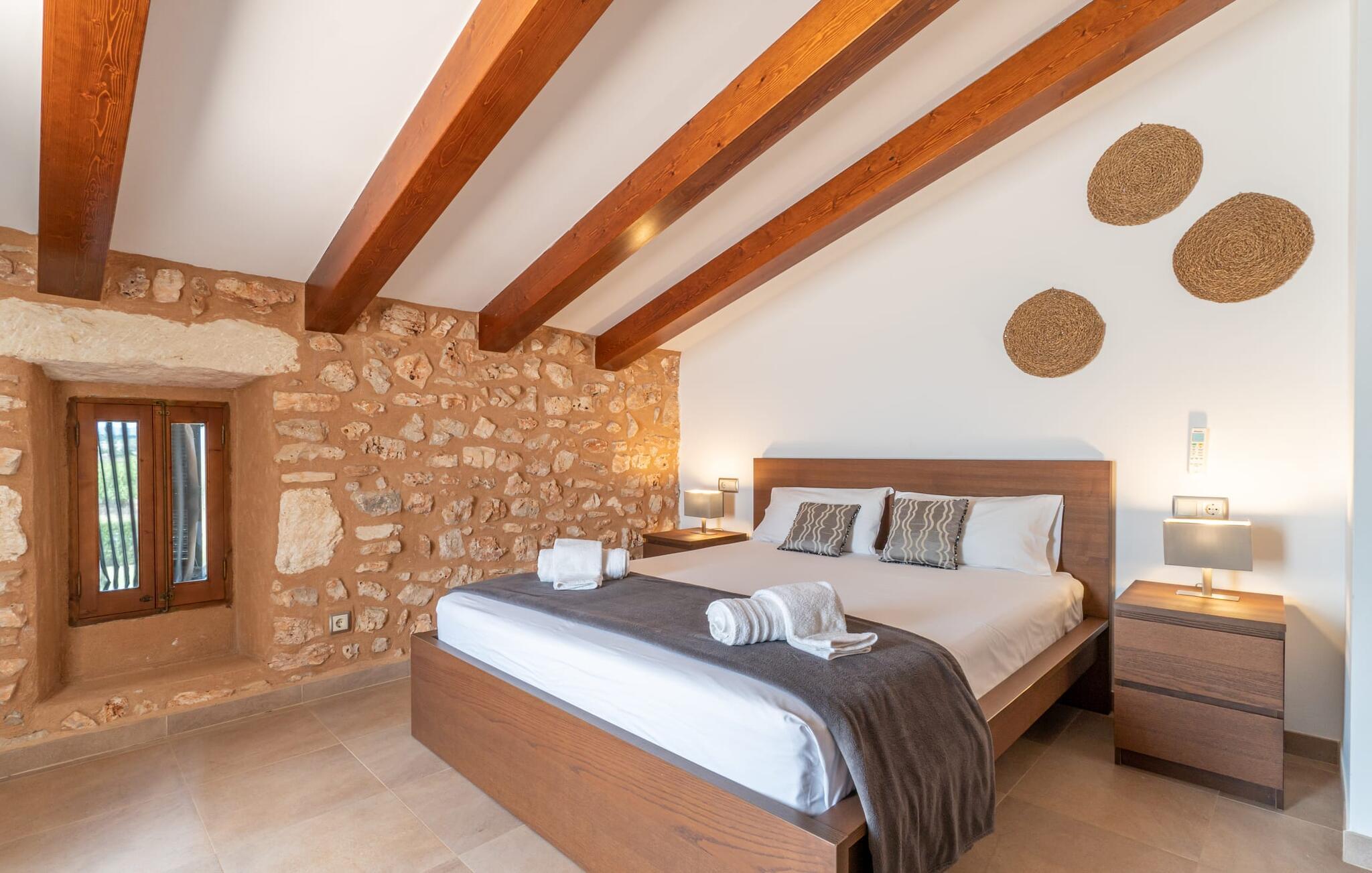 Velkommen til Finca "La Mallorquina", et charmerende feriested i det maleriske østlige Mallorca. Dette smukt restaurerede bondehus er sammen med et moderne pensionat omgivet af et idyllisk lavland. Gæsterne kan nyde en betagende panoramaudsigt over bakkerne i Serra de Levant Udendørsområdet har en lavvandet pool med nem adgang, en velplejet græsplæne og en rummelig skyggefuld terrasse med opholds- og spisepladser og et sommerkøkken. Grillfaciliteterne vil sætte pris på legepladsen med legehus og bordtennisbord. Hovedhuset har en hyggelig stue med pejs, et rummeligt køkken, alt sammen med direkte adgang til det fri er også et stort soveværelse med dobbeltseng med walk-in garderobe et badeværelse Ovenpå er der yderligere tre soveværelser med dobbeltsenge, hver med sit eget badeværelse og en fantastisk udsigt over landskabet. Det moderne gæstehus i stueetagen byder på yderligere to soveværelser med dobbeltsenge, en stue med pejs, et køkken og et stort badeværelse. Alle seks soveværelser er udstyret med aircondition og varme, hvilket sikrer komfort under hele jeres ophold. Tæt på byen og familievenligt, "La Mallorquina" tilbyder panoramaudsigt over Tramuntana. Manacor er det ideelle sted at gøre jeres ugentlige shopping, sightseeing eller nyde en restaurant eller to rolige byer som Son Carrió eller San Lorenzo tilbyder friske produkter på landmændenes markeder Østkysten med sine utallige strande, fortryllende havnepromenader, hulelabyrinter og havet er lige. 12 km væk.