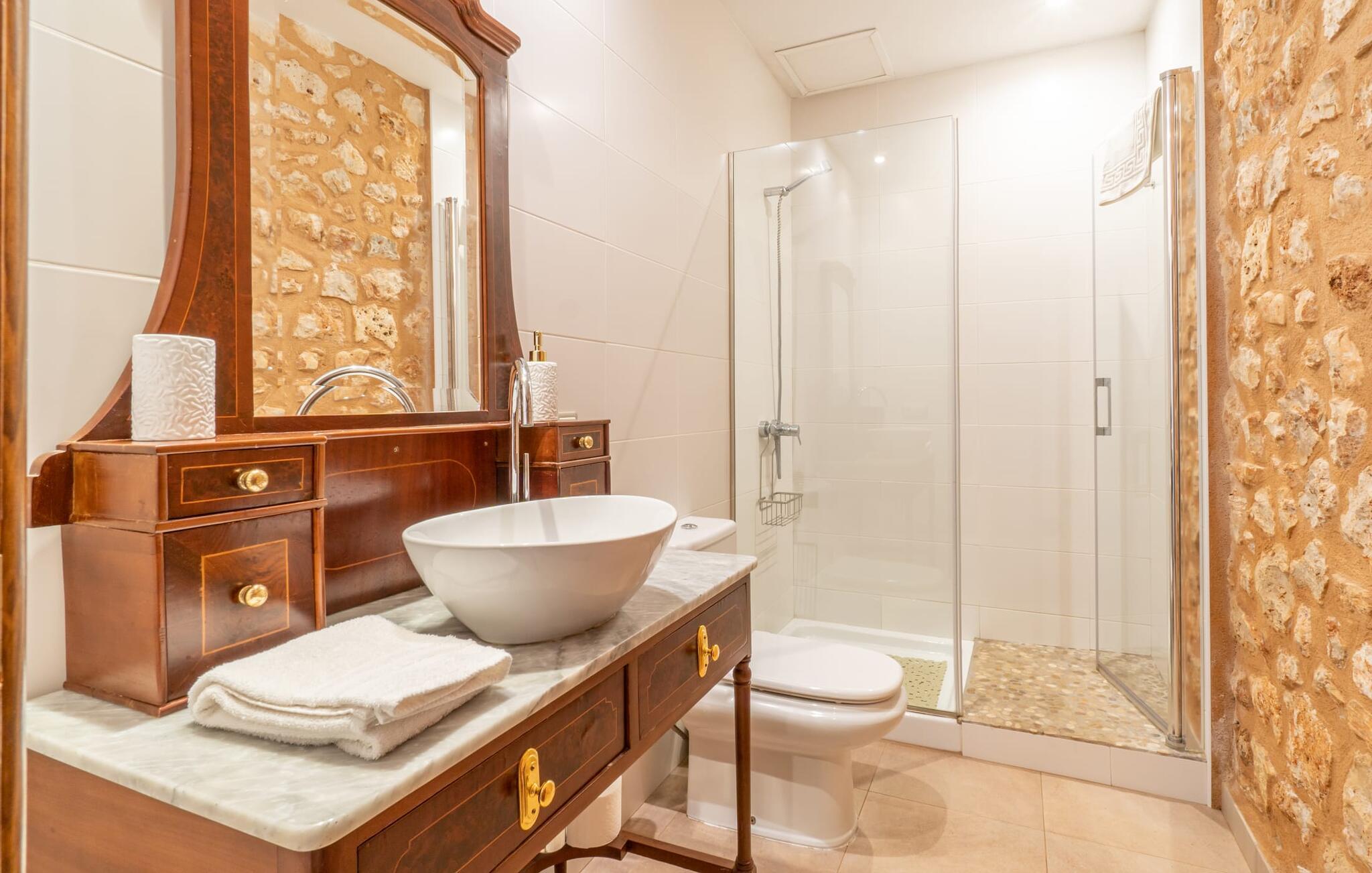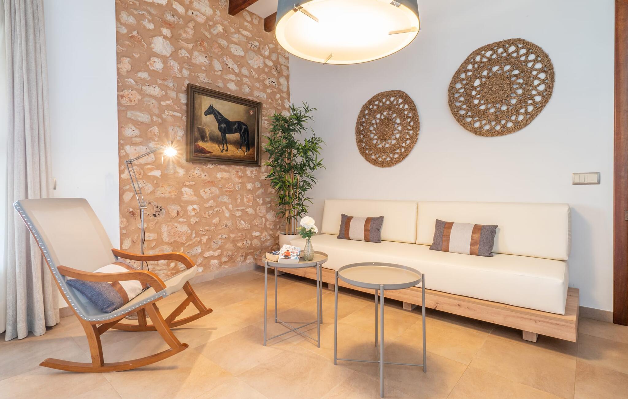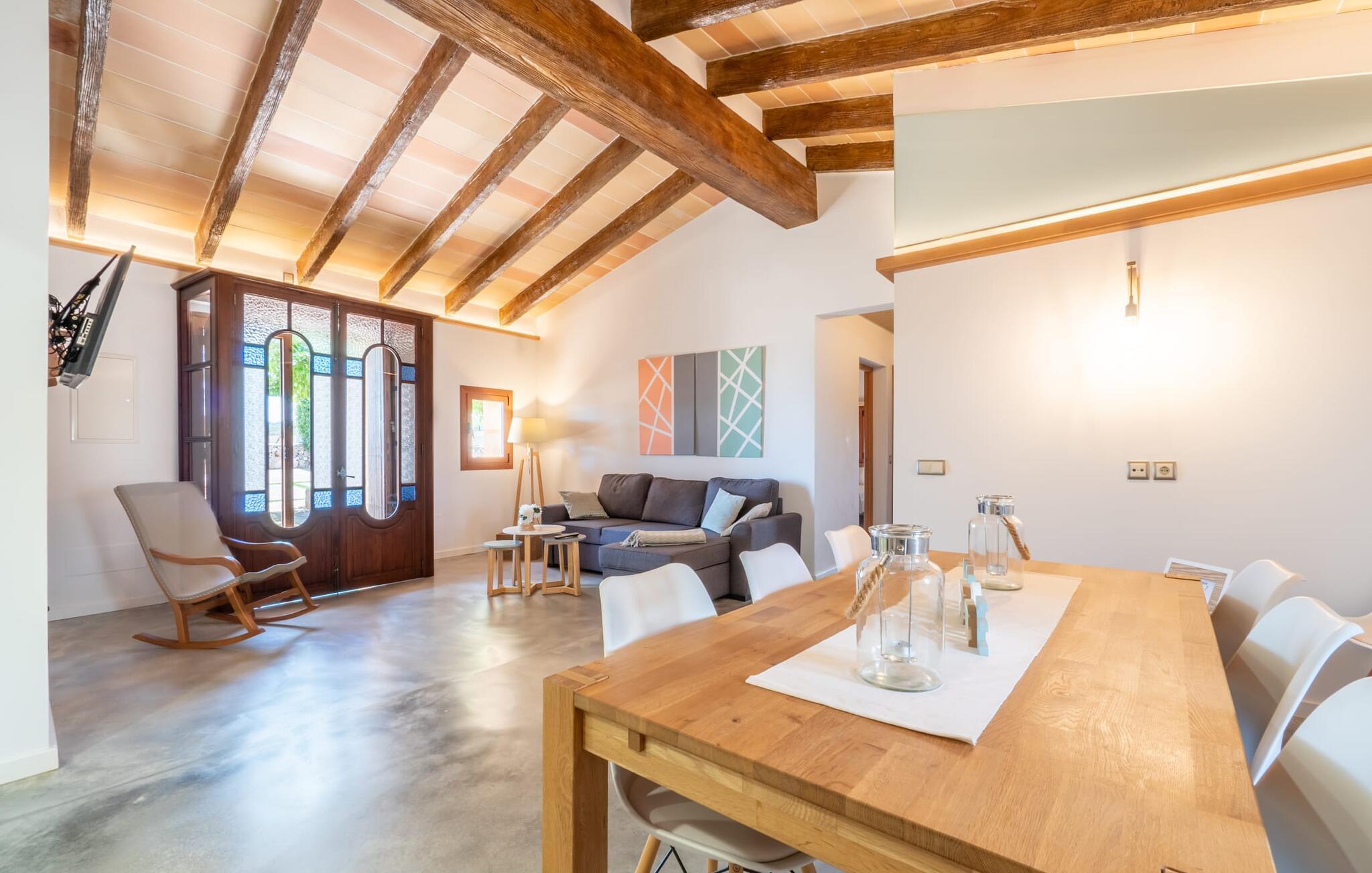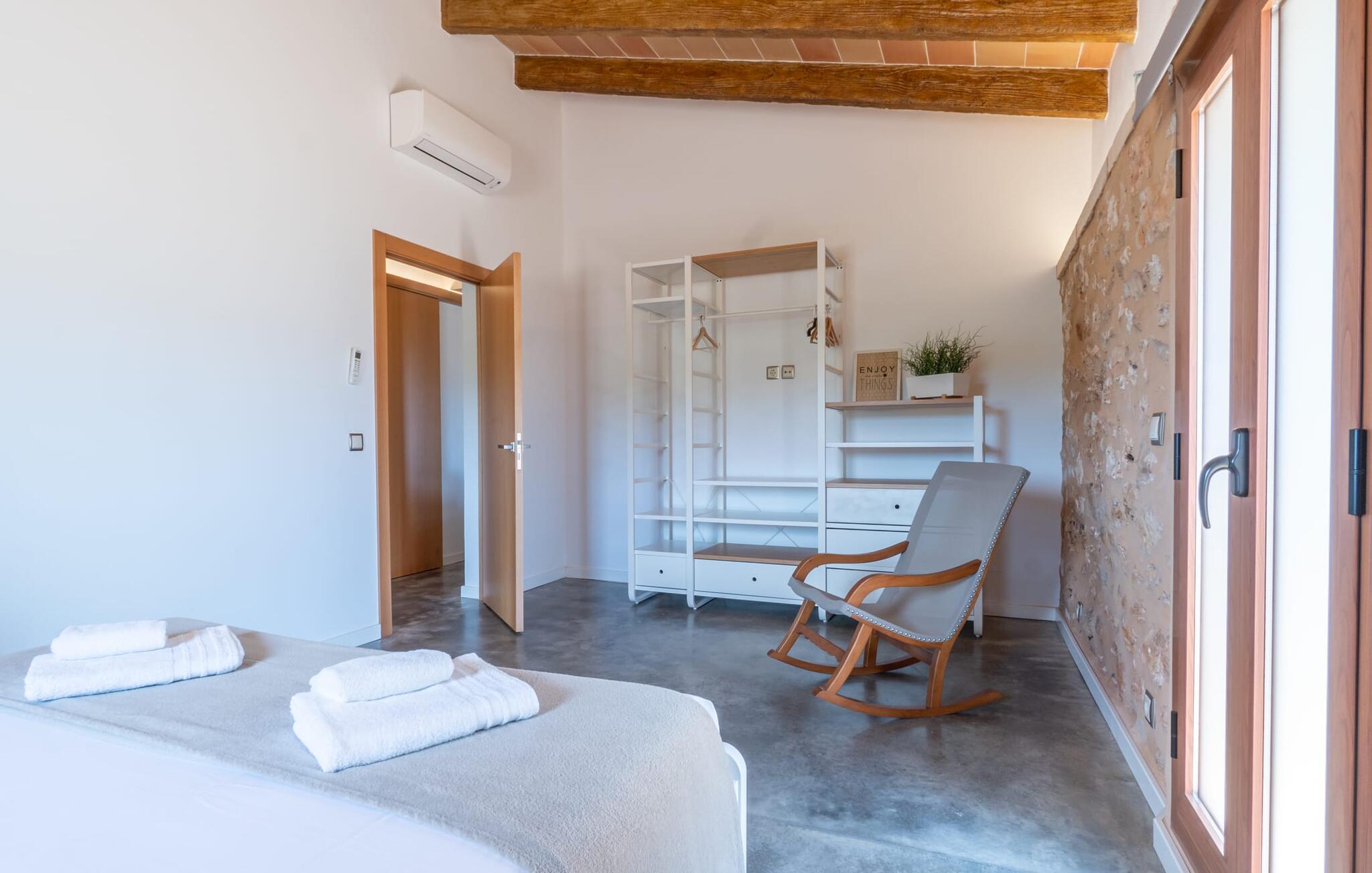 Velkommen til Finca "La Mallorquina", et charmerende feriested i det maleriske østlige Mallorca. Dette smukt restaurerede bondehus er sammen med et moderne pensionat omgivet af et idyllisk lavland. Gæsterne kan nyde en betagende panoramaudsigt over bakkerne i Serra de Levant Udendørsområdet har en lavvandet pool med nem adgang, en velplejet græsplæne og en rummelig skyggefuld terrasse med opholds- og spisepladser og et sommerkøkken. Grillfaciliteterne vil sætte pris på legepladsen med legehus og bordtennisbord. Hovedhuset har en hyggelig stue med pejs, et rummeligt køkken, alt sammen med direkte adgang til det fri er også et stort soveværelse med dobbeltseng med walk-in garderobe et badeværelse Ovenpå er der yderligere tre soveværelser med dobbeltsenge, hver med sit eget badeværelse og en fantastisk udsigt over landskabet. Det moderne gæstehus i stueetagen byder på yderligere to soveværelser med dobbeltsenge, en stue med pejs, et køkken og et stort badeværelse. Alle seks soveværelser er udstyret med aircondition og varme, hvilket sikrer komfort under hele jeres ophold. Tæt på byen og familievenligt, "La Mallorquina" tilbyder panoramaudsigt over Tramuntana. Manacor er det ideelle sted at gøre jeres ugentlige shopping, sightseeing eller nyde en restaurant eller to rolige byer som Son Carrió eller San Lorenzo tilbyder friske produkter på landmændenes markeder Østkysten med sine utallige strande, fortryllende havnepromenader, hulelabyrinter og havet er lige. 12 km væk.