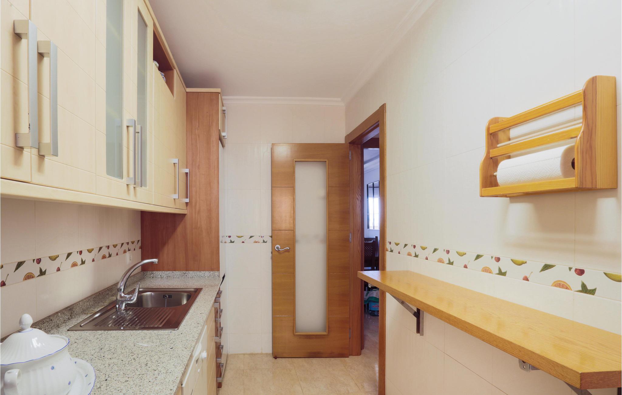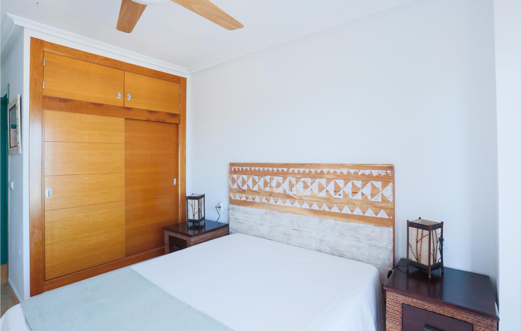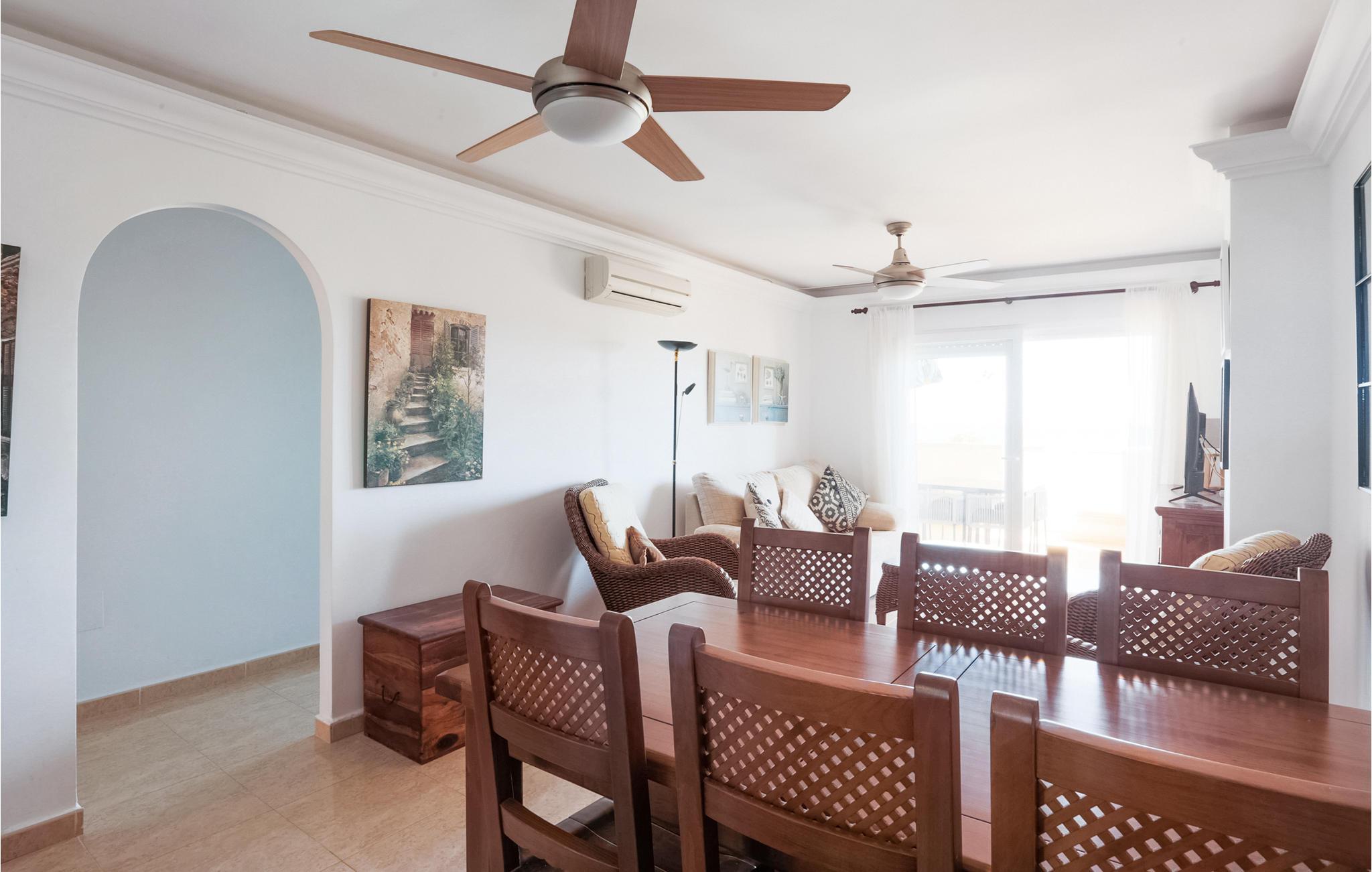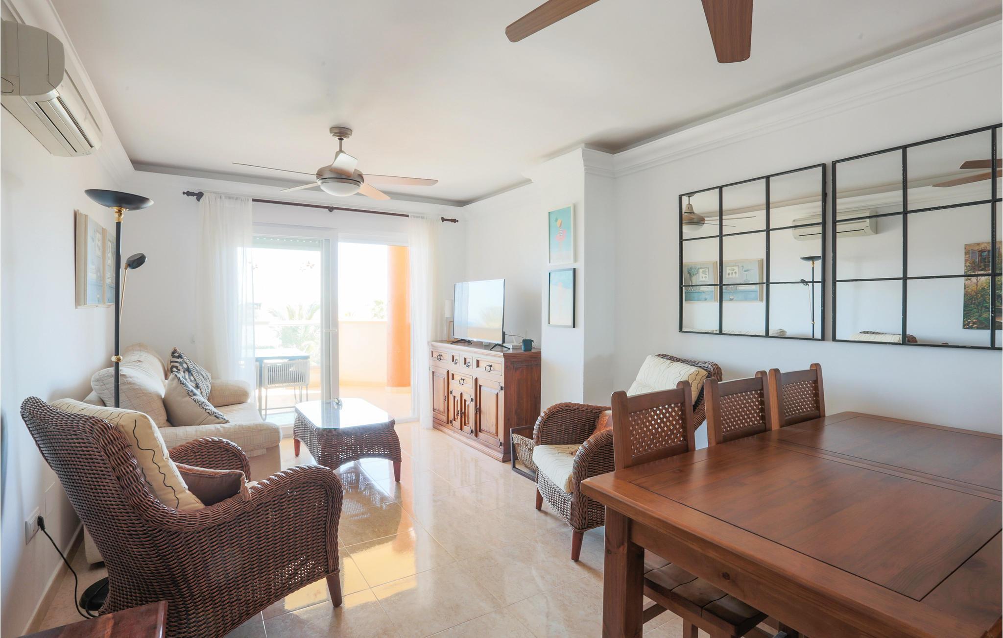 Denne lejlighed byder jer velkommen på en unik beliggenhed, for her bor I tæt på stranden i La Manga, en 21 km lang kyststrækning af Mar Menor, som adskiller Middelhavet fra Mar Menor-lagunen. I den lyse ferielejlighed med komfortable træmøbler vil I mærke en varm feel-good atmosfære. I sofaområdet kan I planlægge dagens golftur. Alle amatørkokke kan gøre magi i det store, veludstyrede køkken. Nyd jeres hjemmelavede måltid ved spisebordet eller på balkonen med en smuk udsigt over havet. Hop ind i den fælles pool eller tag ned til stranden for en svømmetur i det herlige Middelhav. Køb frisk frugt og kolde drikkevarer på vejen tilbage.