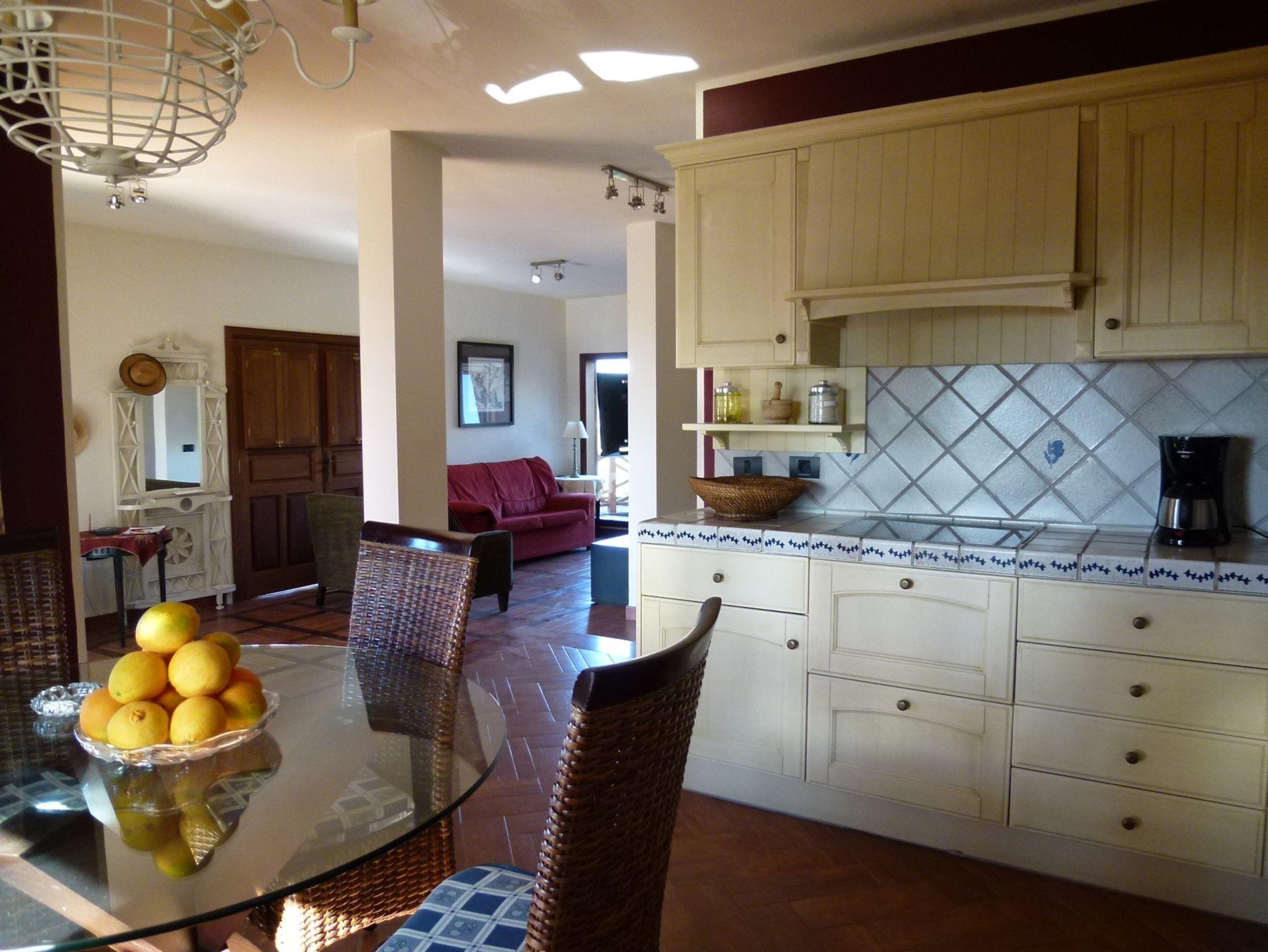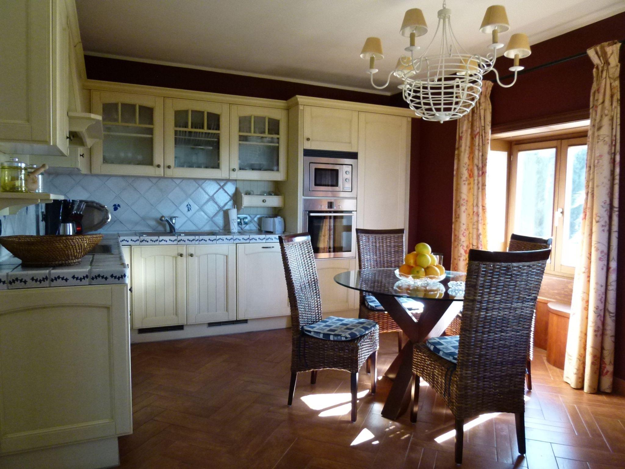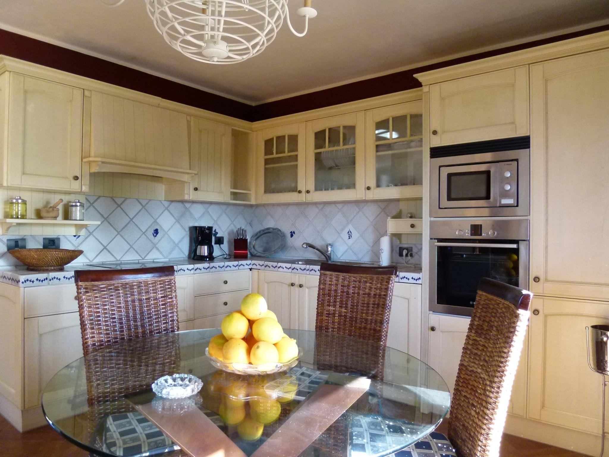 Die Küche liegt auch im Erdgeschoß des Hauses, etwas abgetrennt vom Wohnbereich. Die Küche ist sehr gut ausgestattet und bietet viel Stauraum. Ein großer Esstisch bietet den Mittelpunkt des Raumes.