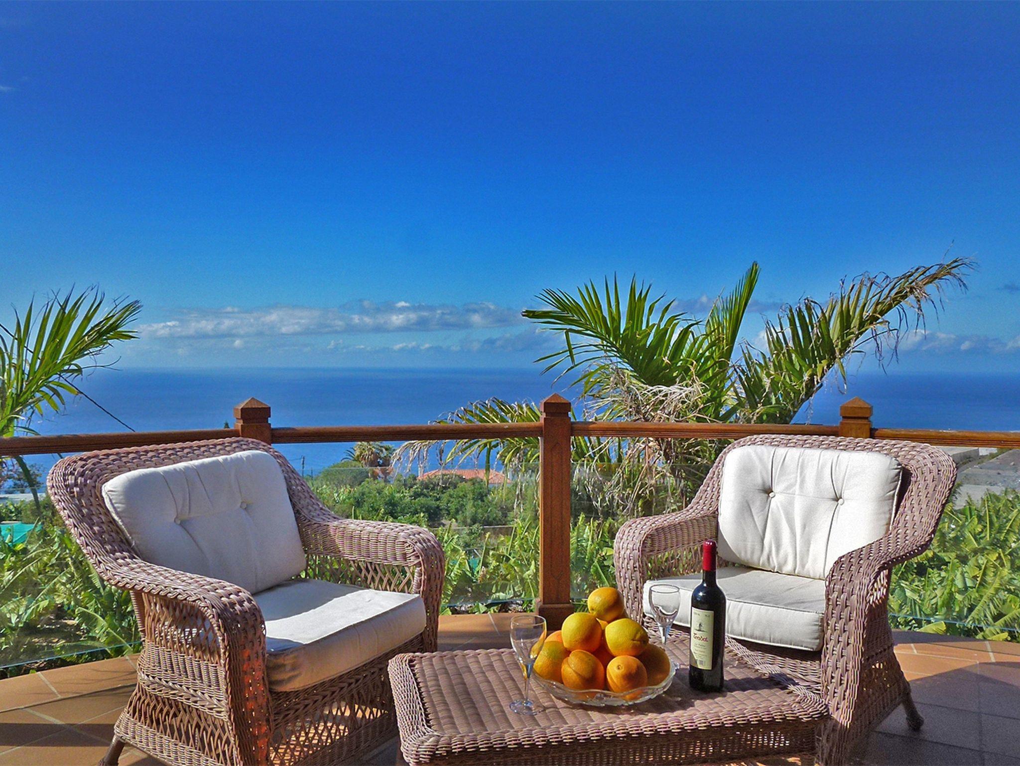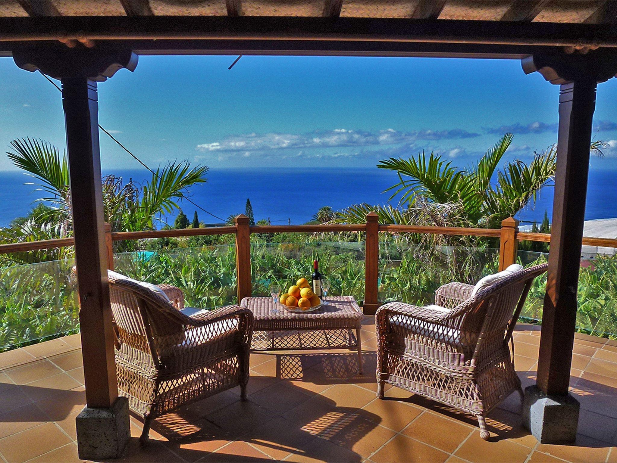 Highlight im oberen Stockwerk ist die große teilüberdachte Terrasse mit Panoramablick. Sie wurde mit hochwertigen Möbeln ausgestattet. Zwei große Sessel und ein Tisch bieten am Abend ein schönes Plätzchen um die Sonne über dem Meer unter gehen zu sehen. In dem bequemen Lesesessel läßt sich gemütlich ein Buch lesen.