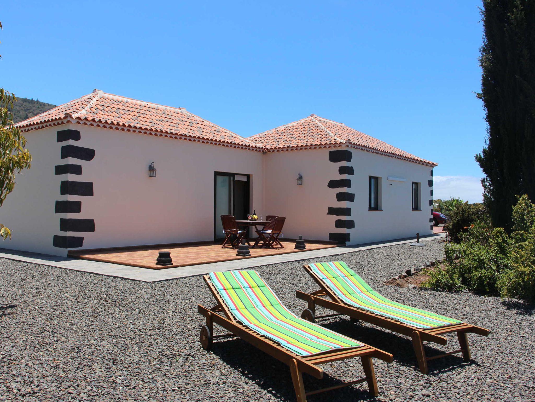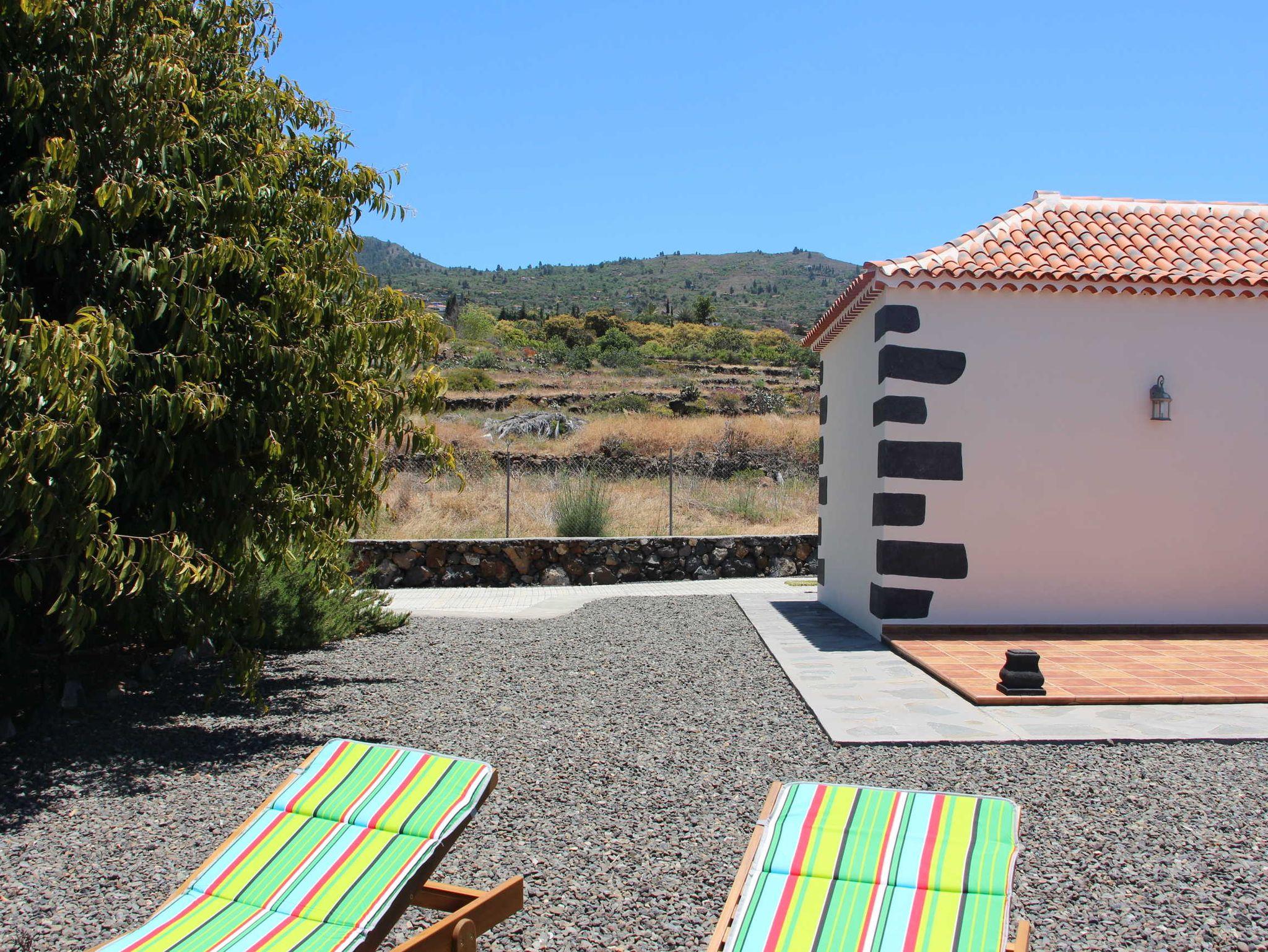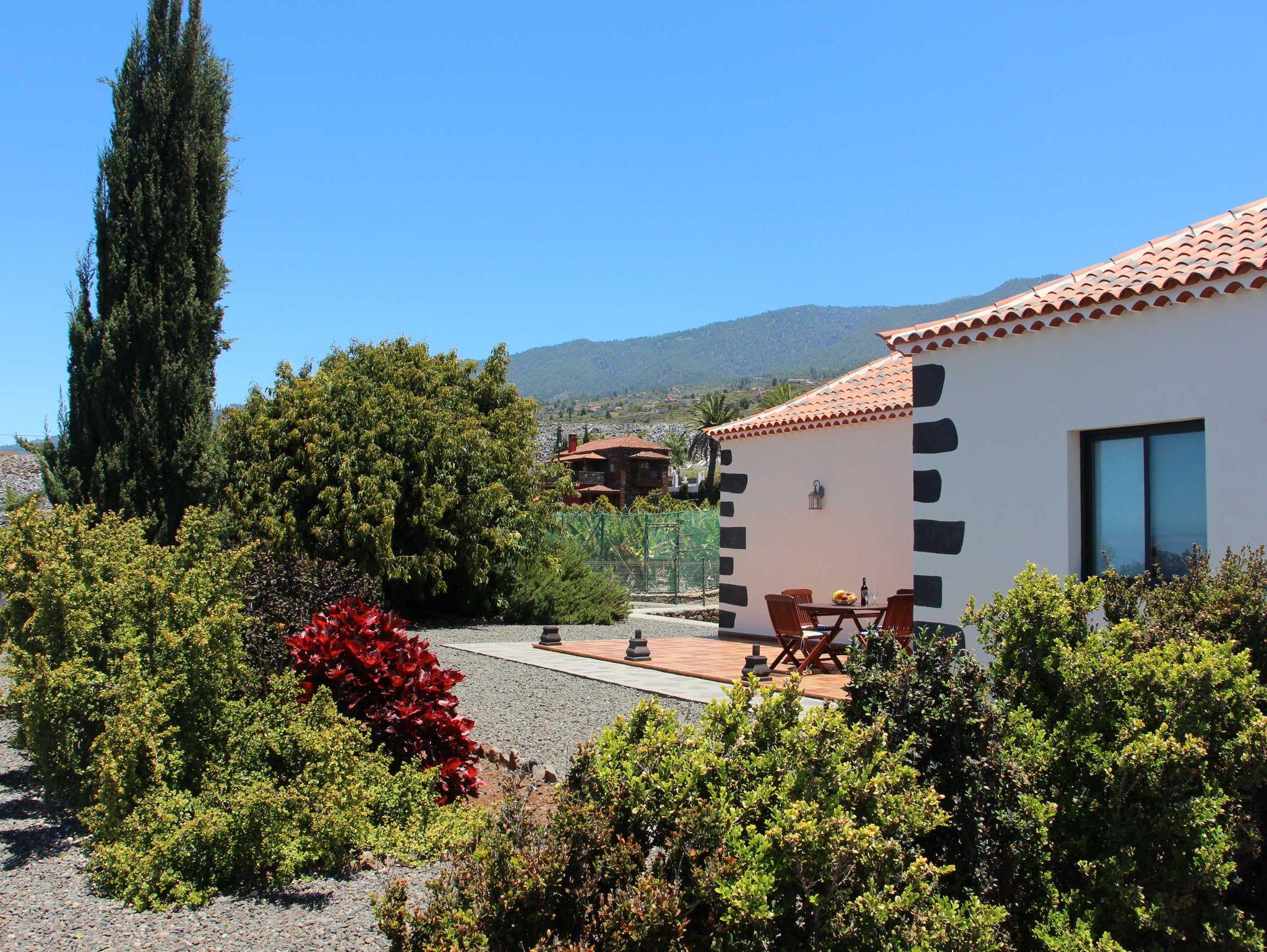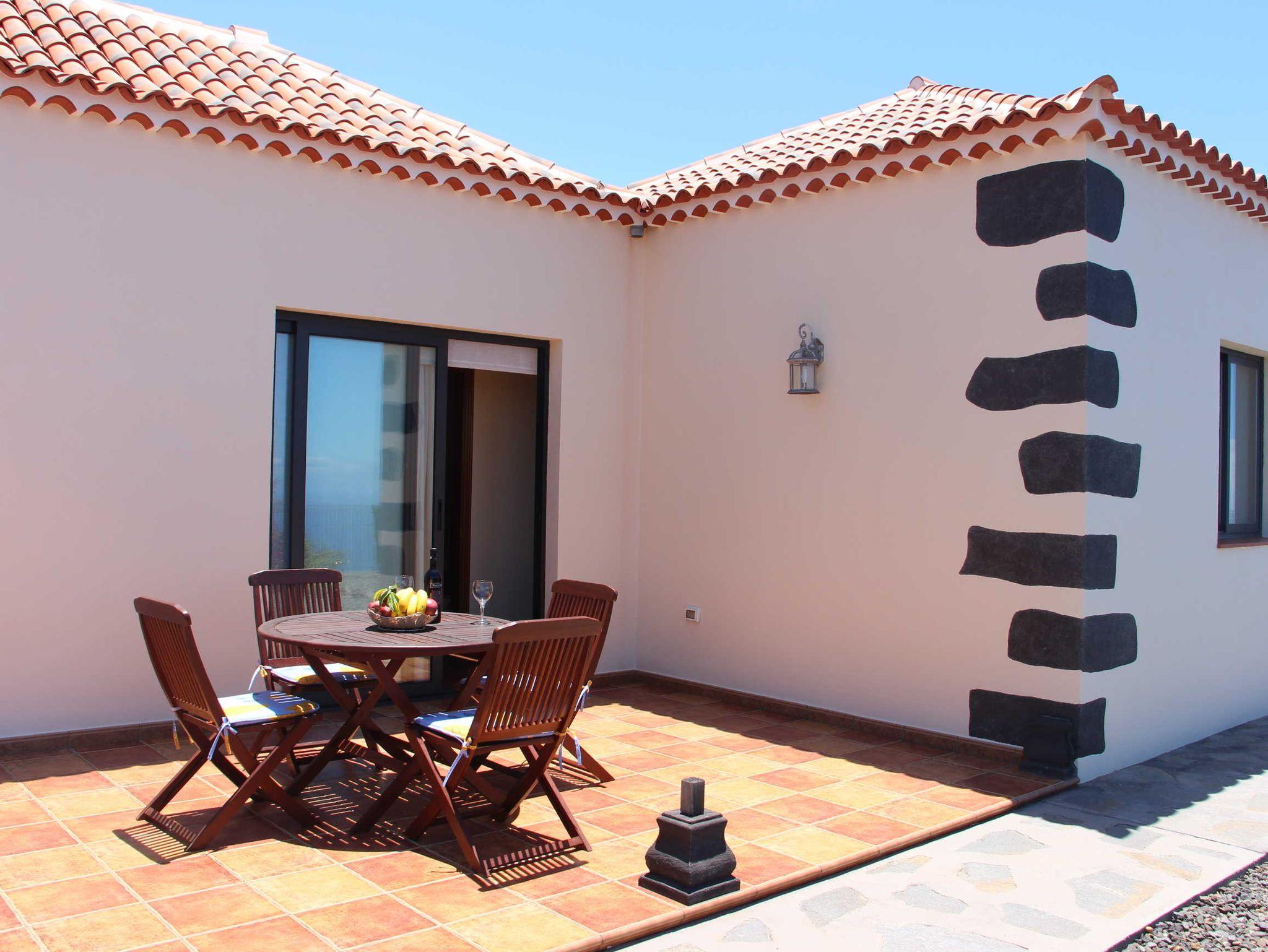 Der Garten rund um die Terrasse, die zur Meerseite liegt, wurde mit hohen Sträuchern bepflanzt, um eine angemessene Privatsphäre für die Gäste zu schaffen. Die Terrasse ist mit einem Tisch und 4 Stühlen ausgestattet. Sonnenliegen und ein Sonnenschirm sorgen für eine perfekte Ruheoase und je nach Tageszeit hat man immer Sonnen- und Schattenplätze. Im Rücken des Hauses ragt der wunderschöne Bergrücken der Caldera hervor und nach vorne hat man einen sehr schönen, freien Blick auf den Atlantik.