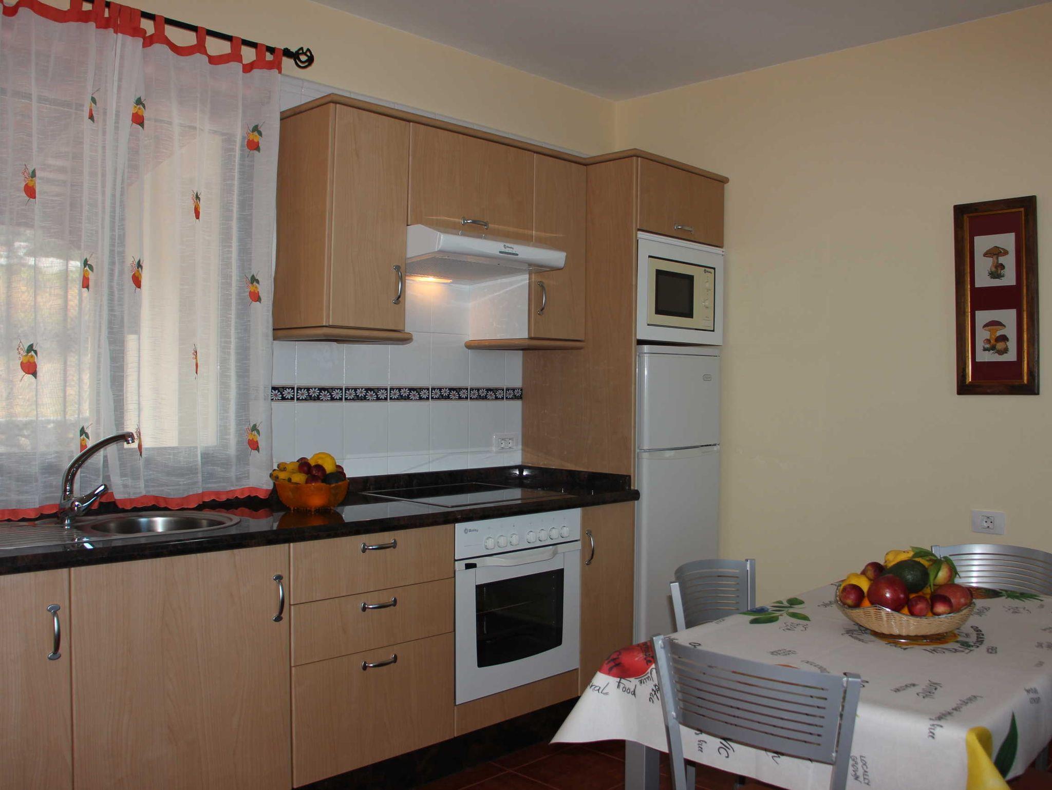 • Küchenzeile mit Ceranherd (4 Felder), Backofen, Dunstabzug, Mikrowelle, elektrische Kaffeemaschine, Cafetera, Toaster, Kühl-/Gefrierkombination