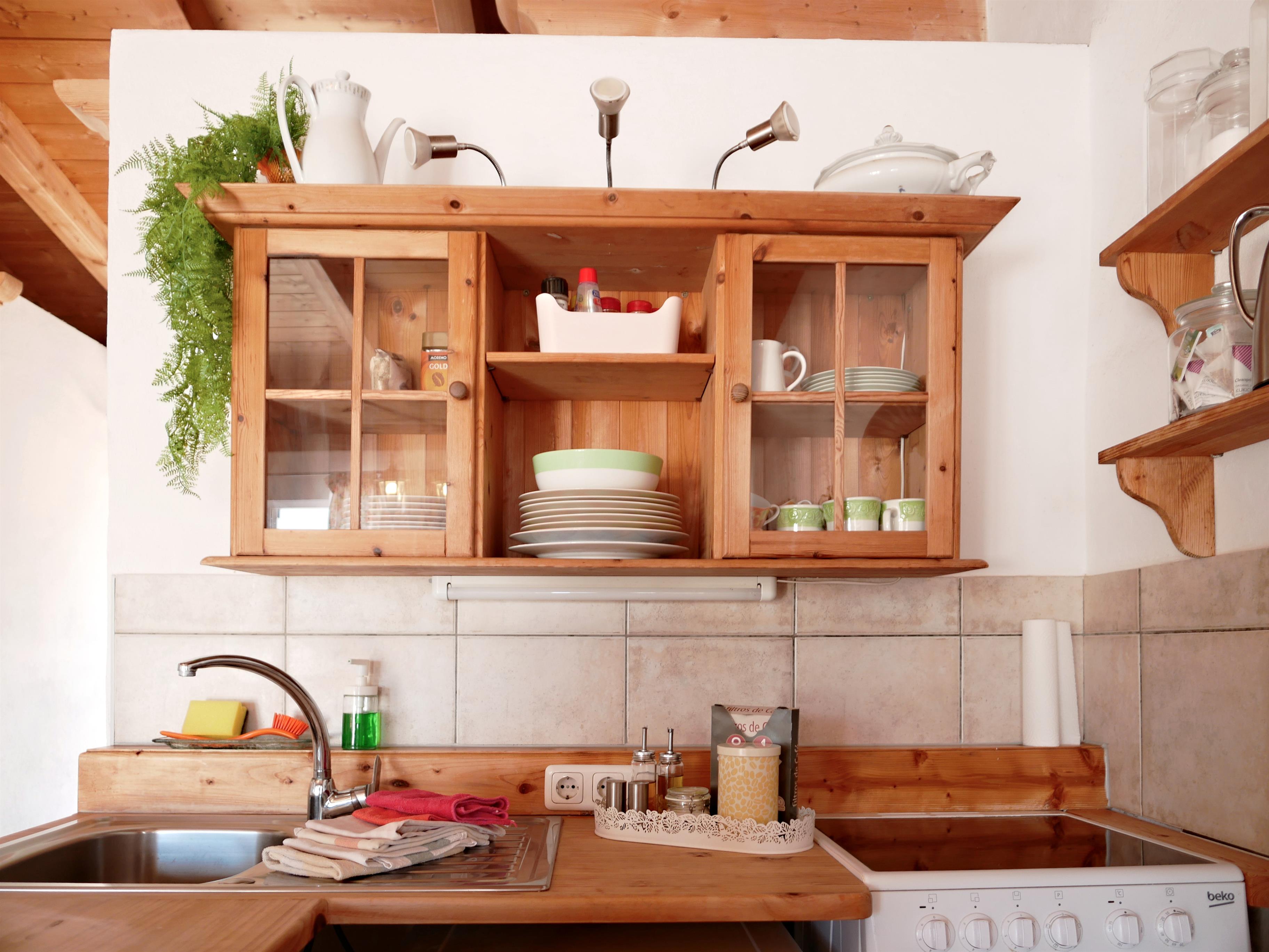 Die halboffene Küchenzeile ist ausgestattet mit Wasserkocher und Kaffeemaschine, Mixgerät, Backutensilien, Toaster und viel Geschirr und Gläser.