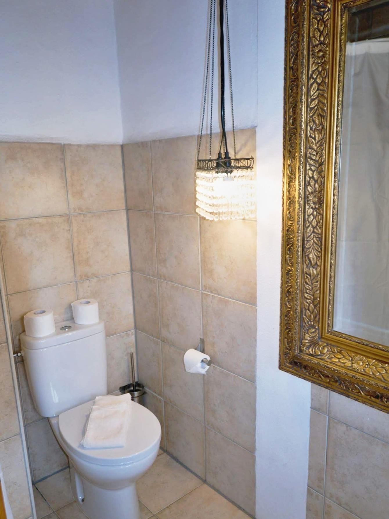 Das Bad ist ein Duschbad mit Fenster und Toilette sowie einem großen Spiegel.