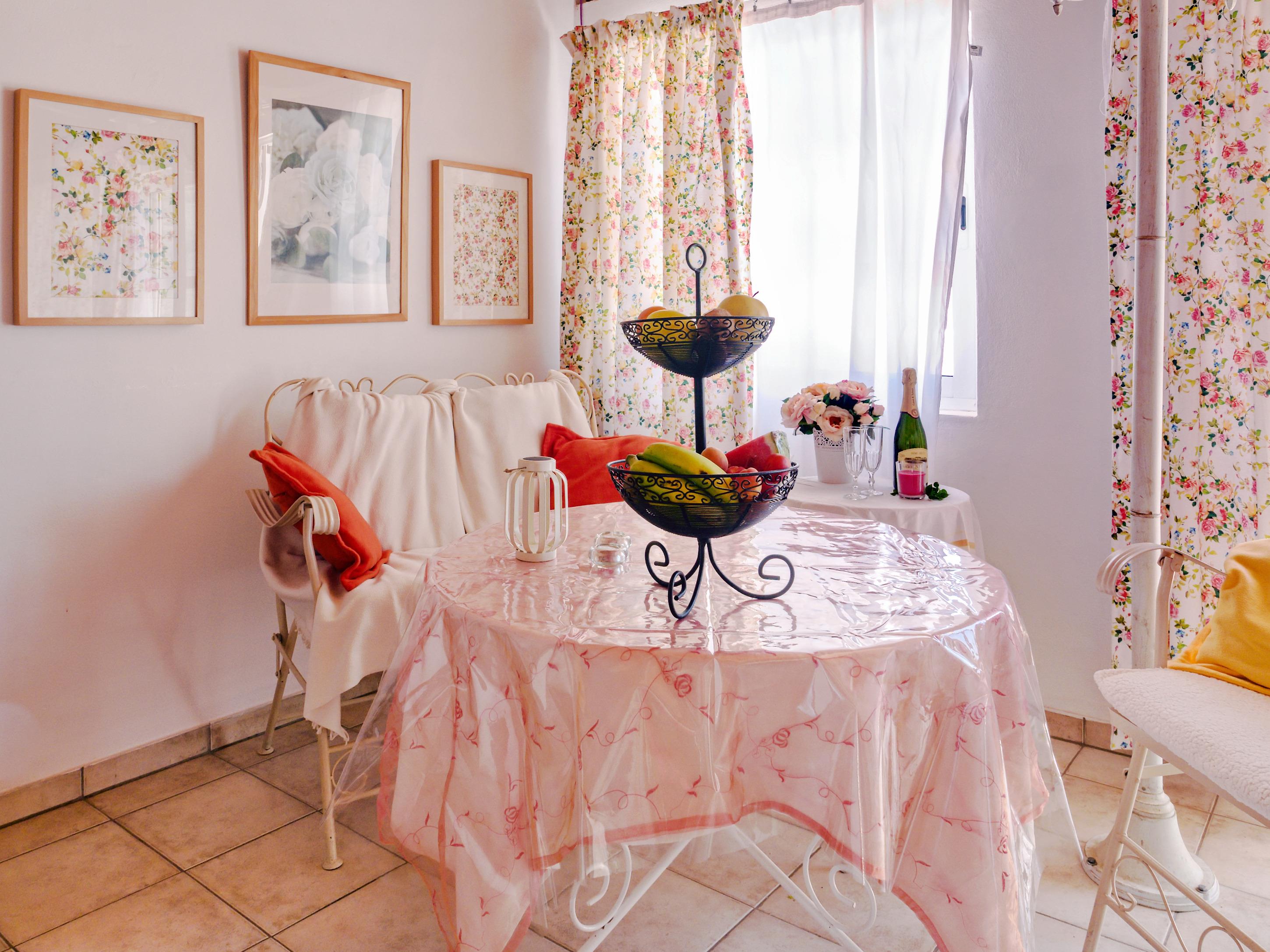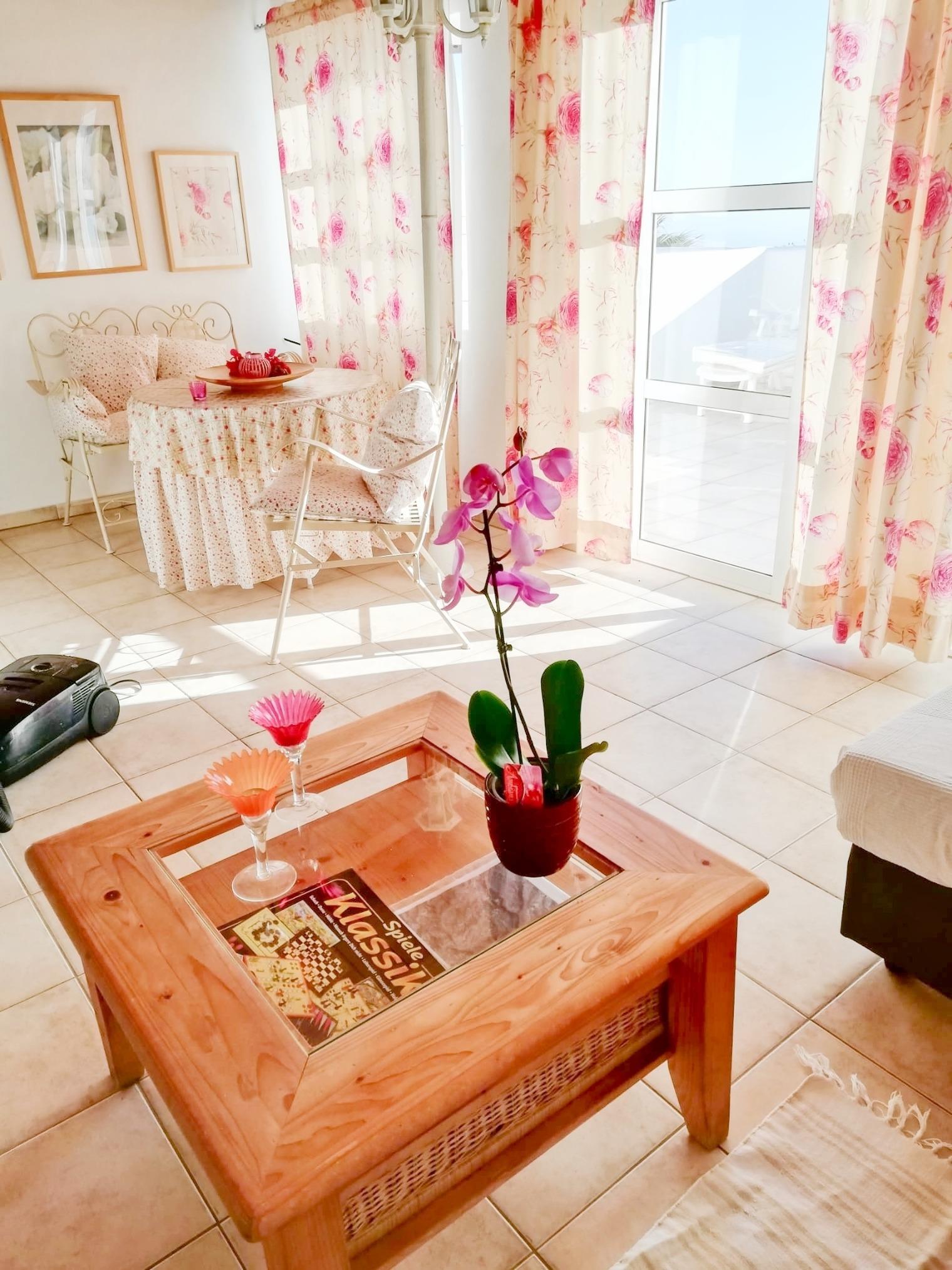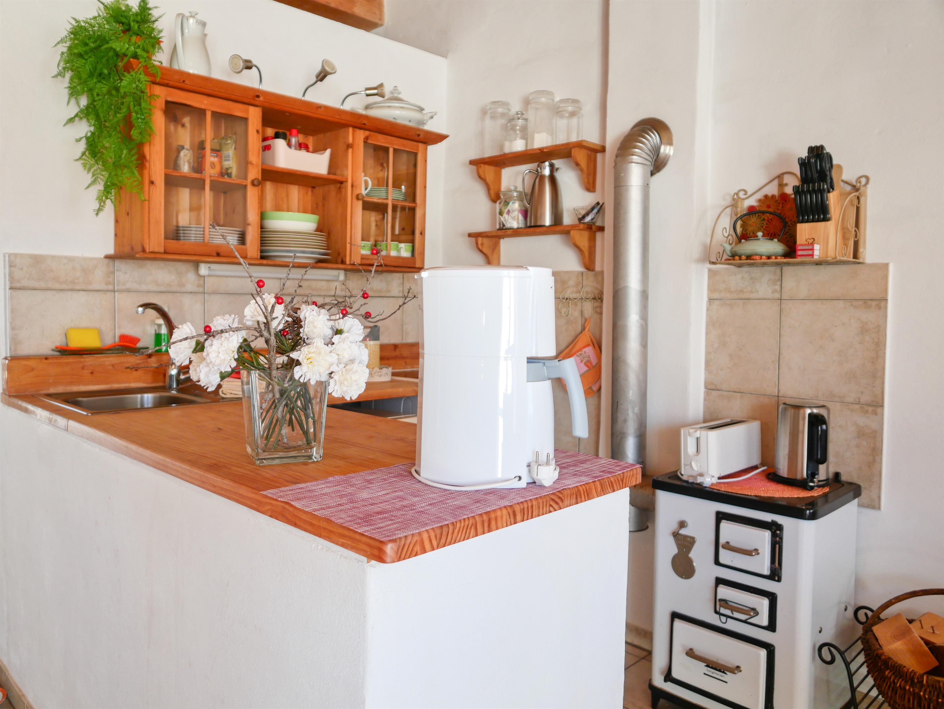 Es erwartet Sie eine voll ausgestattete, gemütliche Wohnung mit einem großzügigem Wohnbereich, einer halboffenen Küche sowie einer Essecke. Die Einrichtung ist im modernem Landhausstil gehalten mit zarten Tönen und Gardinen mit Rosenmuster, die Böden sind durchgängig gefliest. Ein Ecksofa mit ausziehbarer Funktion für den dritten Gast, ein TV Bereich mit seitlichen Vitrinen und ein großer, runder Esstisch mit Bank und Sessel am Fenster machen das Ambiente komplett. Für gemütliche Abende gibt es Bücher, Spiele und eine Stereo-Anlage. Für kältere Abende ist mit Wärme in Form eines rollbaren Gasofens oder eines alten gusseisernen Holzofen gesorgt.