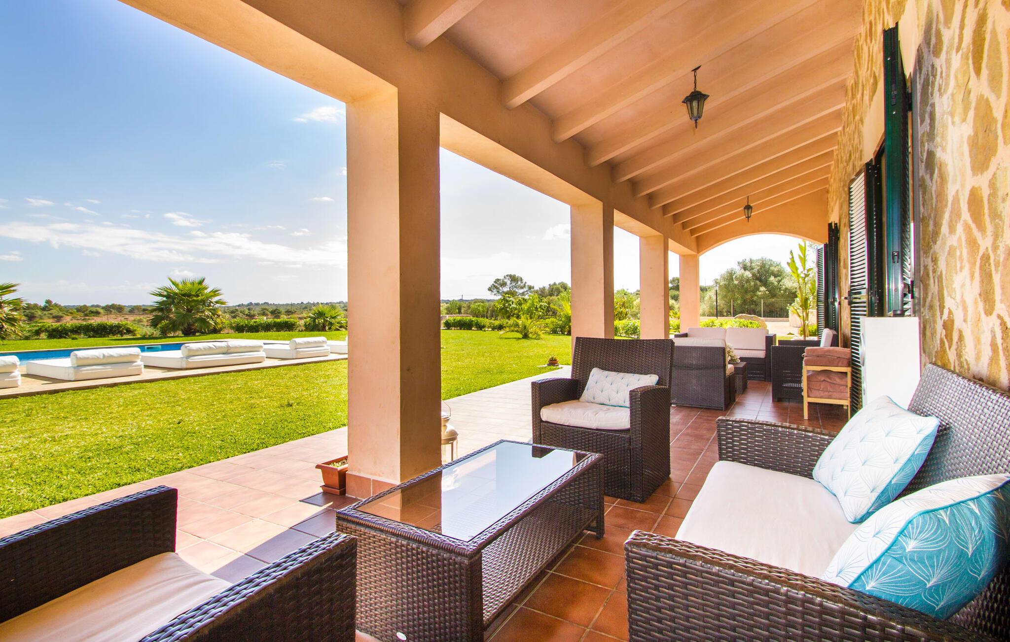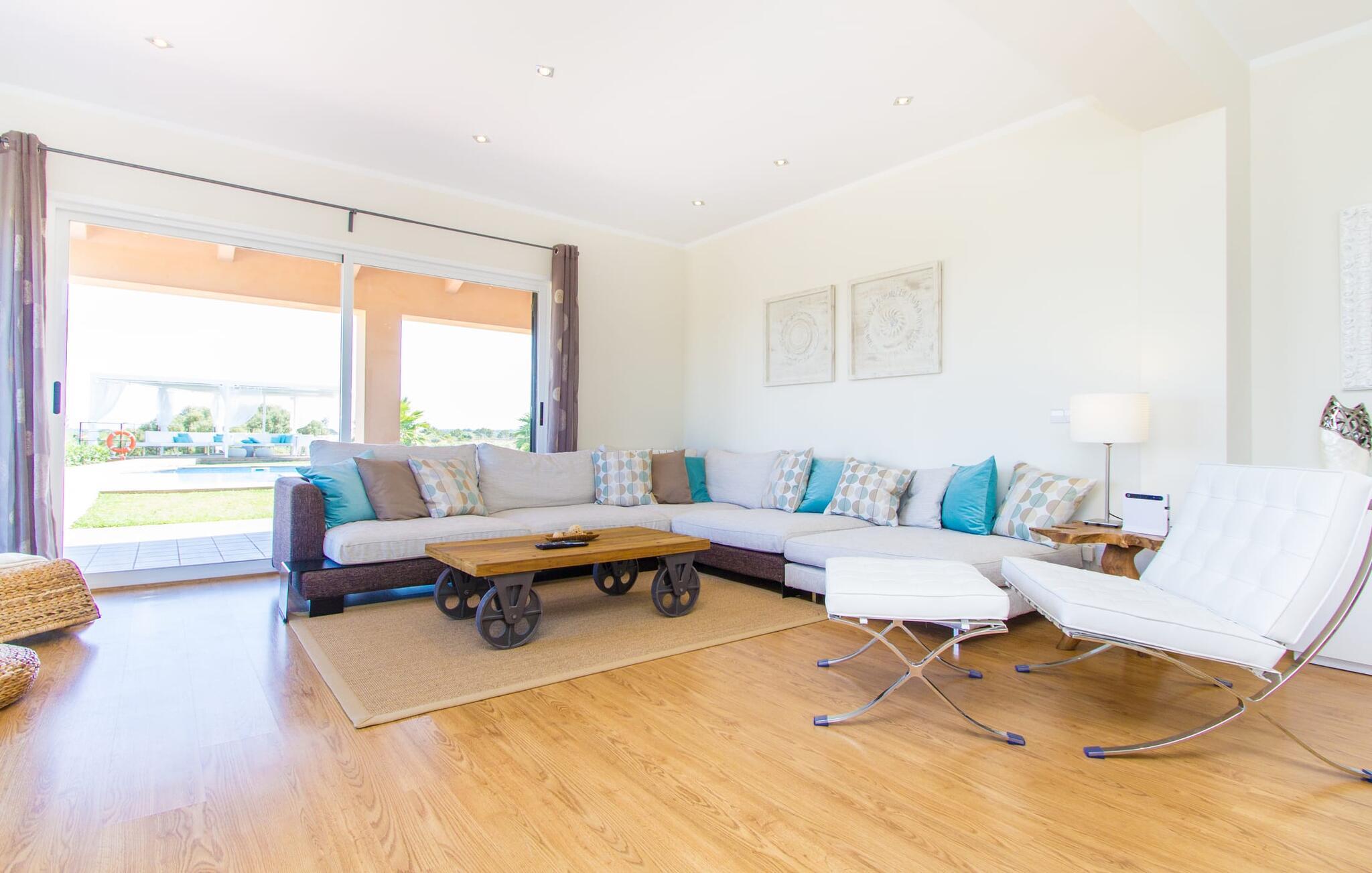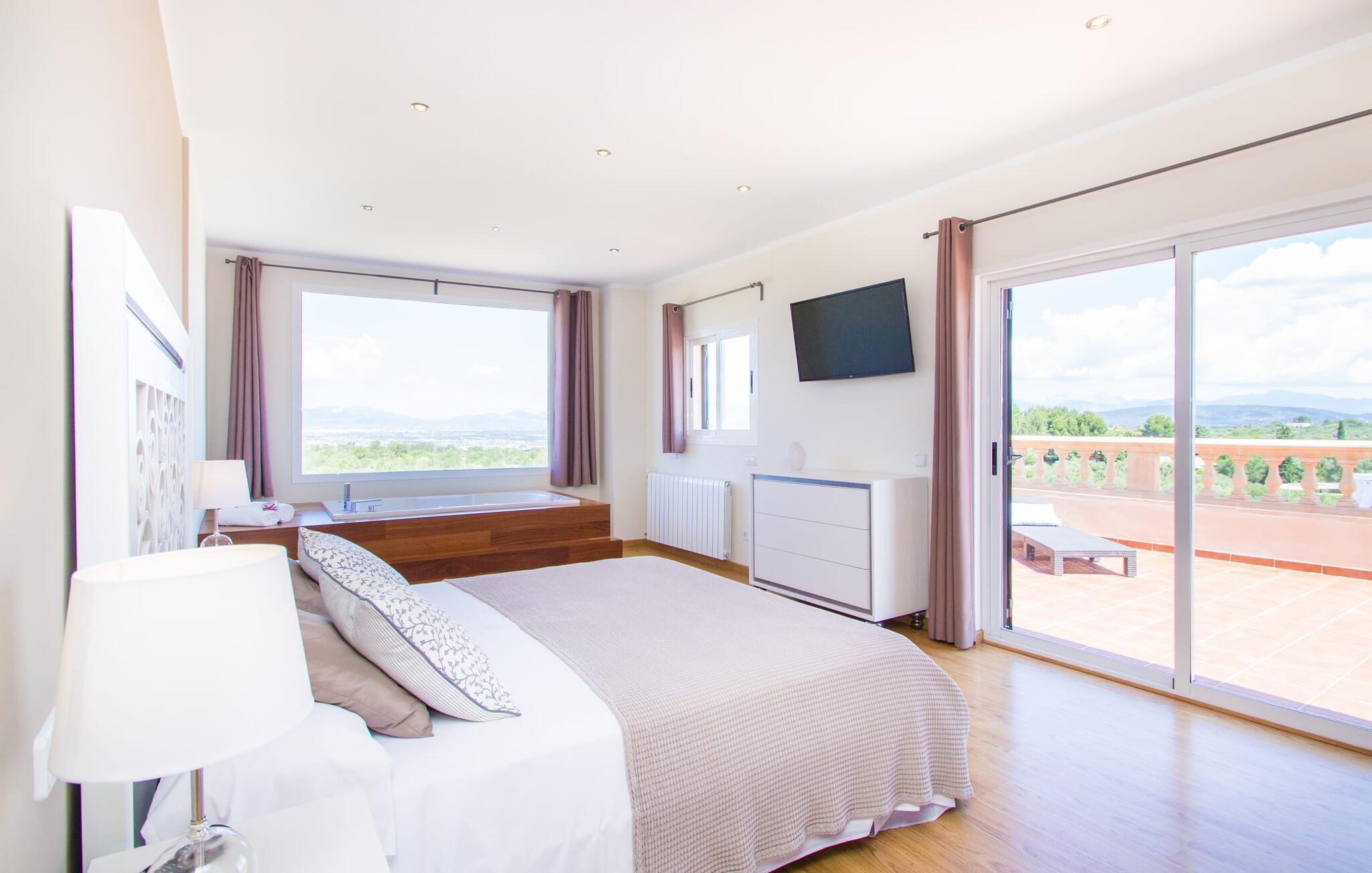 Den elegante og luksuriøse designervilla "La Tierra" ligger i landlige omgivelser med vid udsigt over sletterne til bjergene, perfekt til at opleve Mallorcas fortryllende hvide nætter. Dans barfodet over en gangbro til en stor pool, nyd cocktails i udendørsloungen eller forkæl jer selv med en beroligende boble-hydromassage i boblebadet. Villaen har en tagterrasse, der tilbyder rolige steder at slappe af under parasoller eller tilberede snacks på en mobil elektrisk grill. Deltag i aktiviteter som basketball for at forblive aktiv. Parkeringspladser og to garager er tilgængelige på stedet. Villaen har unik arkitektur, store vinduer og et moderne køkken udstyret med side-by-side køleskab og et langt spisebord, perfekt til hyggelige brunch. Med stilfulde værelser og eget badeværelse med regnbruser er denne villa et ideelt tilflugtssted for bryllupsrejser, komplet med et indbygget insektnetsystem til fredelige nætter. Villaen “La Tierra” ligger kun 2 km fra landsbyen Sant Jordi med sine indkøbsmuligheder og kun 13 km fra lufthavnen. Efter blot 20 km når I portene til Palma, som er ideel for dem, der elsker kontrasterne i naturen og komfort med bykultur, shopping, natteliv og adgang til fremragende strande. Bemærk venligst, at denne ejendom ikke accepterer ungdomsgrupper eller polterabender. En ungdomsgruppe på denne ejendom består af personer på 26 år eller derunder. Book ikke denne ejendom, hvis I er en ungdomsgruppe eller polterabend, da jeres reservation vil blive afvist, når den er booket, hvilket også kan være tilfældet ved ankomst til ejendommen eller under jeres ophold, og I vil ikke modtage en refusion