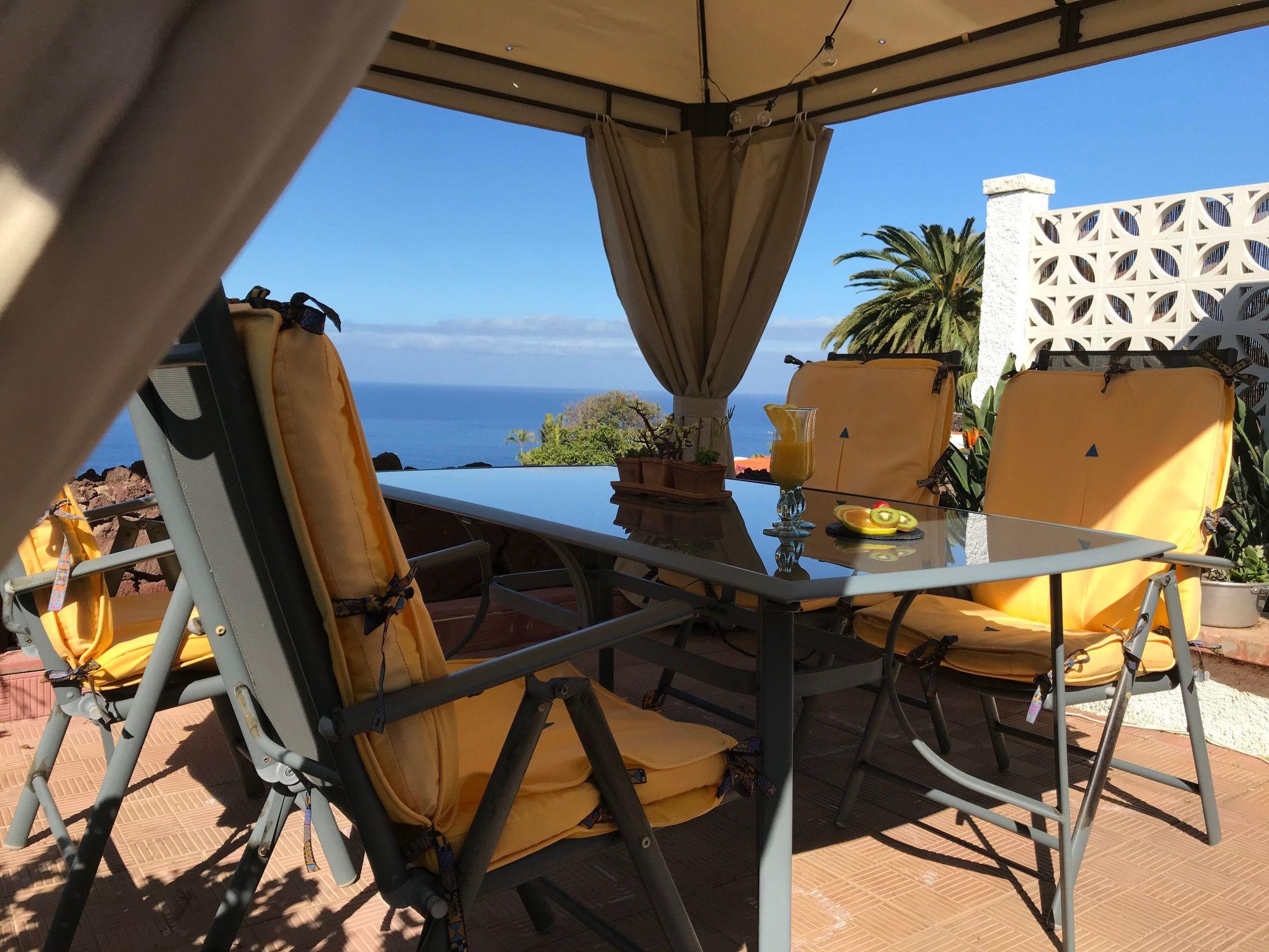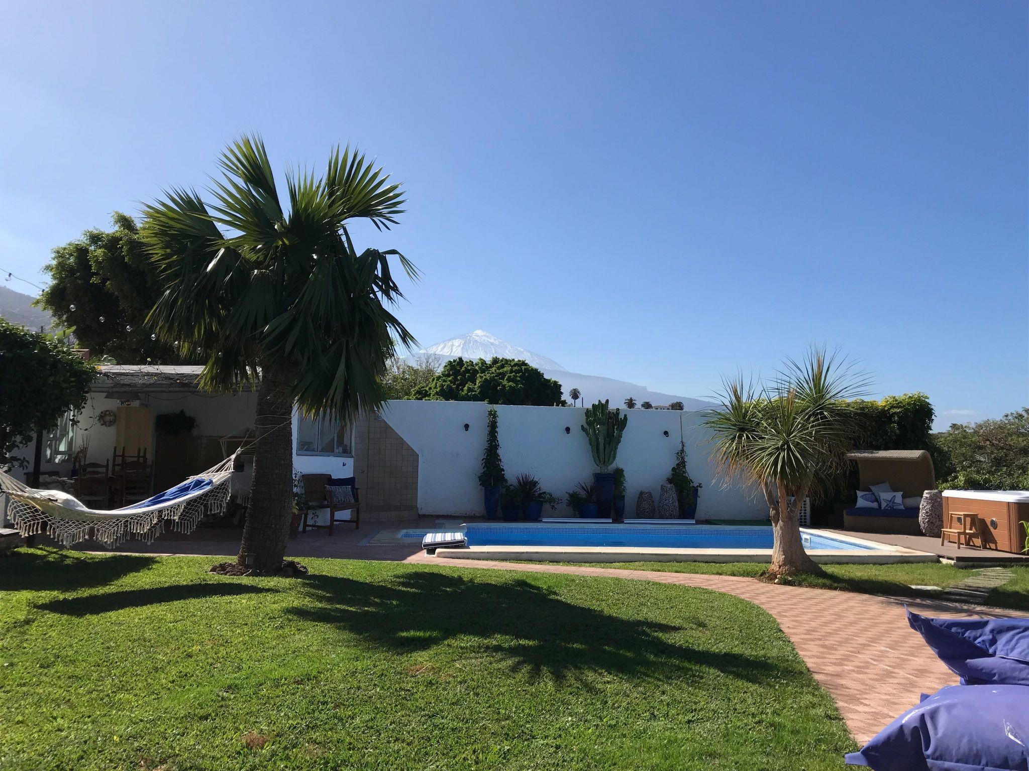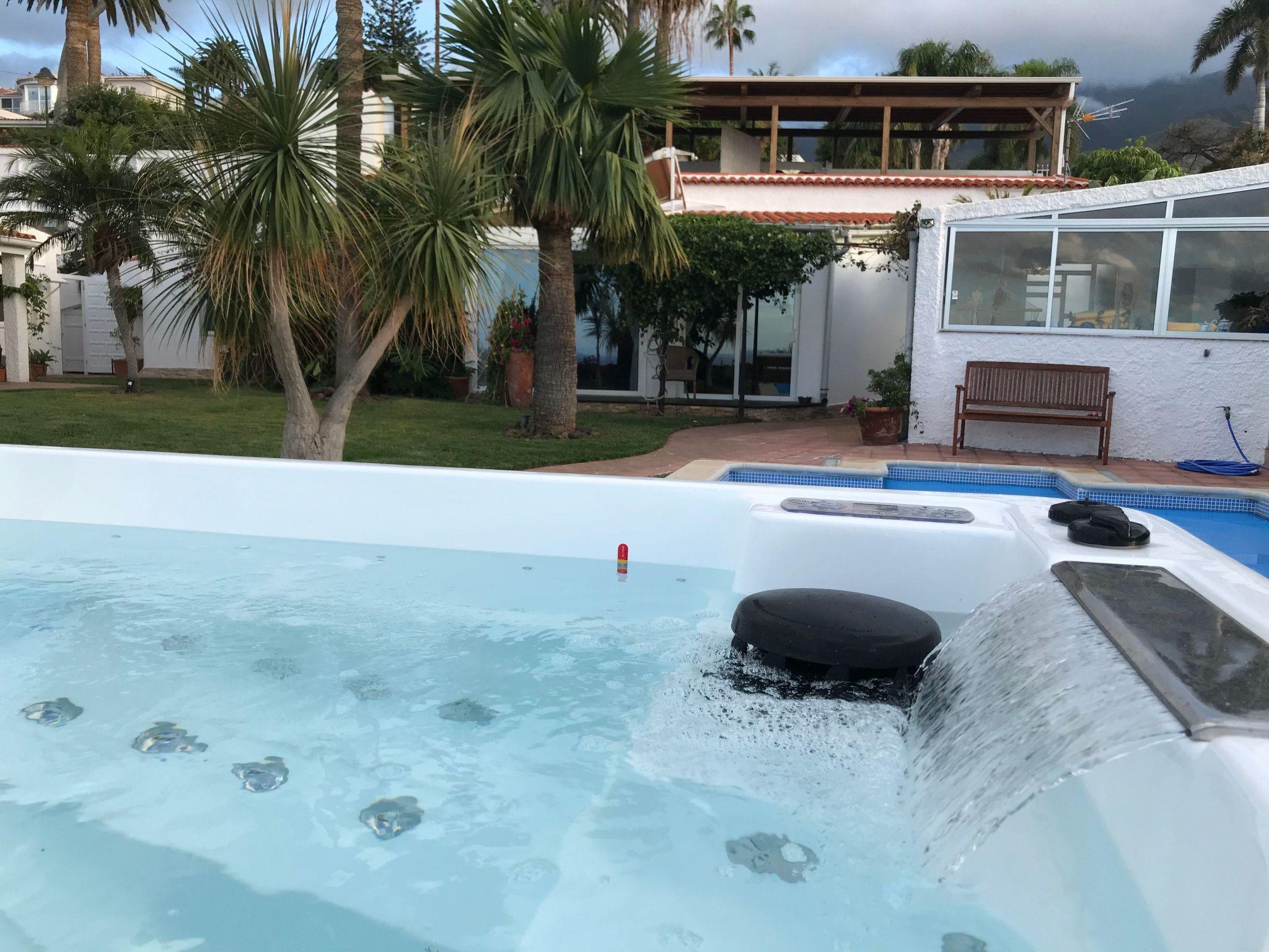 The 400 square metre garden has a private swimming pool. Next to it up to six sunbeds and sunshades with pool towels. The Patio is a room open to the garden, prepared as a dining room for six people and with an inside toilet. The Mirador del Atlántico is located in a corner of the garden and overlooks the ocean and Mount Teide. It has a table and six chairs. The barbecue is mobile and can be used at various points in the garden. The jacuzzi is located next to the pool.