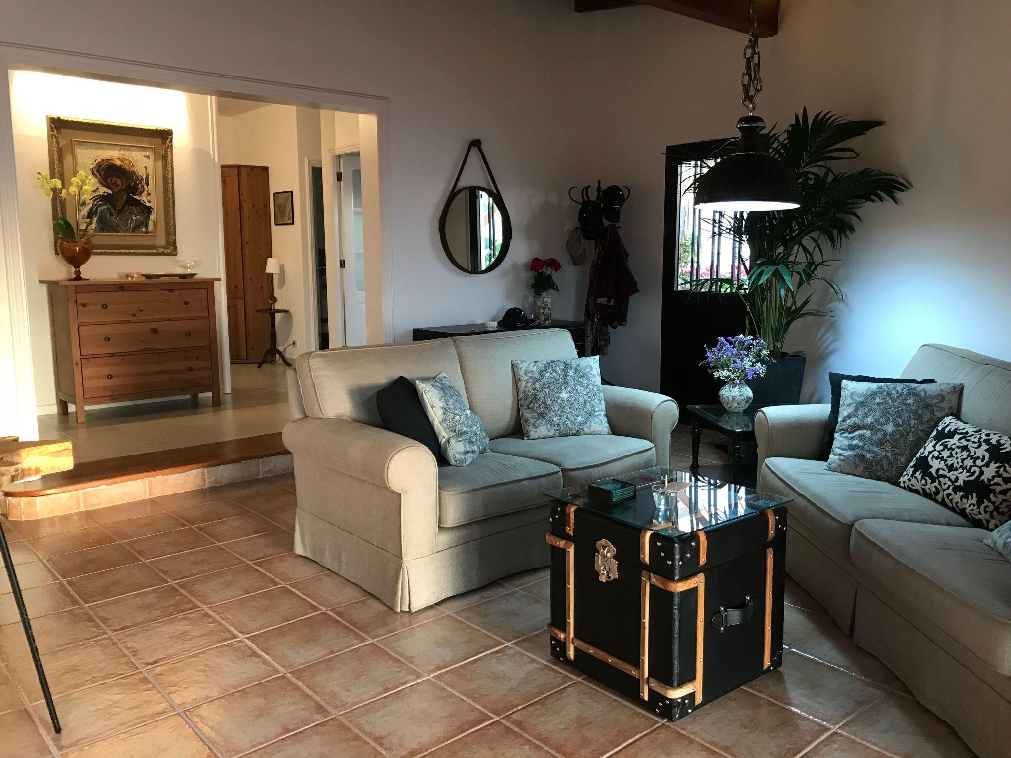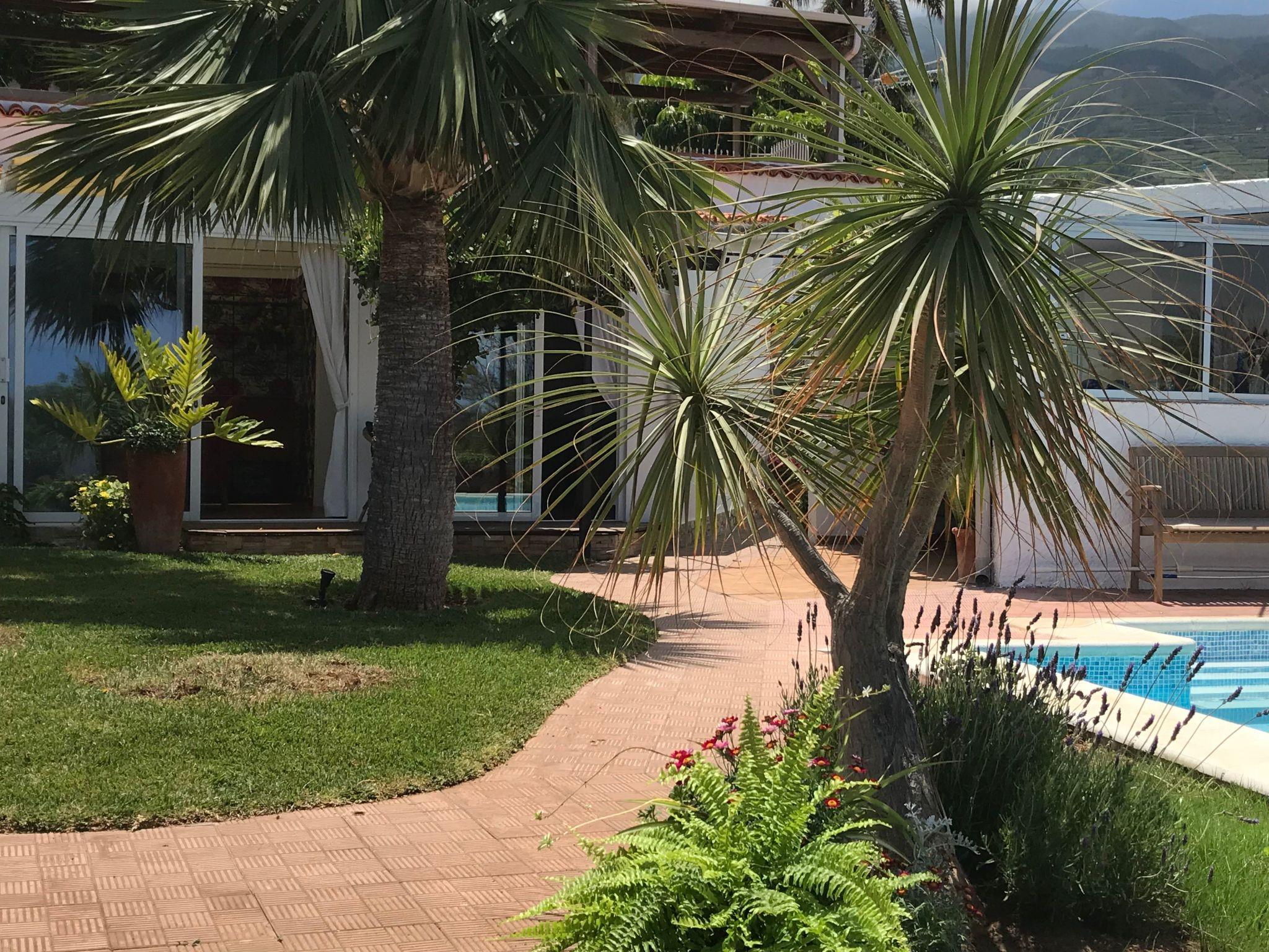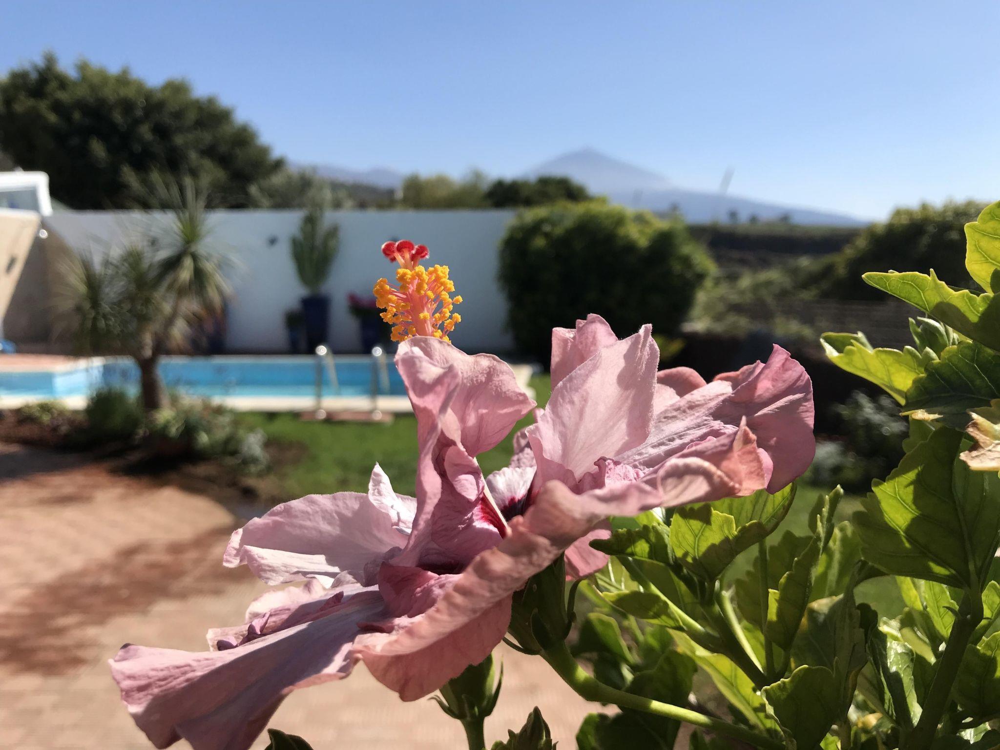 The 400 square metre garden has a private swimming pool. Next to it up to six sunbeds and sunshades with pool towels. The Patio is a room open to the garden, prepared as a dining room for six people and with an inside toilet. The Mirador del Atlántico is located in a corner of the garden and overlooks the ocean and Mount Teide. It has a table and six chairs. The barbecue is mobile and can be used at various points in the garden. The jacuzzi is located next to the pool.
