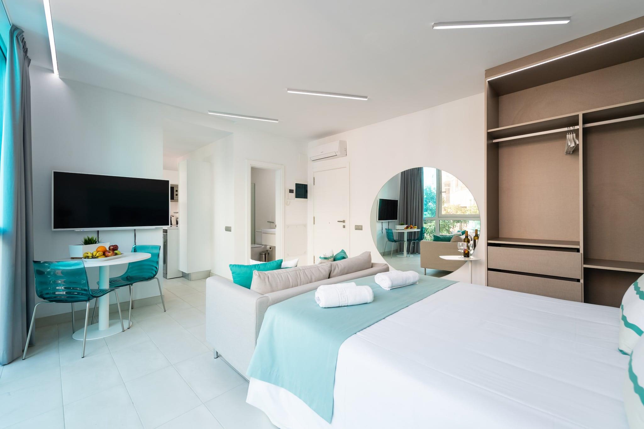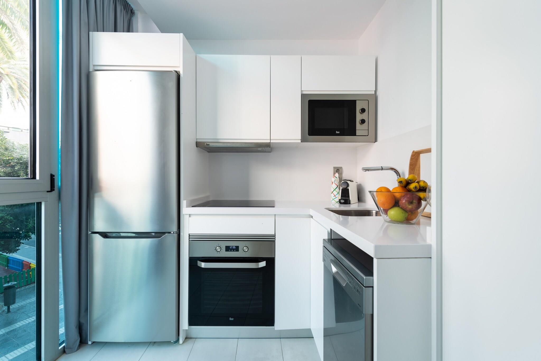 Oplev pulserende øbo i denne smukt møblerede 1-værelses lejlighed, perfekt beliggende i hjertet af Las Palmas de Gran Canaria. Kun 200 meter fra Playa Las Canteras gyldne sand er dette moderne 28 m² store oase ideelt for et par, der søger komfort, bekvemmelighed og nærhed til havet. Omgivet af en række restauranter, caféer som "Chocolat" og lokale butikker, vil du nyde en livlig kvarterstemning kun få skridt fra din dør. På trods af sin kompakte størrelse er lejligheden fuldt udstyret til et ubekymret ophold. Det har et hyggeligt opholdsrum i åbent plan med højhastigheds-Wi-Fi, aircondition og et fladskærms-tv til din underholdning. Det velindrettede køkken inkluderer en keramisk kogeplade, mikroovn, ovn, køleskab, opvaskemaskine og væsentlige redskaber - perfekt til at tilberede måltider med lokale råvarer fra nærliggende markeder som Superdino og Spar. En vaskemaskine og tørretumbler er også tilgængelige, hvilket tilføjer ekstra bekvemmelighed for længere ophold. Uanset om du planlægger en strandferie, arbejder på afstand med havudsigt eller udforsker de kulturelle perler på Gran Canaria, tilbyder dette centralt beliggende hjem den perfekte base. Med parker, golfbaner og naturreservater inden for rækkevidde - og hurtig adgang til lufthavnen - vil du være ideelt placeret til at opleve både afslapning og eventyr på denne smukke ø.