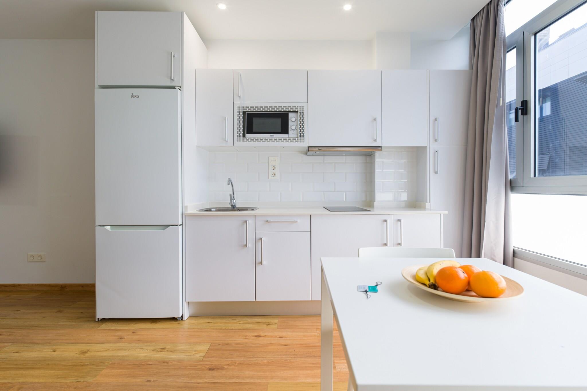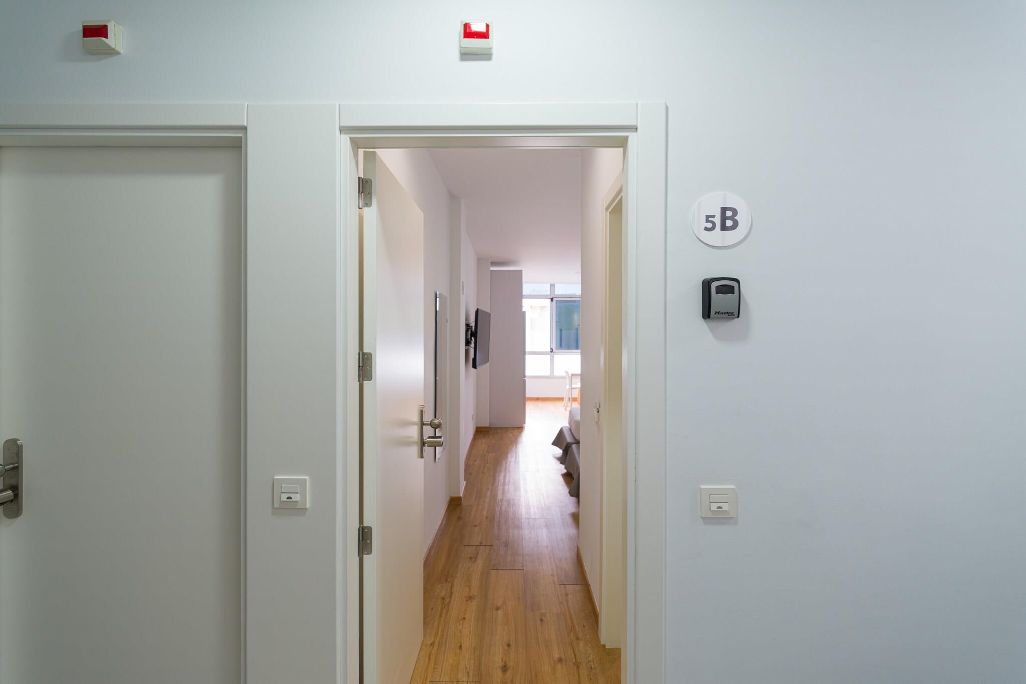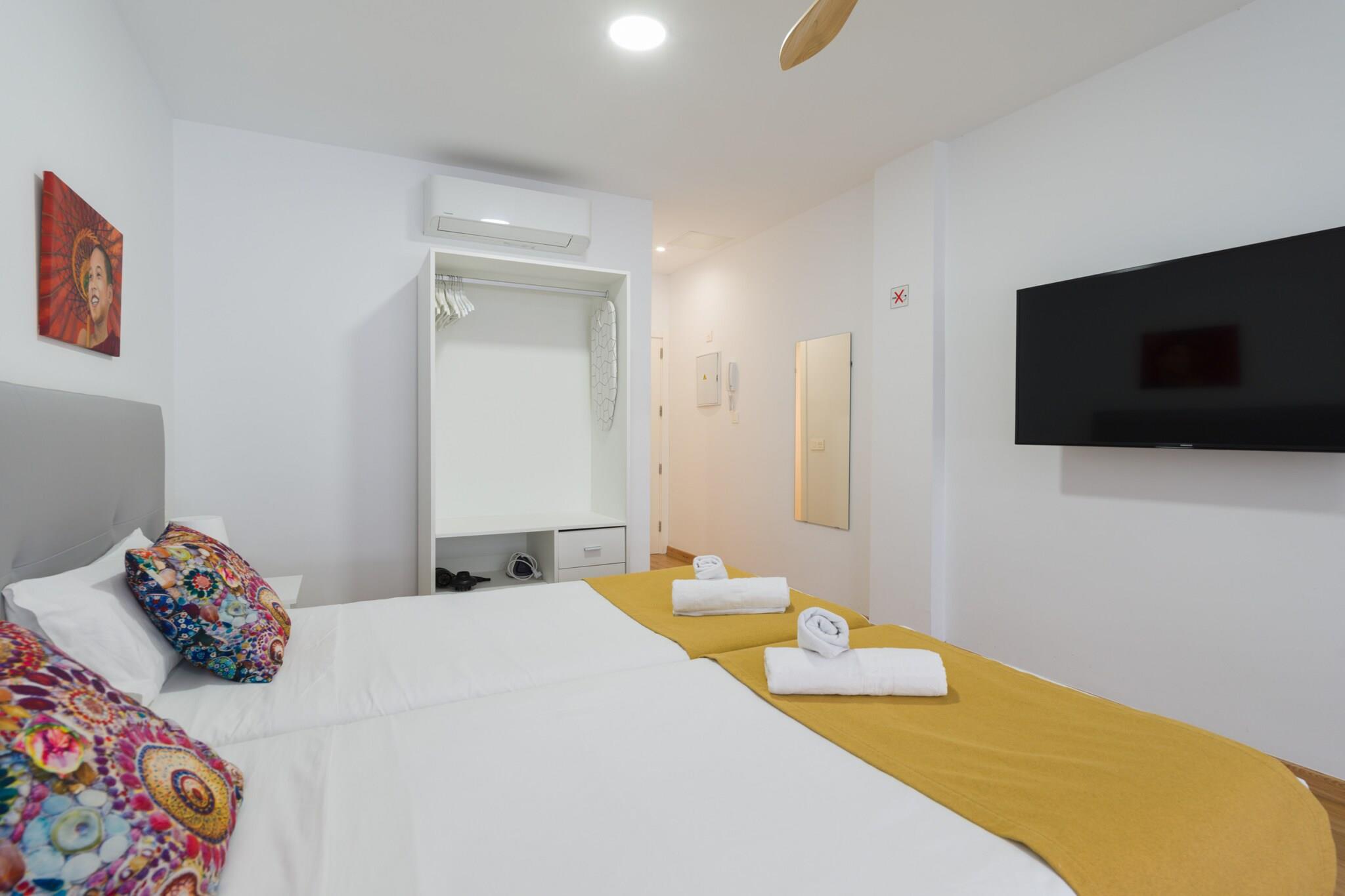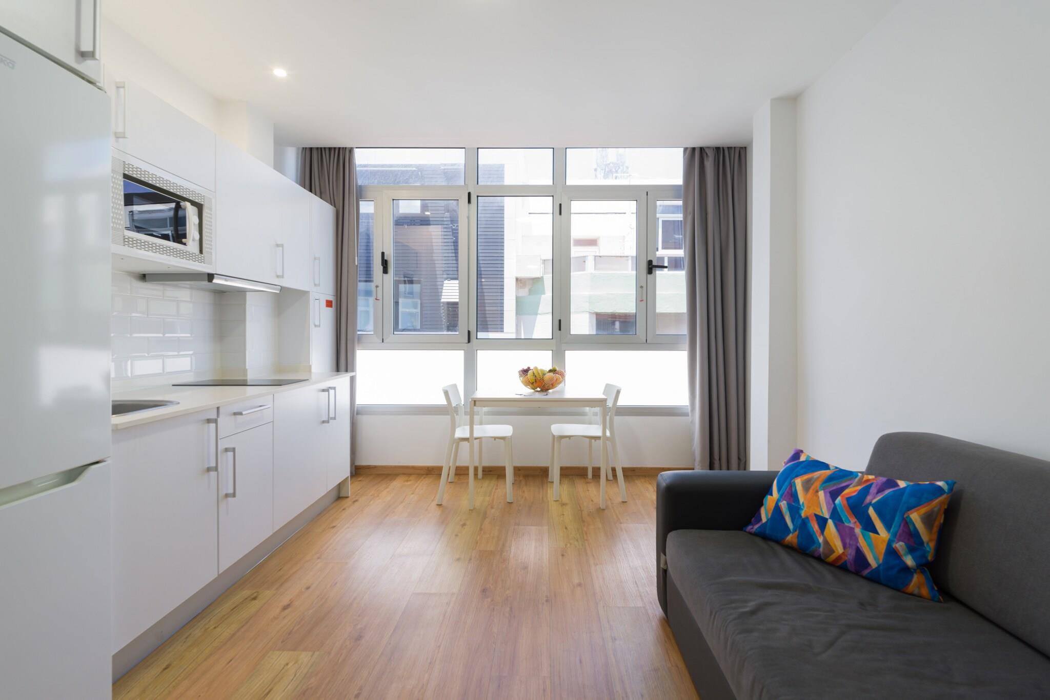 Velkommen til denne hyggelige og moderne lejlighed ved stranden i Las Palmas de Gran Canaria, det perfekte feriested ved havet for par eller solorejsende. Med 35 m² komfortabelt boligareal ligger denne charmerende lejlighed kun 25 meter fra den ikoniske Playa de Las Canteras, og tilbyder direkte adgang til stranden og en livlig promenade fyldt med restauranter, butikker og lokal charme. Lejligheden er smagfuldt indrettet og har alt hvad du behøver for et ubekymret ophold. Det åbne køkken er udstyret med en induktionskogeplader, mikroovn, køleskab, kaffemaskine, brødrister og kedel - ideel til at tilberede lette måltider og snacks. Efter en dag i solen kan du slappe af i det kølige, airconditionerede interiør med et fladskærms-tv, gratis Wi-Fi og en ventilator for at sikre komfort under hele dit ophold. Et strygejern og hårtørrer er også til rådighed for din bekvemmelighed. Beliggende i et livligt og eftertragtet kvarter ved stranden, placerer denne lejlighed dig få skridt fra havet og få øjeblikke fra al den lokale handling. Uanset om du nyder en morgensvømning, fanger solnedgangen over Atlanten eller udforsker de kulturelle højdepunkter i Las Palmas, er alt inden for rækkevidde. Perfekt placeret og veludstyret, denne lejlighed ved vandet tilbyder den ideelle base for din ferie på Gran Canaria.