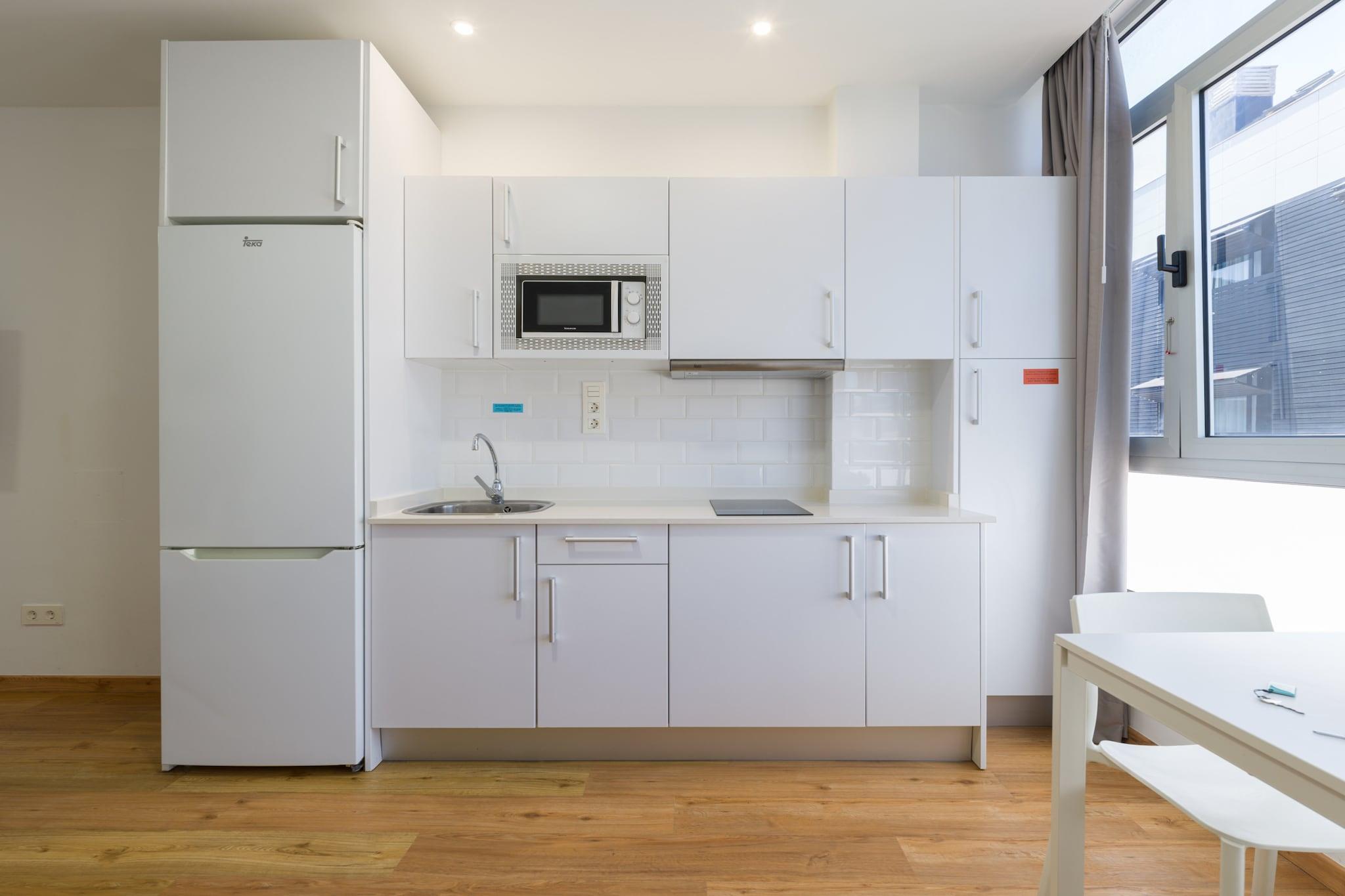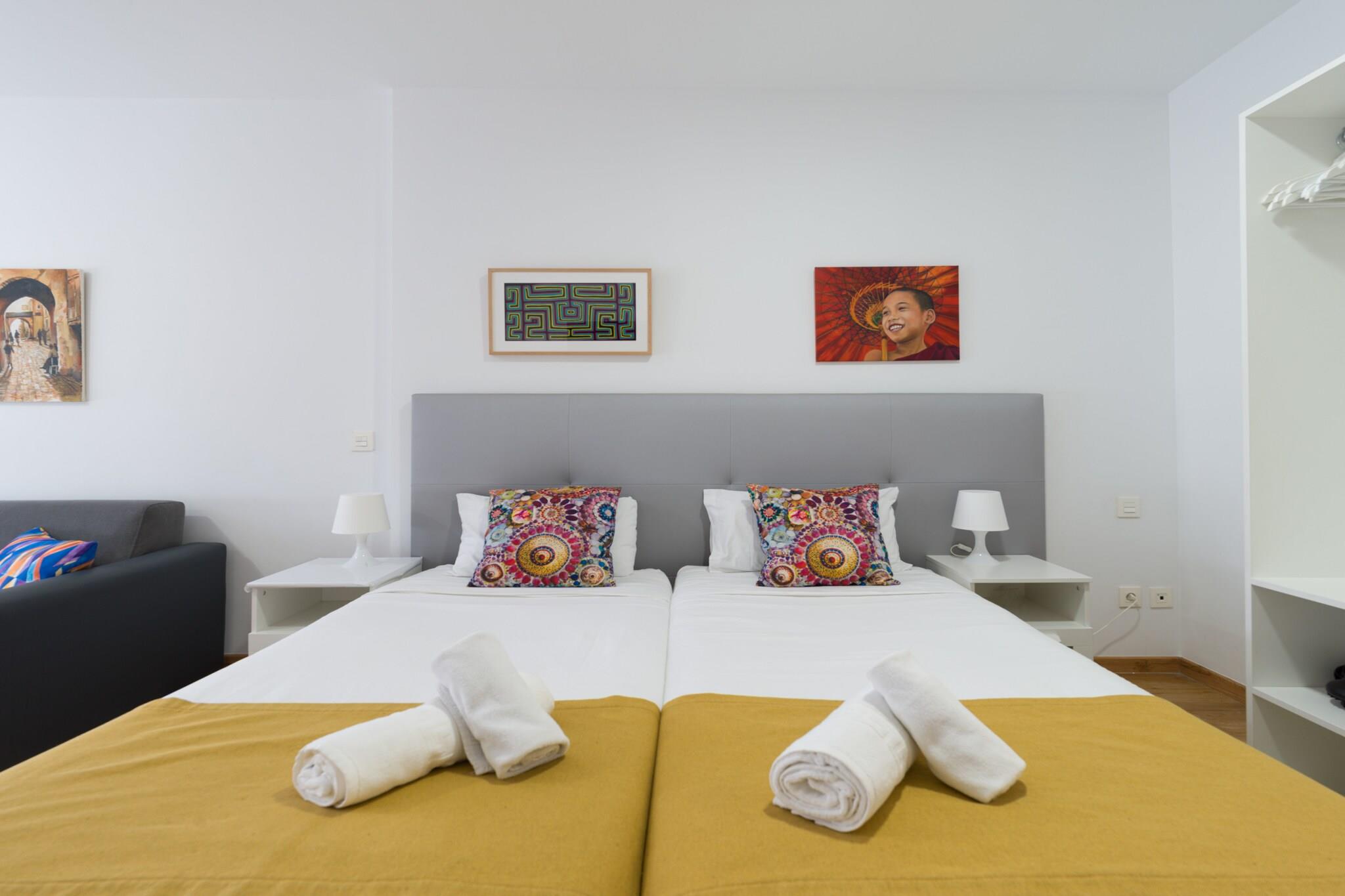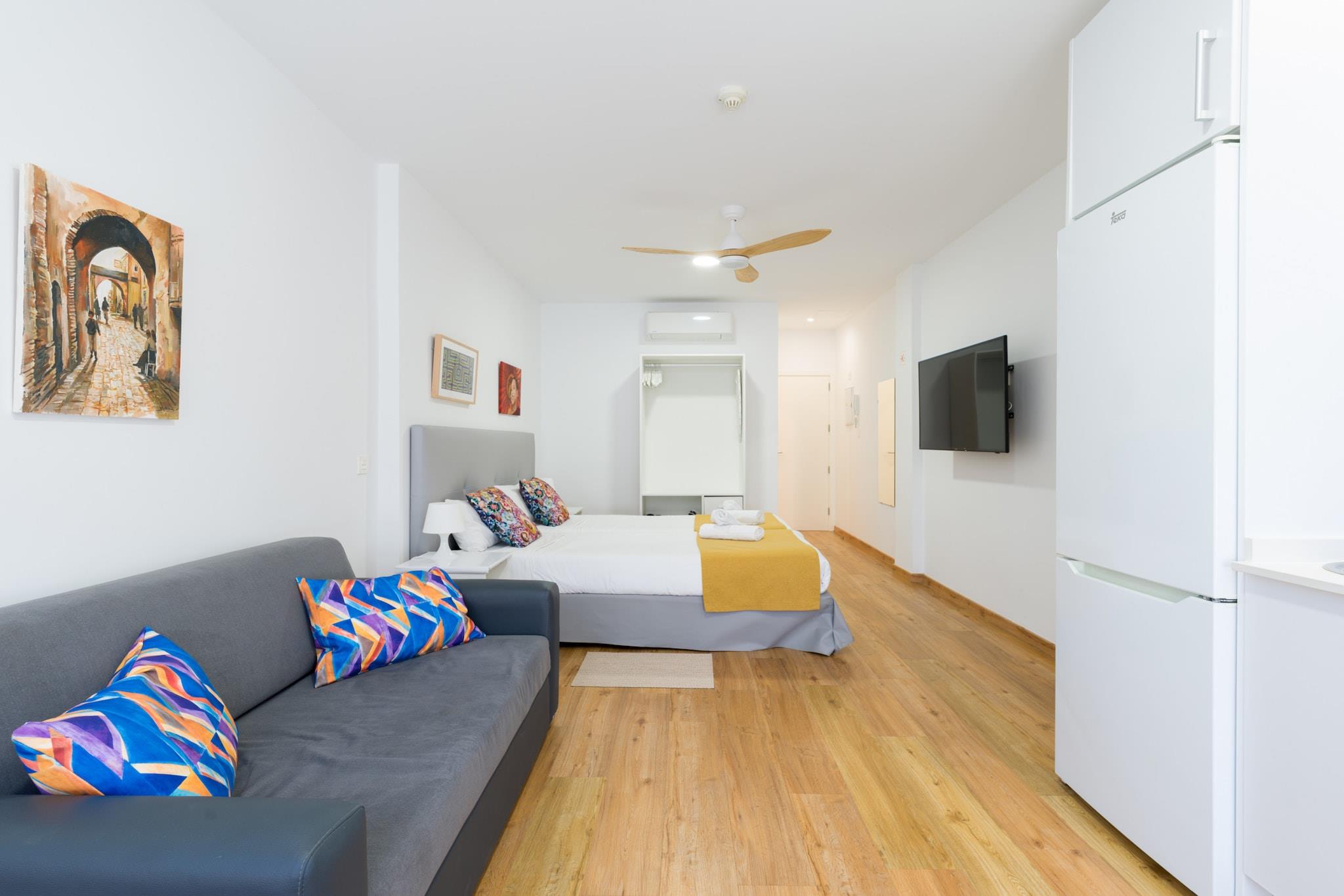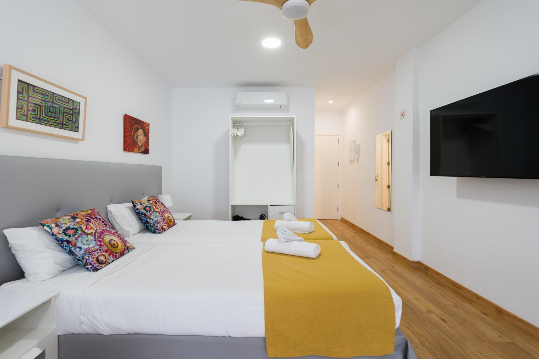 Velkommen til denne hyggelige og moderne lejlighed ved stranden i Las Palmas de Gran Canaria, det perfekte feriested ved havet for par eller solorejsende. Med 35 m² komfortabelt boligareal ligger denne charmerende lejlighed kun 25 meter fra den ikoniske Playa de Las Canteras, og tilbyder direkte adgang til stranden og en livlig promenade fyldt med restauranter, butikker og lokal charme. Lejligheden er smagfuldt indrettet og har alt hvad du behøver for et ubekymret ophold. Det åbne køkken er udstyret med en induktionskogeplader, mikroovn, køleskab, kaffemaskine, brødrister og kedel - ideel til at tilberede lette måltider og snacks. Efter en dag i solen kan du slappe af i det kølige, airconditionerede interiør med et fladskærms-tv, gratis Wi-Fi og en ventilator for at sikre komfort under hele dit ophold. Et strygejern og hårtørrer er også til rådighed for din bekvemmelighed. Beliggende i et livligt og eftertragtet kvarter ved stranden, placerer denne lejlighed dig få skridt fra havet og få øjeblikke fra al den lokale handling. Uanset om du nyder en morgensvømning, fanger solnedgangen over Atlanten eller udforsker de kulturelle højdepunkter i Las Palmas, er alt inden for rækkevidde. Perfekt placeret og veludstyret, denne lejlighed ved vandet tilbyder den ideelle base for din ferie på Gran Canaria.