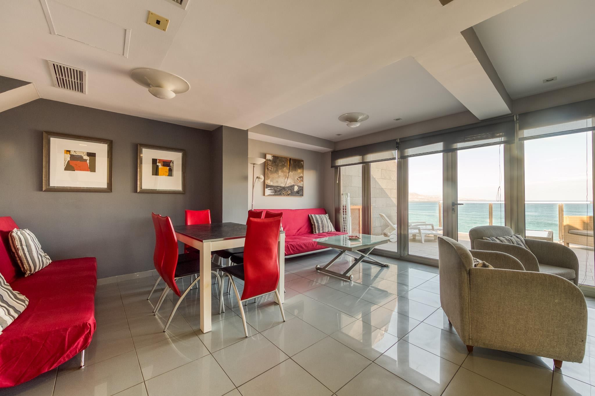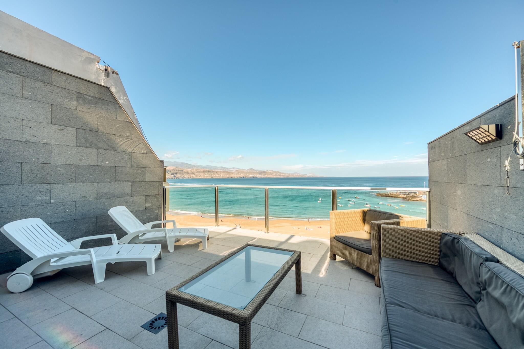 _x000D_ Oplev den perfekte blanding af komfort og kystcharme i denne smukke lejlighed med udsigt over Las Canteras-strandens gyldne sand. Fra din rummelige private terrasse kan du nyde uforstyrret havudsigt og betagende solnedgange med Teide-bjerget i horisonten. Med to hyggelige soveværelser (et dobbeltværelse, et enkelt), to moderne badeværelser og et lyst opholdsområde i åbent plan inviterer denne velindrettede lejlighed dig til at slappe af og nyde ø-livet, når det er bedst._x000D_ _x000D_ Beliggende lige ved strandpromenaden er du omgivet af det bedste fra Las Palmas - friske fiskerestauranter, travle caféer og lokale butikker. Træd udenfor og slentre langs den naturskønne promenade, der strækker sig langs stranden. Las Canteras, en af ??verdens bedste bystrande, byder på roligt vand til svømning, pulserende havliv til snorkling og et naturligt rev kendt som "La Barra", der skaber en unik saltvandspooloplevelse. Uanset om du leder efter vandsport, spisning ved stranden eller stille gåture ved havet, er det hele kun få skridt væk._x000D_ _x000D_ Lejligheden er fuldt udstyret med moderne bekvemmeligheder, herunder en keramisk kogeplade, køleskab, mikroovn, fryser, vaskemaskine, køkkenudstyr, kaffemaskine, brødrister, kedel og juicer. Hold forbindelsen med ubegrænset højhastigheds-Wi-Fi, slap af med et Smart TV, og nyd bekvemmeligheden med tankevækkende ekstraudstyr som et strygejern og en rummelig stue/spisestue. Dette feriested ved stranden er ideelt for par, små familier eller solorejsende og lover et uforglemmeligt ophold ved havet._x000D_