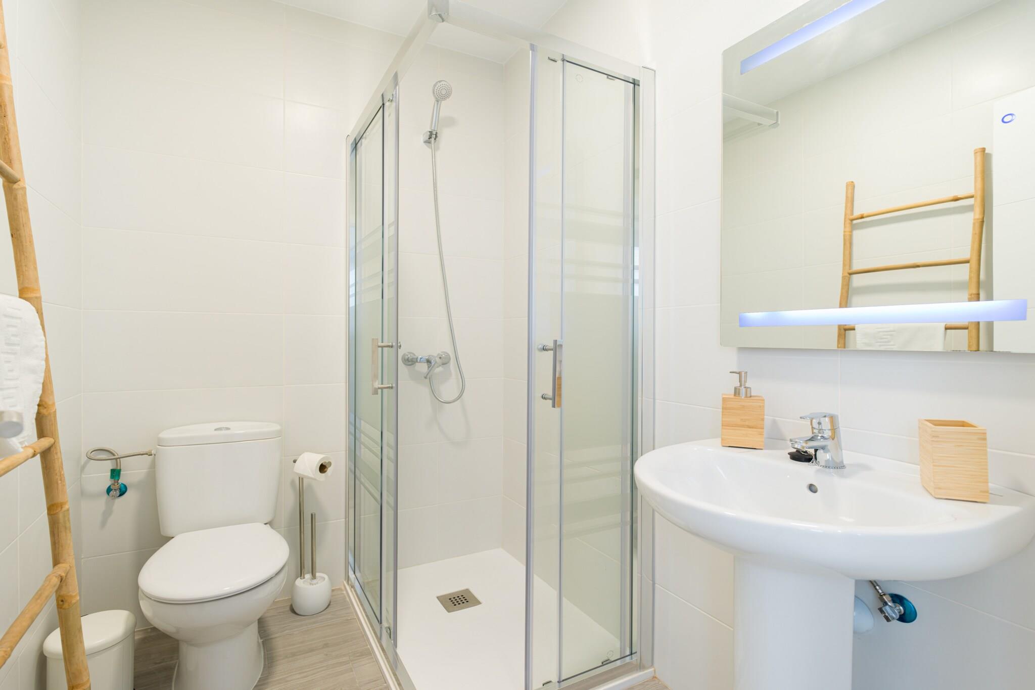 På 1. etage: (åbent køkken(kogeplade(glaskeramisk), elkedel, brødrister, kaffemaskine, ovn, mikrobølgeovn, opvaskemaskine , køle-fryseskab, Saftpresser, ), stue / spisestue(enkeltsovesofa, Fjernsyn(Smart-TV), spisebord, sofahjørne), soveværelse(enkeltseng, enkeltseng), soveværelse(enkeltseng), soveværelse(dobbeltseng), badeværelse(bruser), badeværelse(bruser)) Internetadgang, Fjernsyn(Smart-TV), tørretumbler, vaskemaskine, balkon, terrasse, strygejern, luft til luft-varmepumpe, føntørrer,