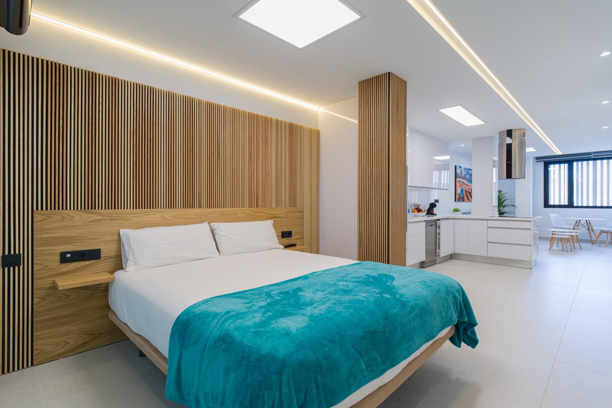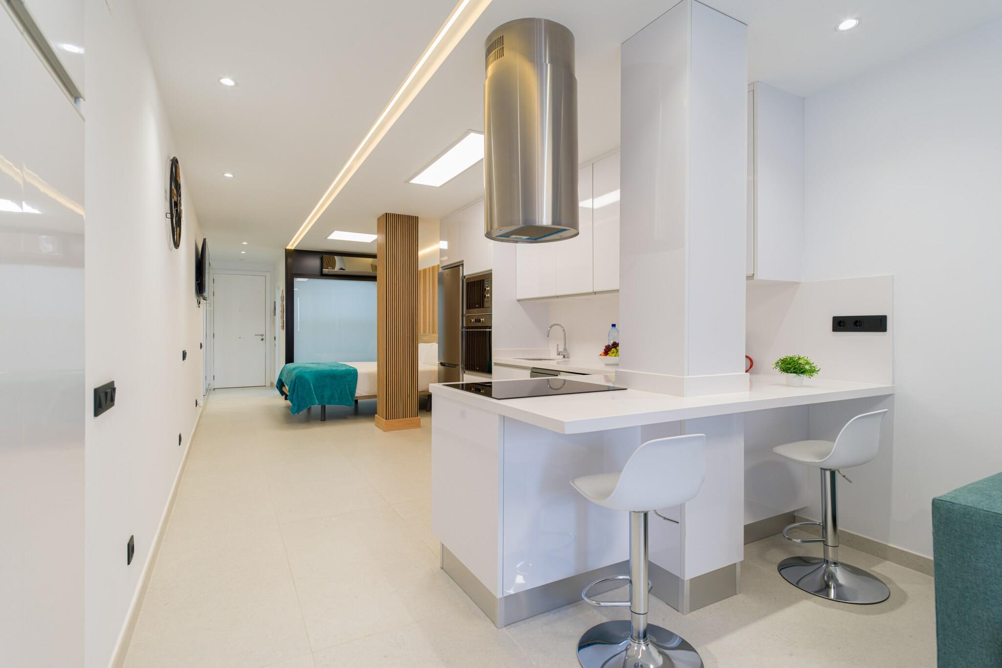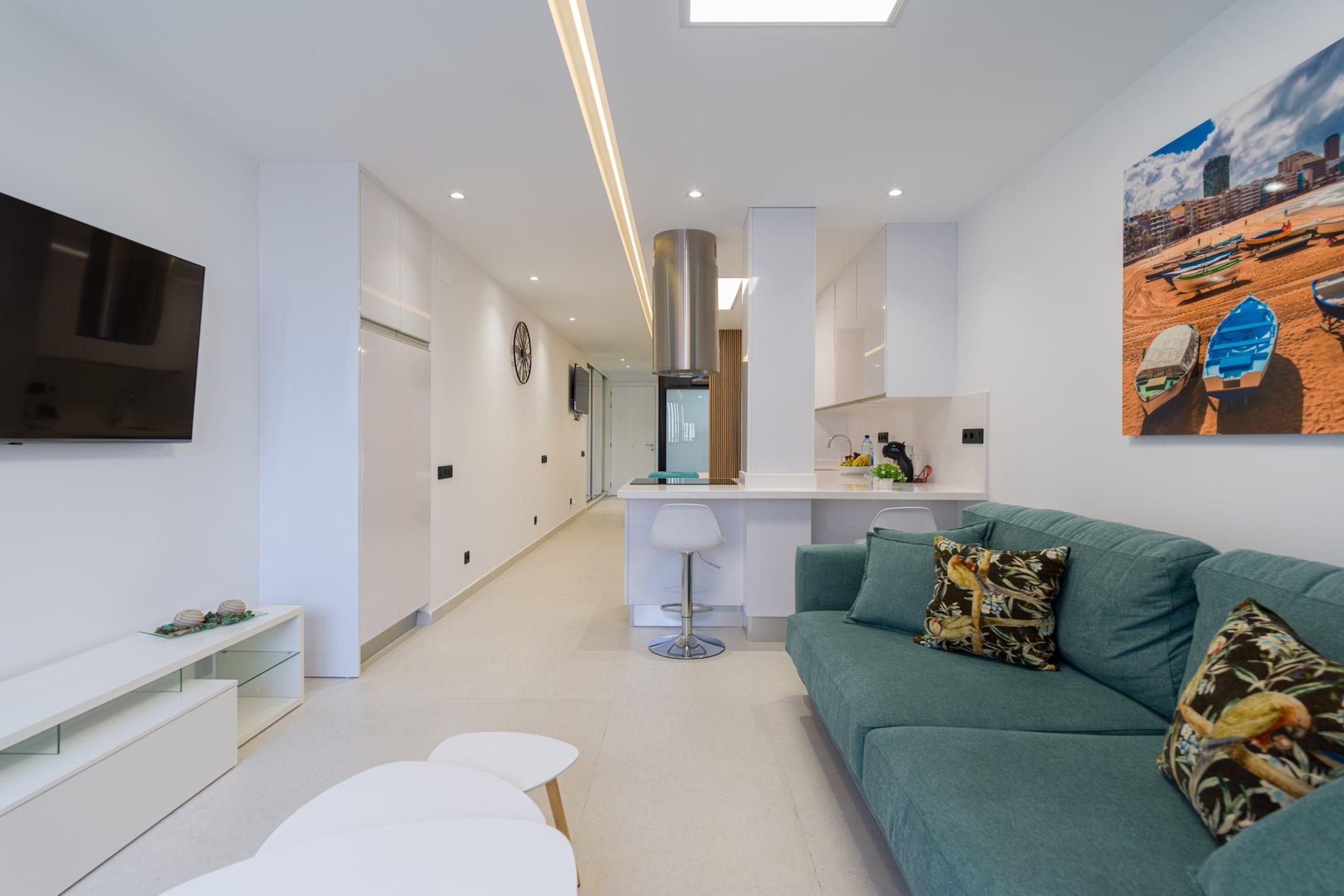Oplev moderne komfort kun få øjeblikke fra Playa de Las Canteras gyldne sand i denne nybyggede 1-værelses lejlighed i Las Palmas de Gran Canaria. Med 43 m² smagfuldt møbleret indvendigt rum er dette hyggelige tilflugtssted perfekt for to gæster, der søger et stilfuldt ophold i hjertet af byen. Omgivet af supermarkeder, caféer og lokale restauranter, er alt hvad du behøver lige uden for din dør - inklusive nem adgang til stranden og nærliggende offentlig transport. Lejligheden er omhyggeligt udstyret med alt for et afslappet, bekymringsfrit ophold: hurtig Wi-Fi, aircondition overalt, to smart-tv'er, en vaskemaskine og tørretumbler og et fuldt udstyret åbent køkken. Nyd hjemmelavede måltider med apparater såsom en keramisk kogeplade, mikroovn, ovn, køleskab, fryser, opvaskemaskine, kaffemaskine, brødrister og kedel - alt sammen for din bekvemmelighed. Lejligheden indeholder desuden et moderne badeværelse og god opbevaringsplads. Uanset om du udforsker byens centrum, slapper af ved de nærliggende strande eller planlægger dagsture rundt på Gran Canaria, gør denne hjemmebase det nemt at blande komfort med eventyr. Fra de rolige kystnære omgivelser til dens velforbundne beliggenhed nær busstationer og populære seværdigheder, er denne charmerende og kompakte lejlighed ideel til par, solorejsende eller fjernarbejdere, der ønsker at nyde øens livsstil med stil.