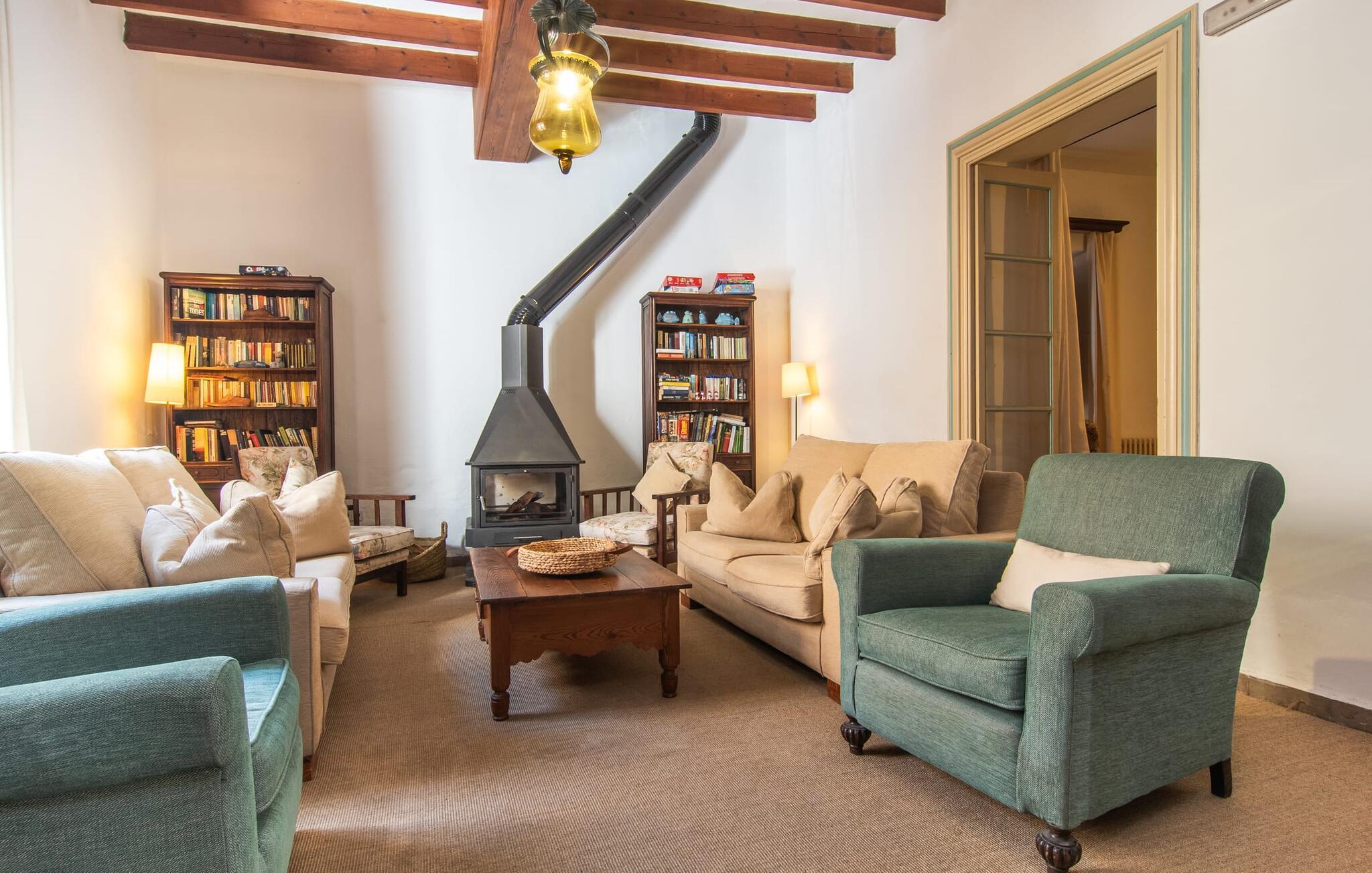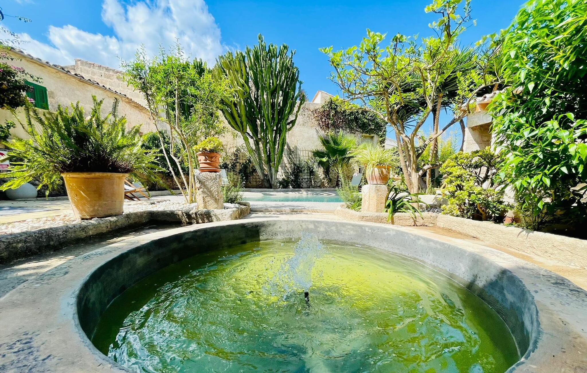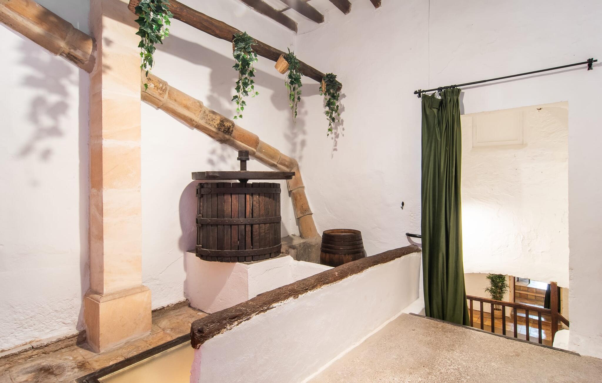 Det tidligere villahotel "Leon de Sineu" byder på historiske mure, rustik charme, skjulte hjørner med blomstrende bougainvilleaer, duftende citrontræer og kaktusser. Parkering er mulig direkte på gaden, da det imponerende todelte bygningskompleks har brug for hver centimeter til sine NI værelser, terrasserne og den idylliske have. Den lille pool ligger i et roligt, solrigt hjørne. Her kan I køle ned efter en spadseretur gennem byen. Så snart I træder ind i den luftige have, vil I hurtigt glemme, at I befinder jer midt i Sineus gader. Hver gæst har deres eget tilbagetog. Selv små grupper kan slappe af og slappe af i de forskellige lokaler. Når alle borde på terrassen er dækket til morgenmad eller grill, kan I næsten blive fristet til at vente på service, som I plejede. Måske kan I anmode om en kok fra ejerne på jeres rejse. Den imponerende entré minder stadig om den gamle hotelreception. Det gamle bedstefars ur og en lille forfriskningsbar byder stadig velkommen til ankommende gæster, før de breder sig over hovedbygningens to etager. I det store hus finder I ni individuelt indrettede dobbeltværelser, hvoraf fem har hver to enkeltsenge, et femsengsværelse (med dobbeltseng og 3 enkeltsenge) og 3 værelser med dobbeltsenge. I de eksisterende værelser finder I unik charme og moderne faciliteter som aircondition, stole og private badeværelser. Der er i alt fem brusere og syv badekar. Den, der trækker den heldige lodtrækning ved tildeling af lokaler, kan se frem til en lille altan. Højt til loftet og trædøre, antikke skatte, kunstfærdige udskæringer og forskellige fællesrum med eller uden fjernsyn giver huset svundne tiders unikke atmosfære. I kan også holde møder i en afslappet atmosfære eller livlige fester i den klimatiserede vinterhave (i stedet for seminarlokalet eller diskoteket, der også er til rådighed, er det et tværfagligt lokale). Det rustikke køkken med den store stenbuegang ser intet mindre end fantastisk ud, men det har heldigvis også praktiske funktioner som mikroovn og opvaskemaskine, væsentlige redskaber til store grupper. Landsbyens navnebror, Sant Marcs bevingede løve, står på kirkepladsen i middelalderbyen, som byder på spændende ture gennem den historiske fortid samt øens største husdyrmarked. Store marker, vindmøller, olivenlunde og vinmarker præger landskabet i centrum af øen, som er særligt let at udforske til fods eller på cykel. Et højdepunkt er mandelblomstringen i januar og februar. Foodies vil også finde deres paradis her og opdage mange gode lokale vine eller endda en eller to mallorcanske specialiteter i rolige landsbyer som Petra, Ariany, Costitx og Santa Margalida. Hvis I længes efter havet, kan I køre 20 km til Can Picafort og Alcúdia-bugten. (Licensnummer: TI/81, Navn: León de Sineu) Kun en kort gåtur fra middelalderbyen Sineu ligger denne unikke villa "Leon de Sineu", bygget i 1400-tallet og med sin skjulte indre have, ideel til store grupper . Et af øens smukkeste bondemarkeder, butikker og restauranter ligger lige uden for døren. For mere omfattende shopping anbefaler vi den gamle bydel i Inca, kendt for sine lædervarer og vin. Playa de Muro og Playa Son Baulo er omkring 20 km væk.