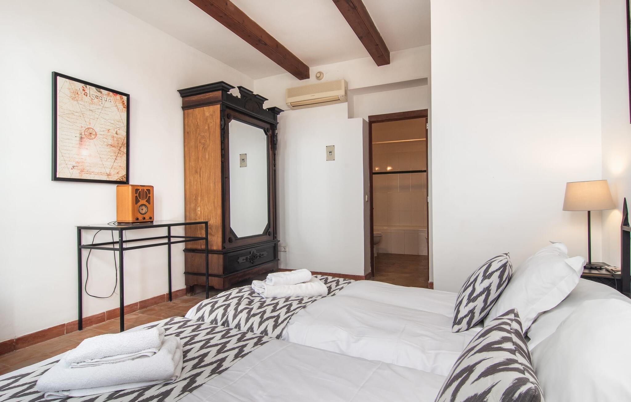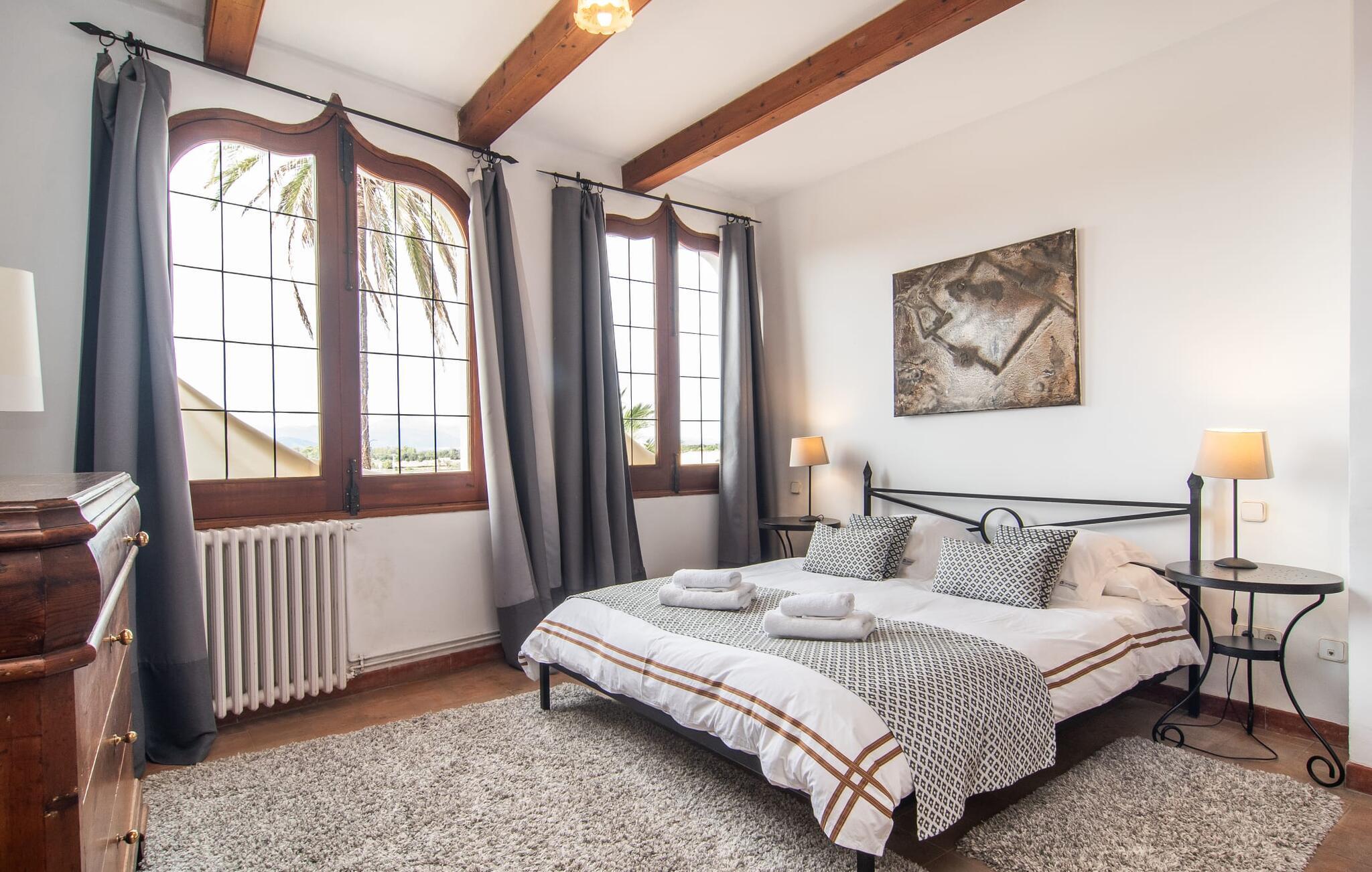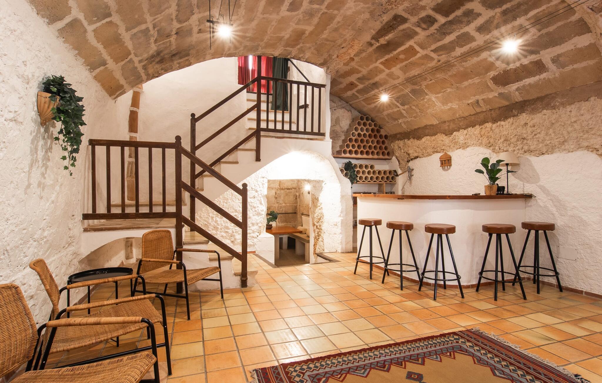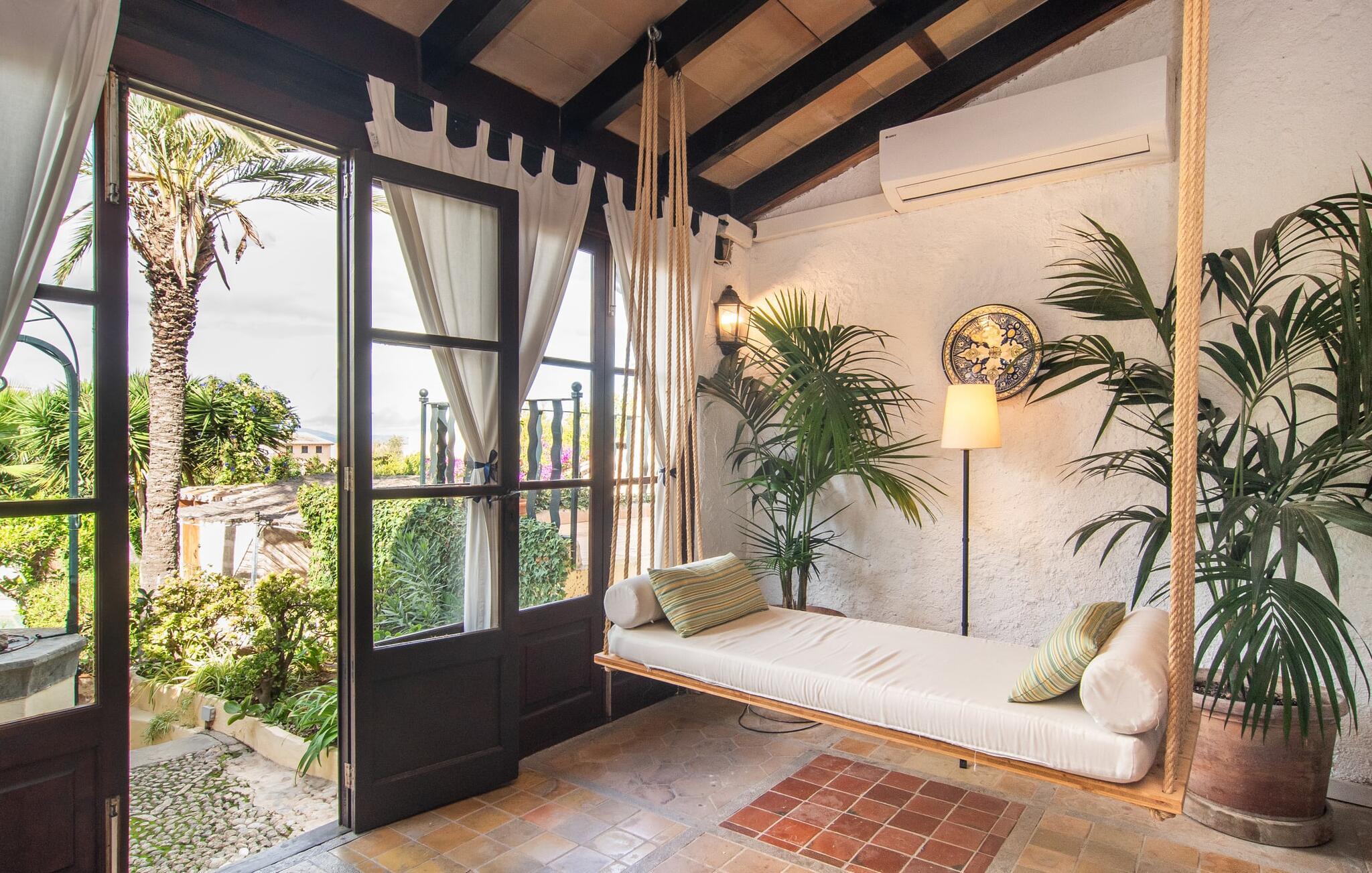 Det tidligere villahotel "Leon de Sineu" byder på historiske mure, rustik charme, skjulte hjørner med blomstrende bougainvilleaer, duftende citrontræer og kaktusser. Parkering er mulig direkte på gaden, da det imponerende todelte bygningskompleks har brug for hver centimeter til sine NI værelser, terrasserne og den idylliske have. Den lille pool ligger i et roligt, solrigt hjørne. Her kan I køle ned efter en spadseretur gennem byen. Så snart I træder ind i den luftige have, vil I hurtigt glemme, at I befinder jer midt i Sineus gader. Hver gæst har deres eget tilbagetog. Selv små grupper kan slappe af og slappe af i de forskellige lokaler. Når alle borde på terrassen er dækket til morgenmad eller grill, kan I næsten blive fristet til at vente på service, som I plejede. Måske kan I anmode om en kok fra ejerne på jeres rejse. Den imponerende entré minder stadig om den gamle hotelreception. Det gamle bedstefars ur og en lille forfriskningsbar byder stadig velkommen til ankommende gæster, før de breder sig over hovedbygningens to etager. I det store hus finder I ni individuelt indrettede dobbeltværelser, hvoraf fem har hver to enkeltsenge, et femsengsværelse (med dobbeltseng og 3 enkeltsenge) og 3 værelser med dobbeltsenge. I de eksisterende værelser finder I unik charme og moderne faciliteter som aircondition, stole og private badeværelser. Der er i alt fem brusere og syv badekar. Den, der trækker den heldige lodtrækning ved tildeling af lokaler, kan se frem til en lille altan. Højt til loftet og trædøre, antikke skatte, kunstfærdige udskæringer og forskellige fællesrum med eller uden fjernsyn giver huset svundne tiders unikke atmosfære. I kan også holde møder i en afslappet atmosfære eller livlige fester i den klimatiserede vinterhave (i stedet for seminarlokalet eller diskoteket, der også er til rådighed, er det et tværfagligt lokale). Det rustikke køkken med den store stenbuegang ser intet mindre end fantastisk ud, men det har heldigvis også praktiske funktioner som mikroovn og opvaskemaskine, væsentlige redskaber til store grupper. Landsbyens navnebror, Sant Marcs bevingede løve, står på kirkepladsen i middelalderbyen, som byder på spændende ture gennem den historiske fortid samt øens største husdyrmarked. Store marker, vindmøller, olivenlunde og vinmarker præger landskabet i centrum af øen, som er særligt let at udforske til fods eller på cykel. Et højdepunkt er mandelblomstringen i januar og februar. Foodies vil også finde deres paradis her og opdage mange gode lokale vine eller endda en eller to mallorcanske specialiteter i rolige landsbyer som Petra, Ariany, Costitx og Santa Margalida. Hvis I længes efter havet, kan I køre 20 km til Can Picafort og Alcúdia-bugten. (Licensnummer: TI/81, Navn: León de Sineu) Kun en kort gåtur fra middelalderbyen Sineu ligger denne unikke villa "Leon de Sineu", bygget i 1400-tallet og med sin skjulte indre have, ideel til store grupper . Et af øens smukkeste bondemarkeder, butikker og restauranter ligger lige uden for døren. For mere omfattende shopping anbefaler vi den gamle bydel i Inca, kendt for sine lædervarer og vin. Playa de Muro og Playa Son Baulo er omkring 20 km væk.