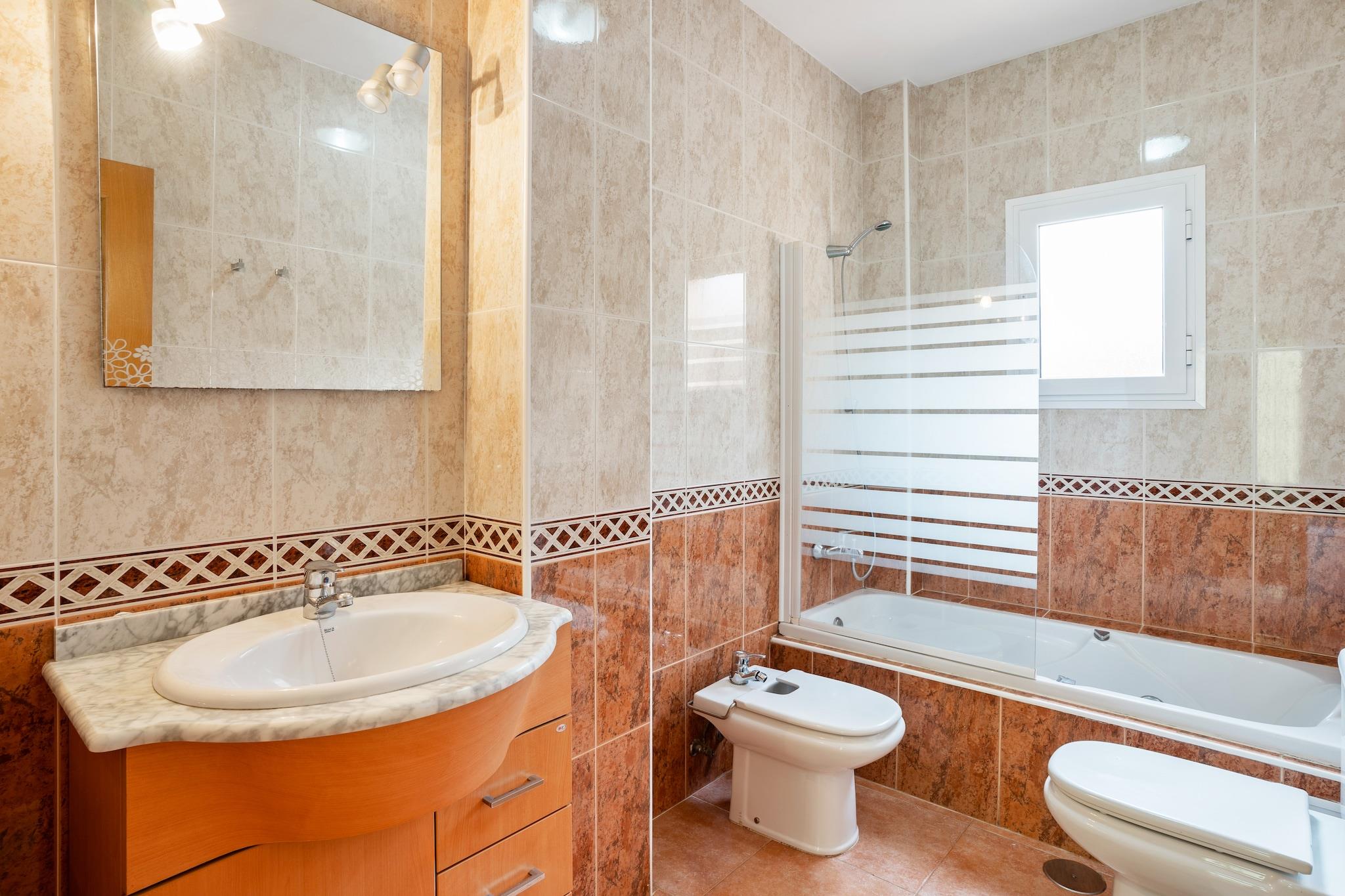 Stueetage: (Stue(dobbeltsovesofa, Fjernsyn, spisebord, sofahjørne), Køkken(kakkelovn, cooker, brødrister, ovn, opvaskemaskine , køleskab, fryser), soveværelse(enkeltseng, enkeltseng, varme, klimaanlæg), soveværelse(køjeseng, køjeseng, varme, klimaanlæg), Soveværelse med badeværelse(dobbeltseng, badekar eller bruser, toilet, balkon eller terrasse, varme, klimaanlæg), badeværelse(badekar eller bruser, toilet, vaskemaskine), terrasse(40 m2), terrassevarmer, terrassevarmer) På 1. etage: (terrasse) have, swimmingpool(deles med andre gæster)