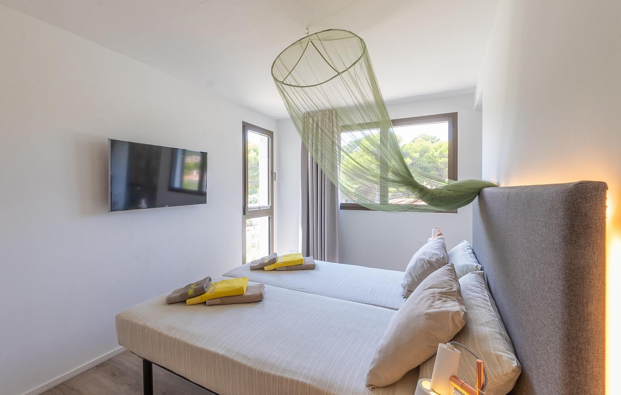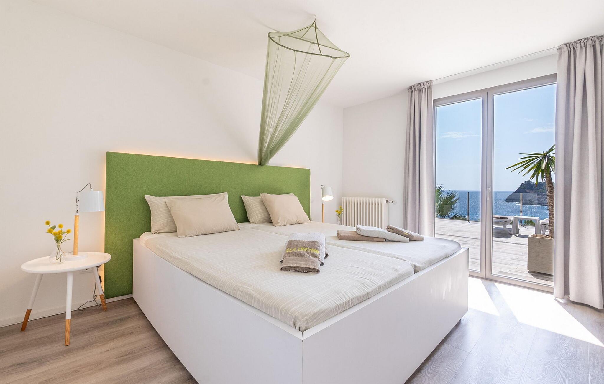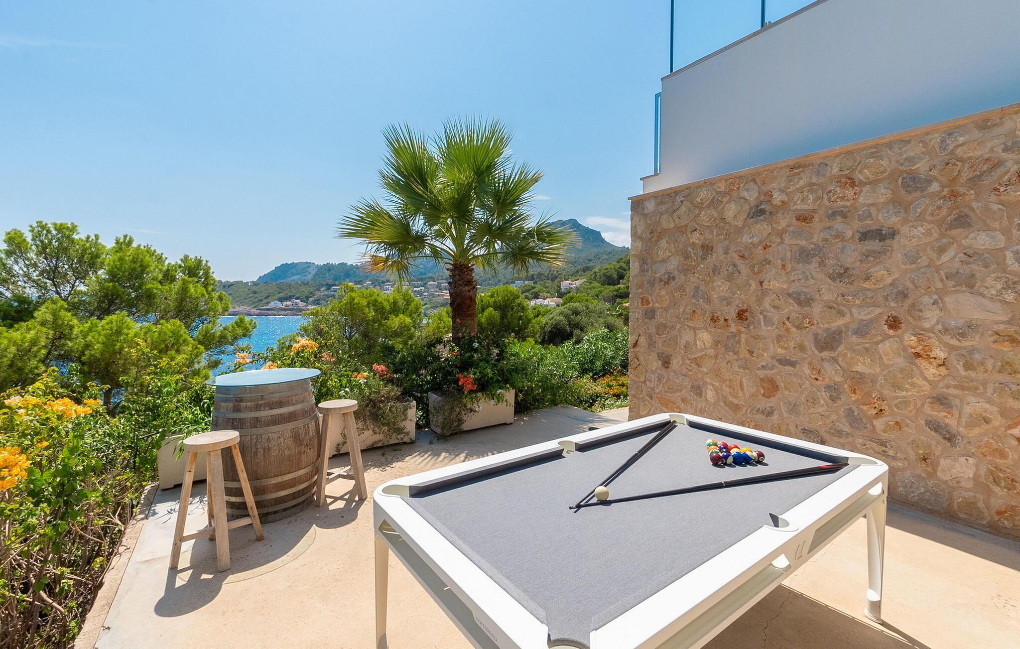 "Lifetime"-villaen byder på en spektakulær havudsigt takket være sin beliggenhed på en bjergskråning i det eksklusive Font de Sa Cala-distrikt. Foran øverste etage er der en sydvendt havudsigt terrasse med en infinity-pool, en hyggelig udendørs lounge, et vindbeskyttet solbadeområde og en indbydende spiseplads. På den anden side er der en smuk terrasse omgivet af natursten med en anden pool, som valgfrit kan bookes og opvarmes eller køles efter behov. Almindelige gæster pas på: fra den tredje reservation og fremefter er denne pool inkluderet som en gratis opgradering! Lige ved siden af er der en skyggefuld spiseplads og et sommerkøkken med gasgrill. Der er også et udendørs bordtennisbord og et poolbord. Interiøret i villaen af høj kvalitet på Mallorcas østkyst imponerer med sin lysstyrke, moderne design og maksimale komfort. Designet af begge etager lægger også vægt på familievenlighed. I alt seks dobbeltværelser med aircondition, havudsigt, private badeværelser og tv venter på dig - fire på hovedetagen og to på nederste etage. Du kan også nyde direkte havudsigt i den elegante stue med en XXL sofalounge. Gennem brede glasskydedøre er der adgang til både poolterrassen og det veludstyrede højglans køkken. Naturligvis kan hele opholdsområdet også komfortabelt have aircondition. Fester og fester er ikke tilladt i denne førsteklasses villa. Hvis det ønskes, kan villaens egen motorbåd "Lifetime" bookes. Mellem Cala Ratjada og Canyamel, i det eksklusive boligområde Cala Provençals, byder drømmevillaen "Lifetime" på en bjergskråning, en parkeringsplads på ejendommen, uhindret havudsigt, en infinity-pool og elegant og kølig komfort. Havet er kun få skridt væk. Den sandede bugt Sa Font de Sa Cala og restauranter er inden for nem gåafstand. Landmandsmarkeder, gode indkøbsmuligheder og promenader venter på dig kun få kilometer væk i Capdepera, Canyamel eller Artà. Dette er et Fincallorca feriehus.