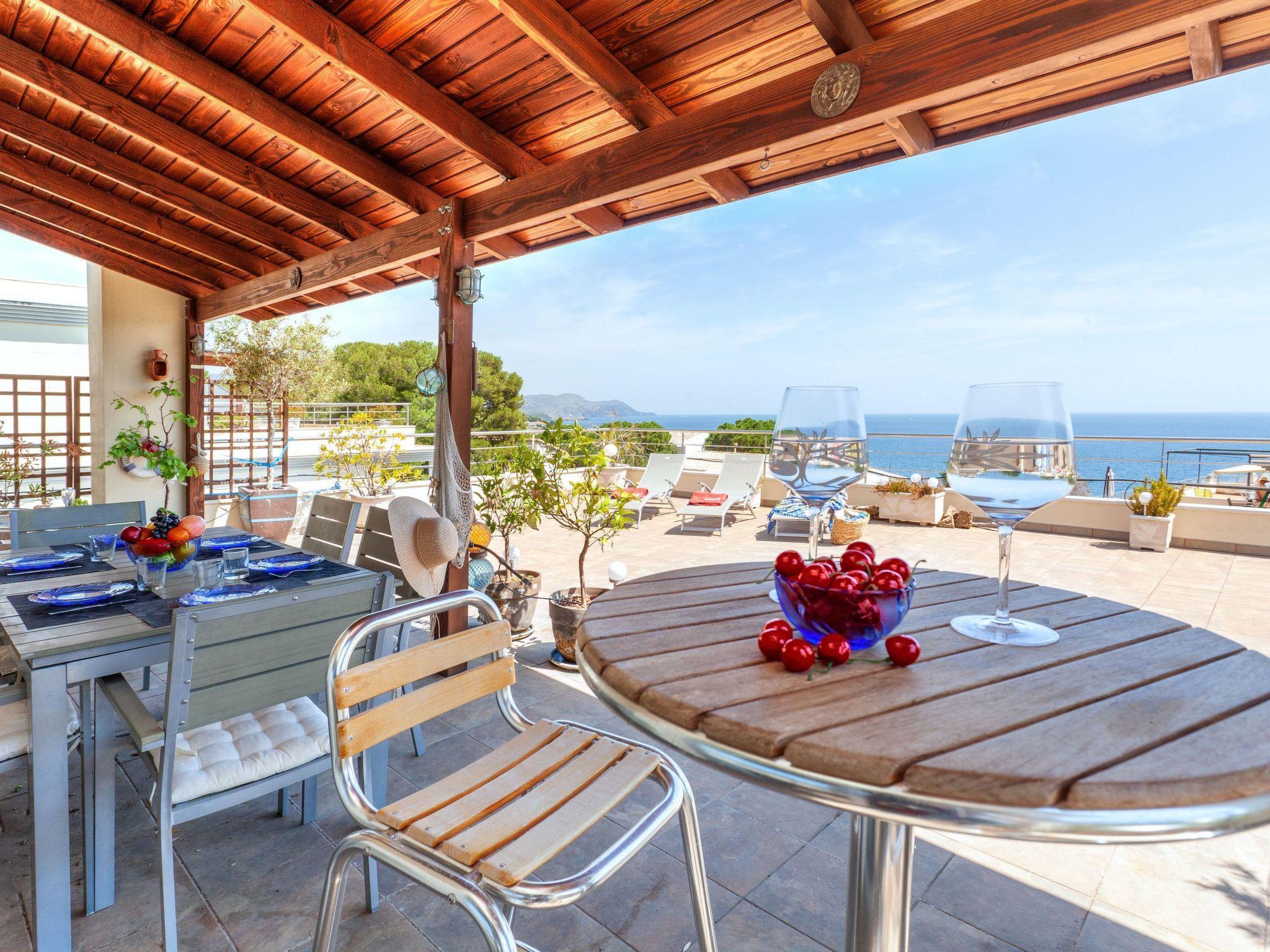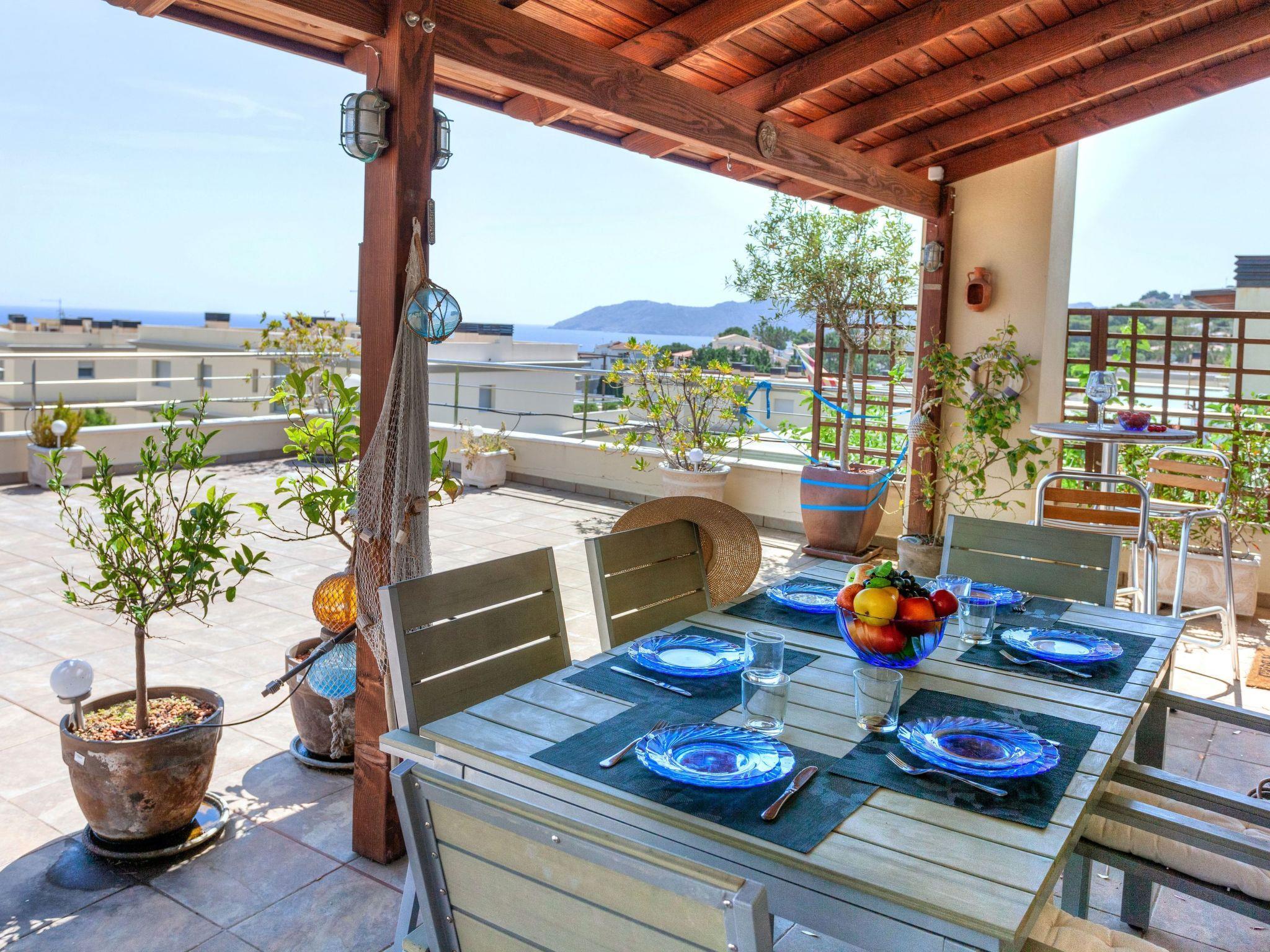 3-room penthouse 68 m2 on 1st floor. Modern and tasteful furnishings: living/dining room 28 m2 with 1 folding bed (80 cm), digital TV, flat screen and air conditioning. Exit to the terrace. 1 room with 1 french bed (1 x 150 cm), TV (flat screen), electric heater and air conditioning. Exit to the terrace. 1 room with 2 beds (90 cm). Open kitchen (4 hot plates, oven, dishwasher, microwave, freezer, electric coffee machine). Bath/bidet/WC, sep. WC. Large terrace 75 m2. Terrace furniture. Marvellous view of the sea. Facilities: washing machine, iron. Internet (WiFi). Parking. Please note: TV only ES, FR. HUTG000679 // Reg. Nr.: ESFCTU000017020000371290000000000000000000HUTG0006798