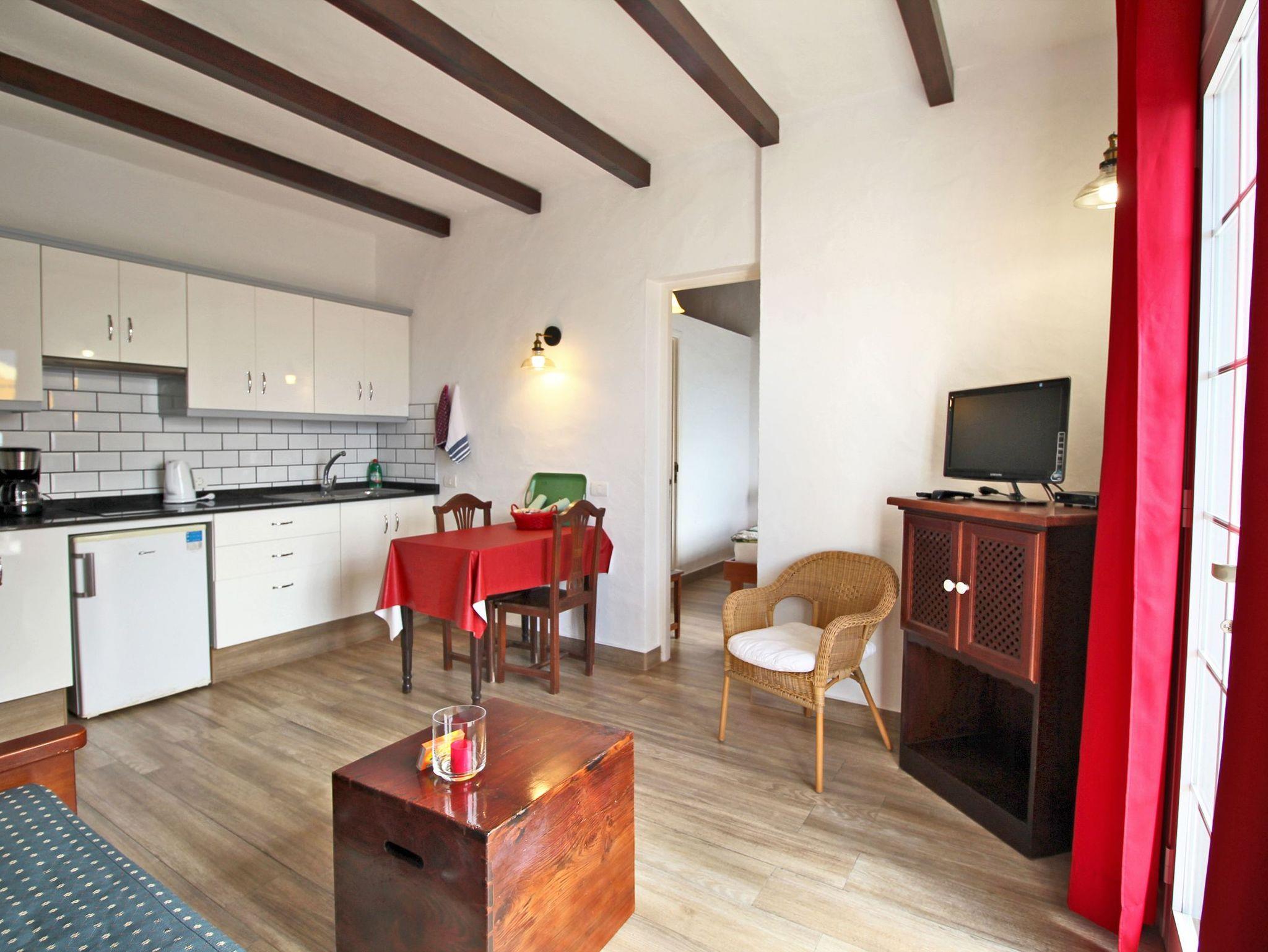 • Sofa, Couchtisch, Esstisch mit 2 Stühlen, Fernseher (mit allen deutschen und spanischen Programme)