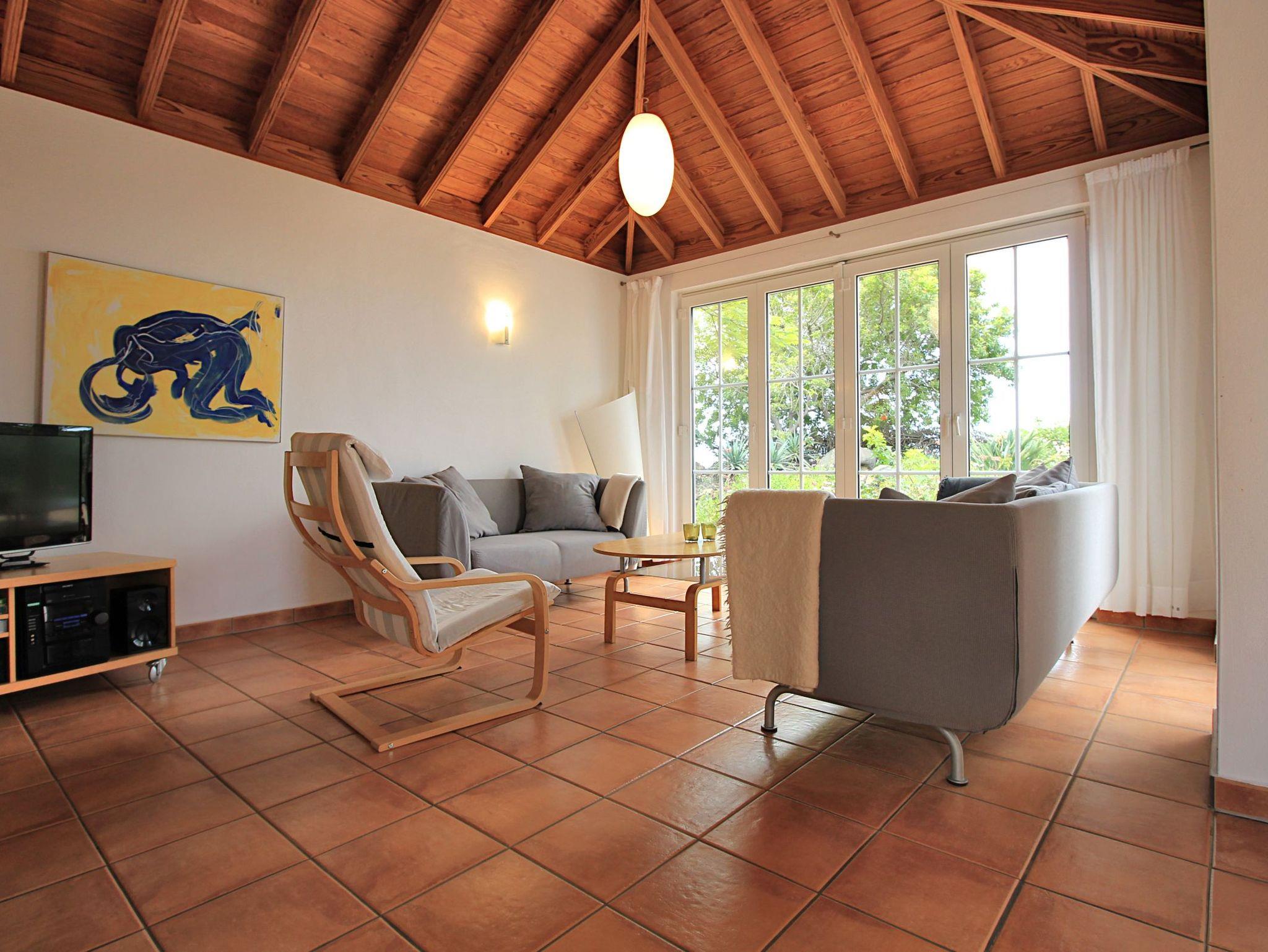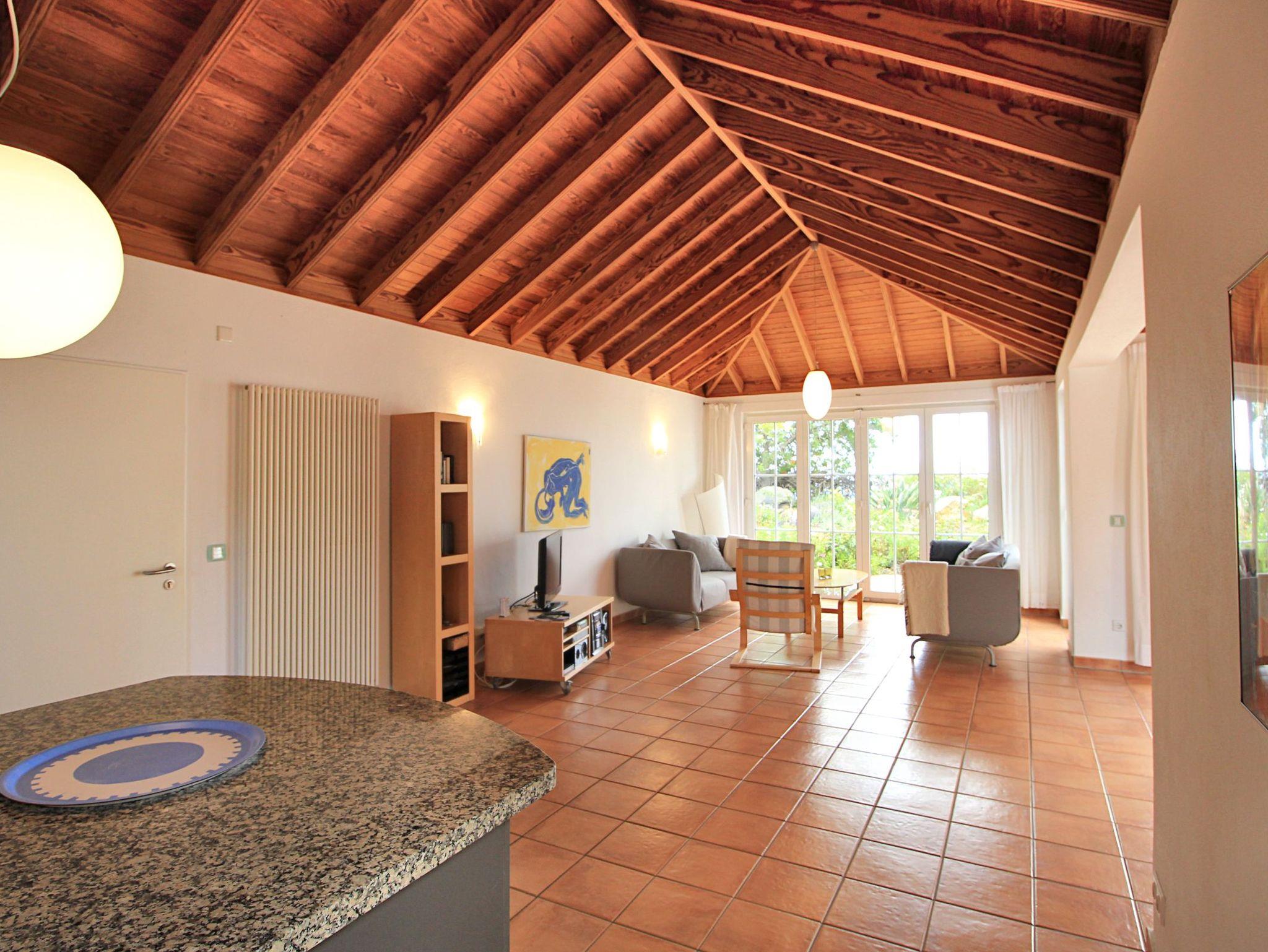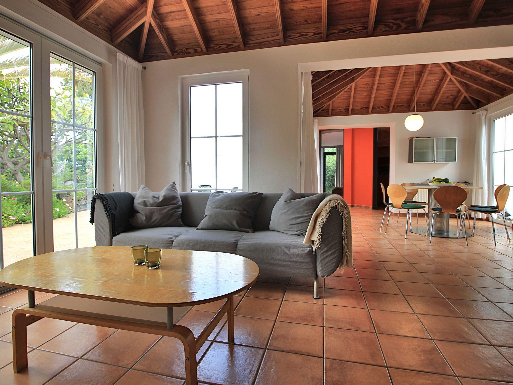 Runde Wände und Natursteinverkleidung mischen sich mit moderner Architektur und erzeugen ein ganz besonderes Raumgefühl. Weitläufigkeit, Helligkeit, akzentuierte Wände im Orange von gebranntem Ton, Terrakottafliesen und hohe kanarische Holzdecken sorgen für eine entspannte Wohnlichkeit in der Unterkunft, die von subtropischen Pflanzen eingerahmt wird.