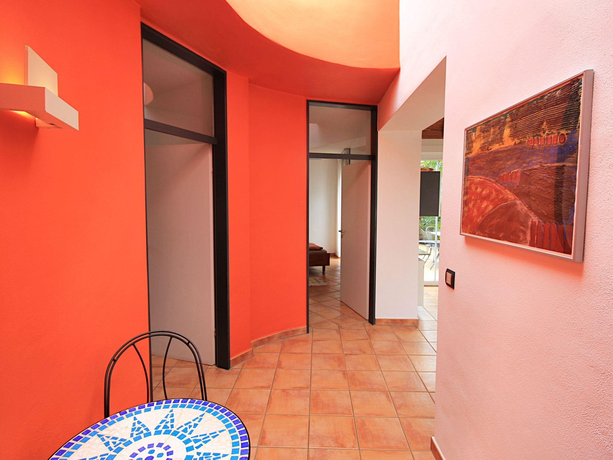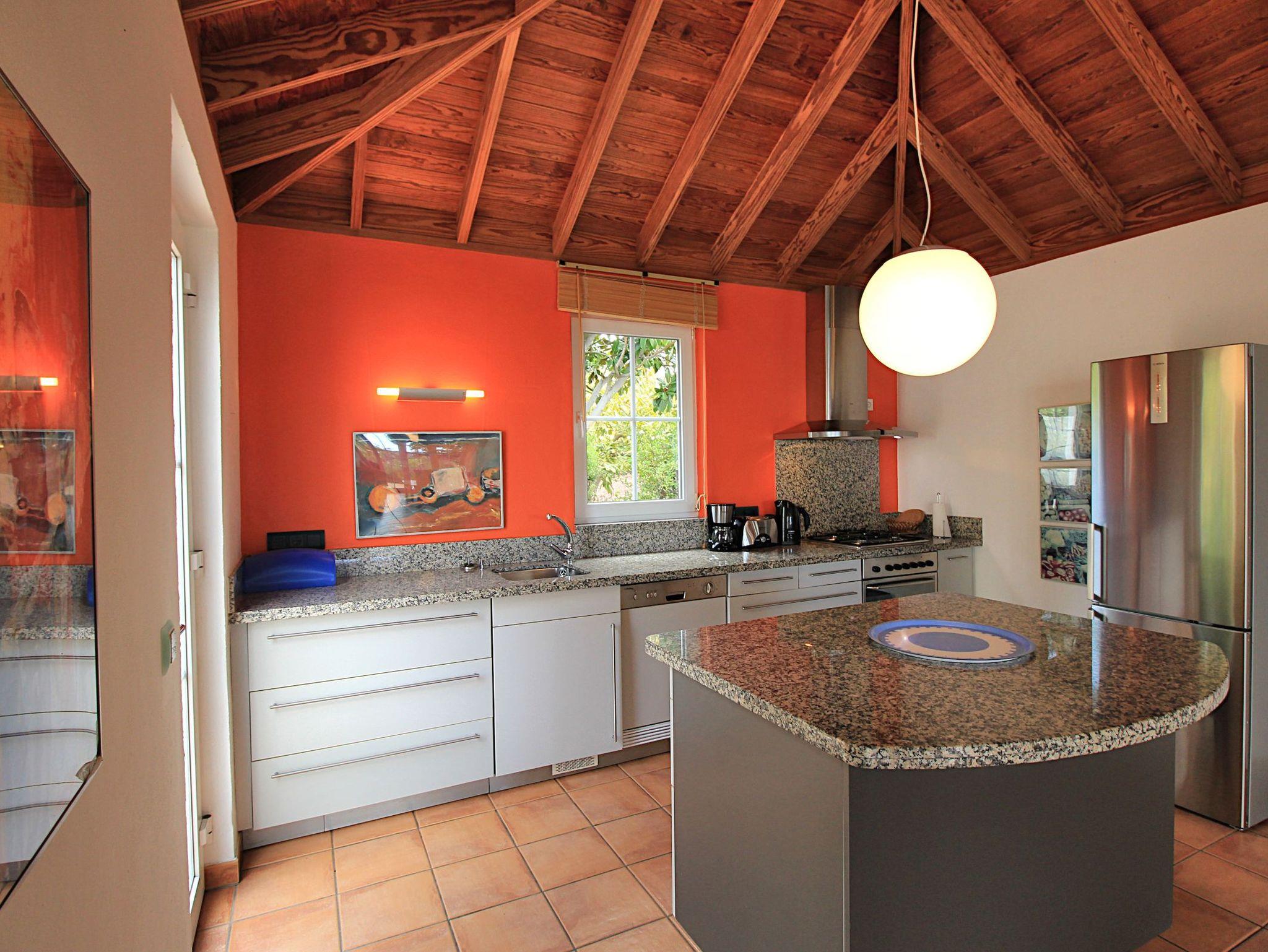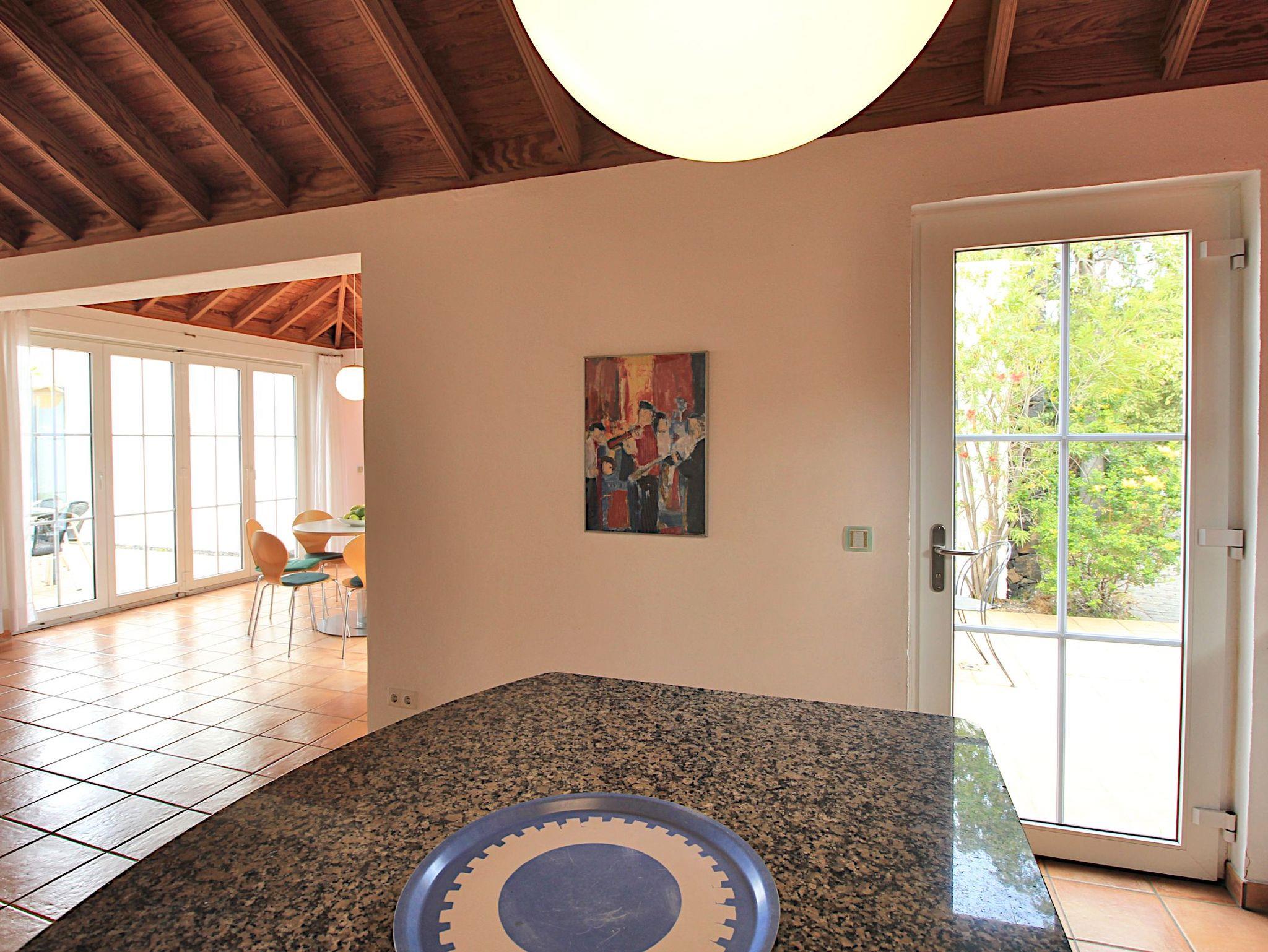 Runde Wände und Natursteinverkleidung mischen sich mit moderner Architektur und erzeugen ein ganz besonderes Raumgefühl. Weitläufigkeit, Helligkeit, akzentuierte Wände im Orange von gebranntem Ton, Terrakottafliesen und hohe kanarische Holzdecken sorgen für eine entspannte Wohnlichkeit in der Unterkunft, die von subtropischen Pflanzen eingerahmt wird.