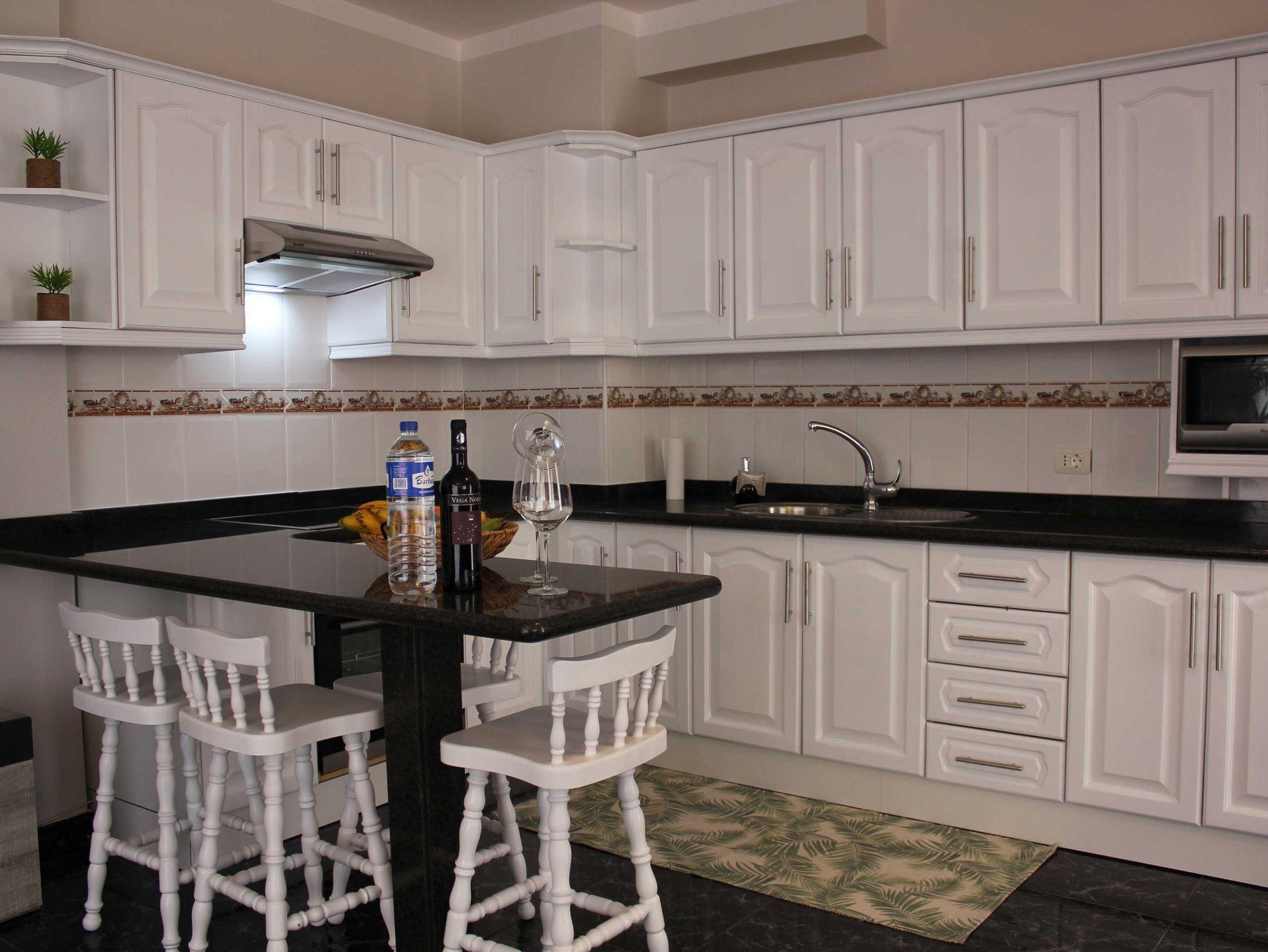 Das Wohnzimmer verfügt über eine normale Wohnzimmereinrichtung mit großer, bequemer Couch und moderner Unterhaltungselektronik. Insgesamt 3 große Terrassen-Schiebetüren sorgen hier für viel Licht und ein angenehmes Wohnambiente. Angrenzend befindet sich die (bis auf einen Geschirrspüler) komplett ausgestattete Einbauküche mit Marmortheke und Stühlen.