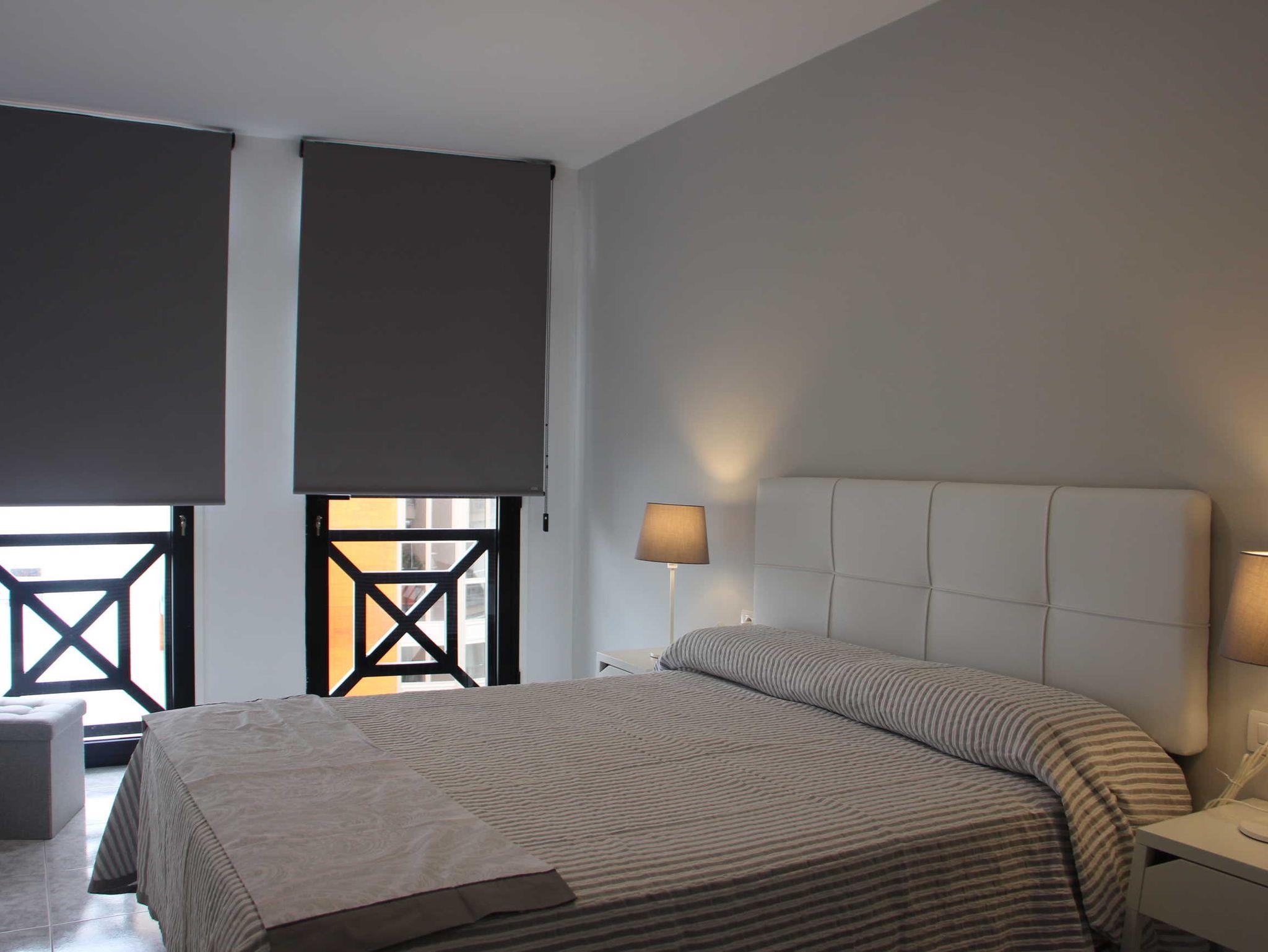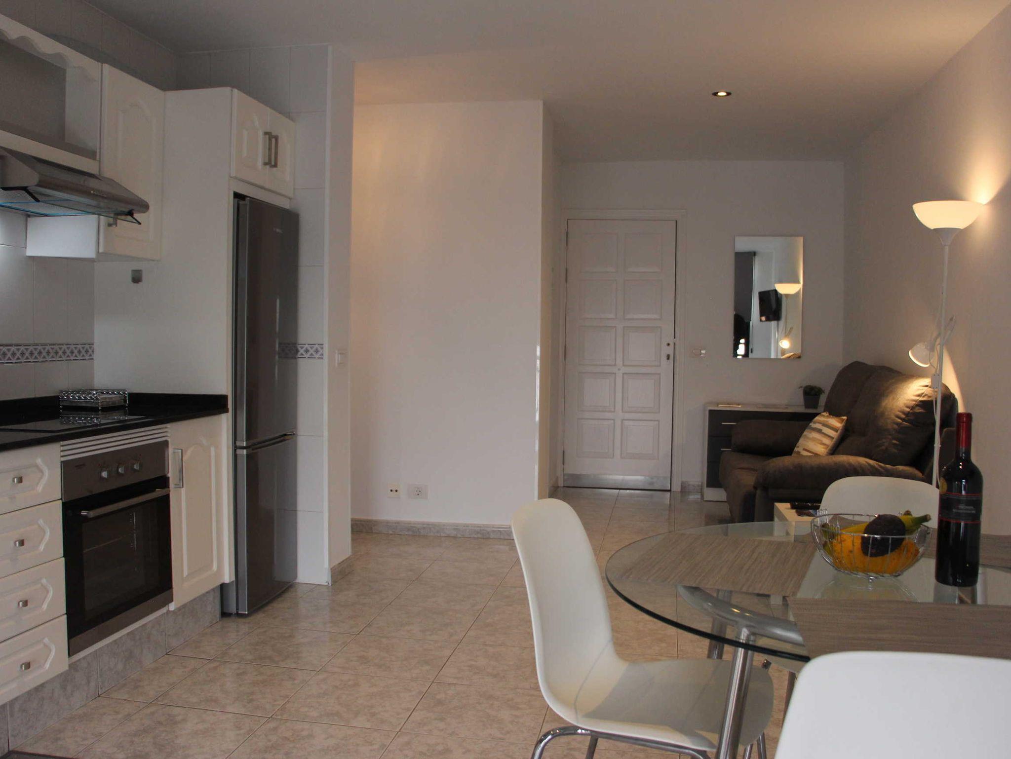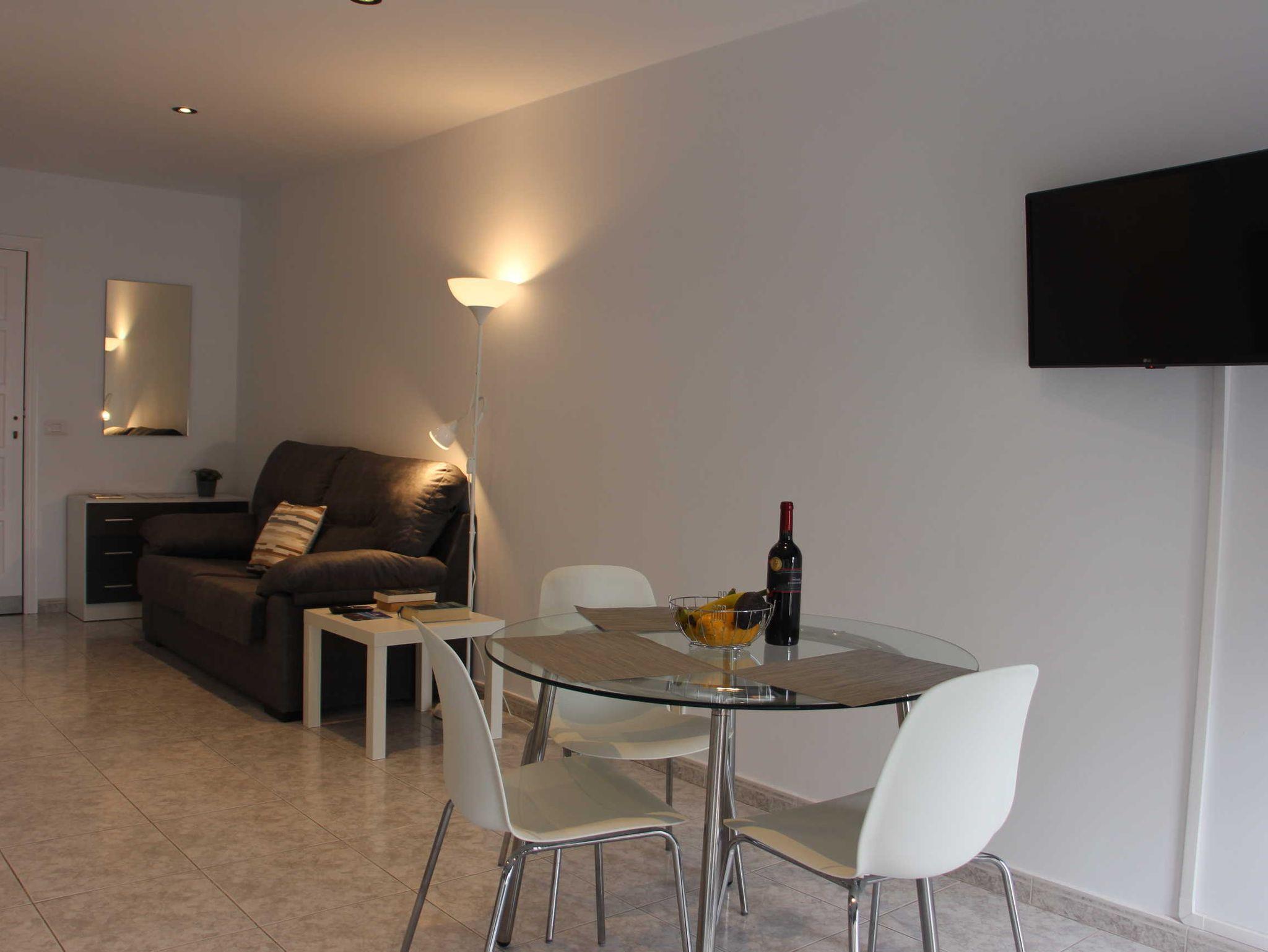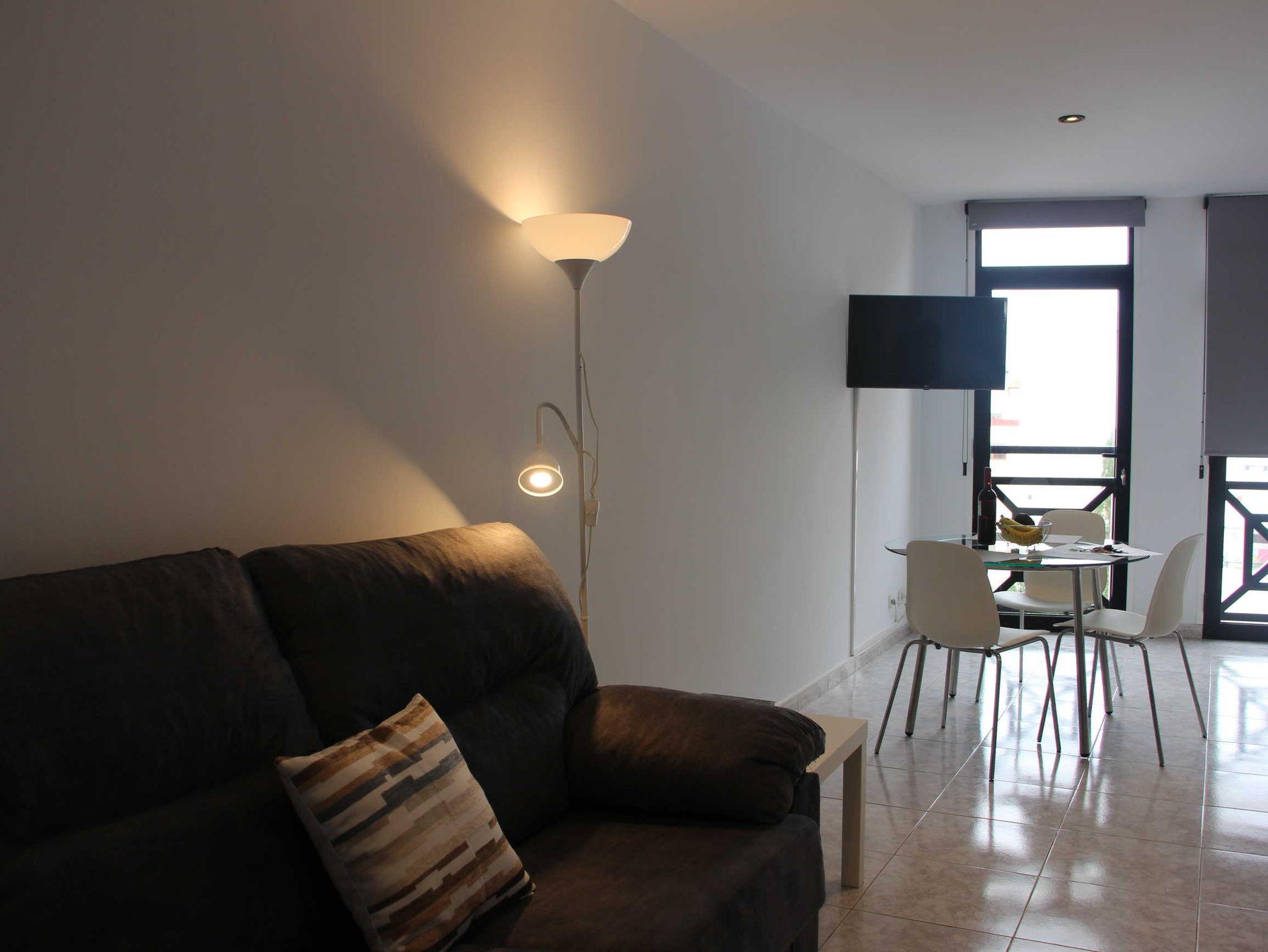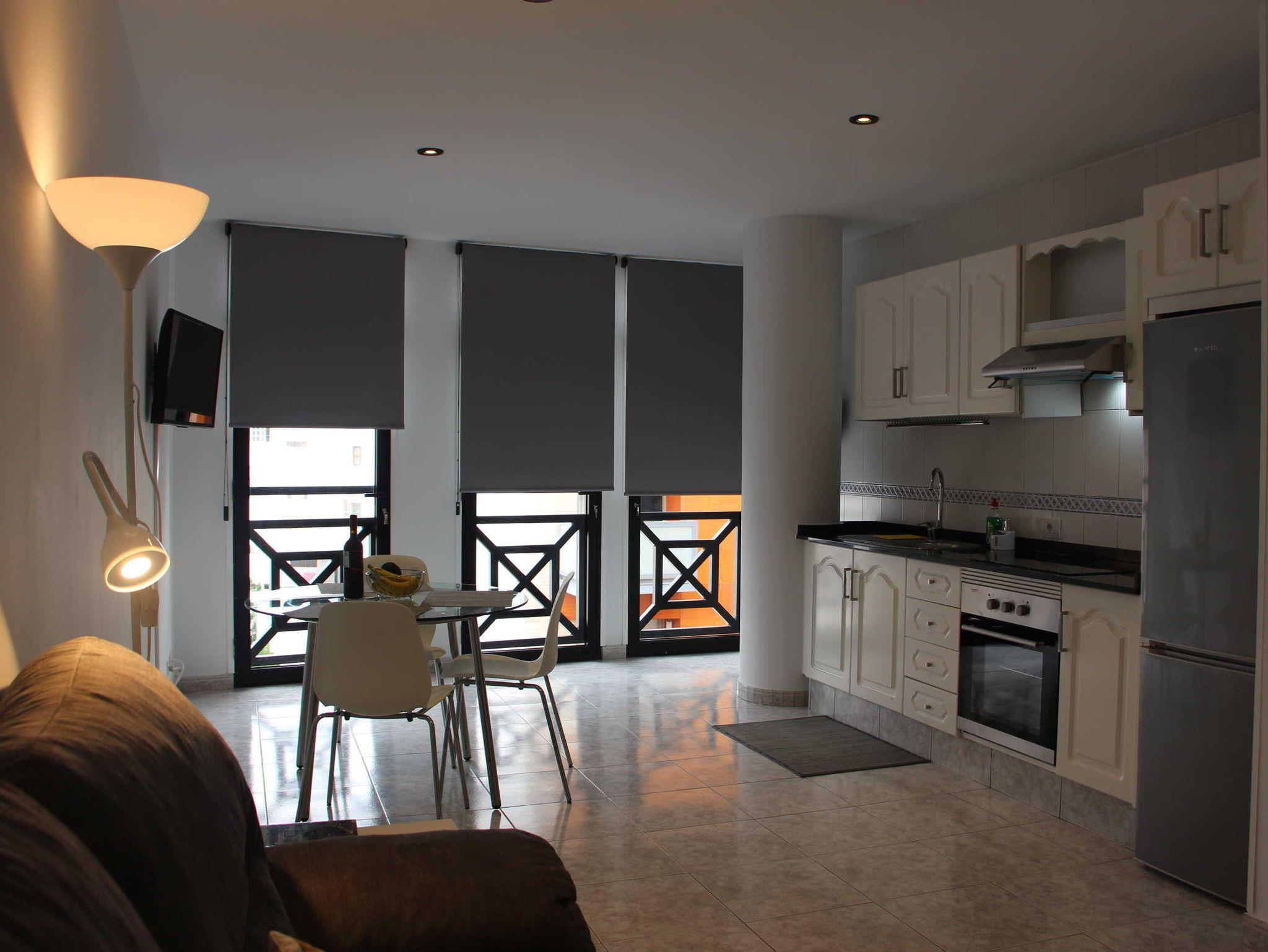Das Apartment mit 55qm Wohnfläche bietet ausreichend Platz für 2 Erwachsene und ein Baby. Es ist schlicht, aber sehr modern eingerichtet. Das Sofa mit kleinem Sideboard, Beistelltisch und Leselampe steht direkt am Eingang des Wohn/Essbereiches. Der Flachbildfernseher ist komplett drehbar, so kann man sowohl vom Sofa aus fernsehen schauen als auch vom Essbereich. Die moderne und komplett neu ausgestattete Küchenzeile trumpft mit sehr viel Stauraum und einem Glastisch mit 3 Stühlen. Das Apartment hat keinen Balkon, die Fensterfront im Wohnbereich und im Schlafzimmer geht jeweils bis zum Boden und kann komplett abgedunkelt werden. Man blickt auf eine der Haupteinkaufsstraßen von Los Llanos, die Fußgängerzone ist.