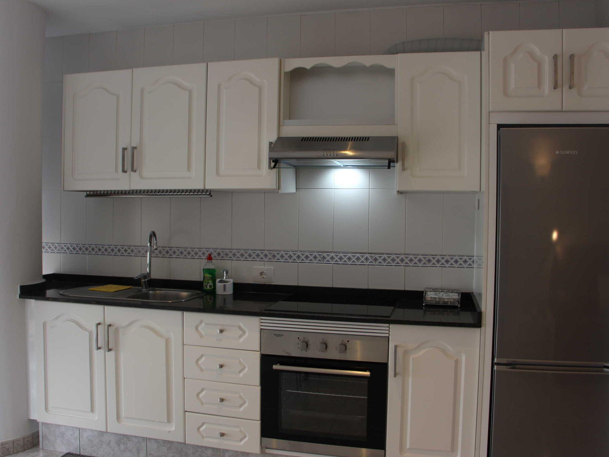 • Küchenzeile mit Ceran (3 Felder), Backofen, Dunstabzug, Mikrowelle, elektrische Kaffeemaschine, Cafetera, Toaster, große Kühl-/Gefrierkombination