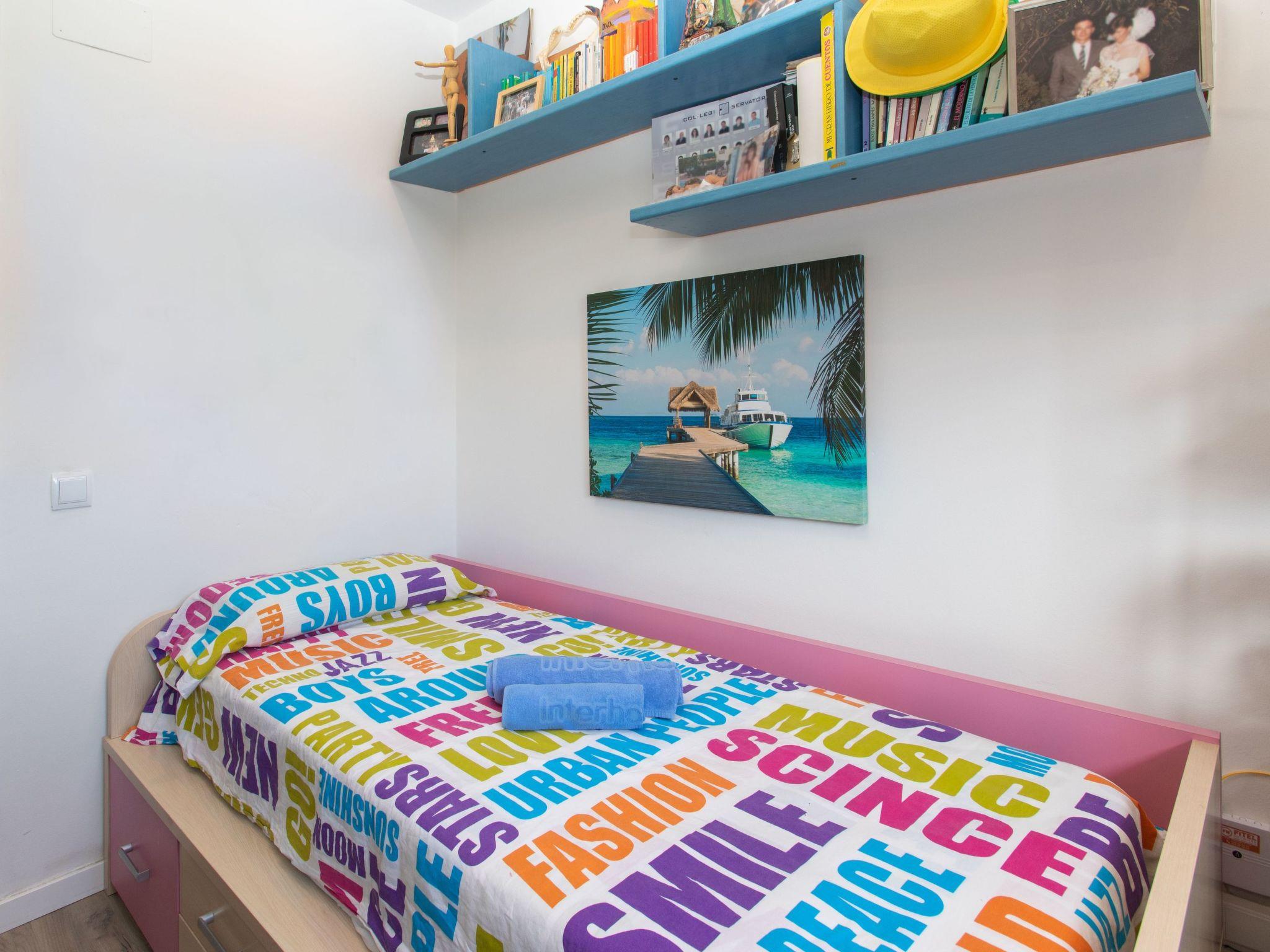 "Jessmart", 4-room apartment 102 m2. Spacious and bright, practical and stylish furnishings: living/dining room with dining table, digital TV and fan. Exit to the balcony. 1 double bedroom with 1 french bed (150 cm, length 190 cm), shower/WC and fan. 1 room with 1 bed (90 cm, length 190 cm), fan. 1 double bedroom with 1 french bed (135 cm, length 190 cm), fan. Kitchen (oven, dishwasher, 4 ceramic glass hob hotplates, toaster, kettle, microwave, freezer, electric coffee machine, Capsules for coffee machine (Nespresso) extra). Bath/WC. No heating option. Balcony furniture. Partial view of the sea. Facilities: washing machine, iron, children's high chair, baby cot for up to 2 year olds, hair dryer. Internet (WiFi, free). Please note: suitable for families. TV only ES. HUTG-005954