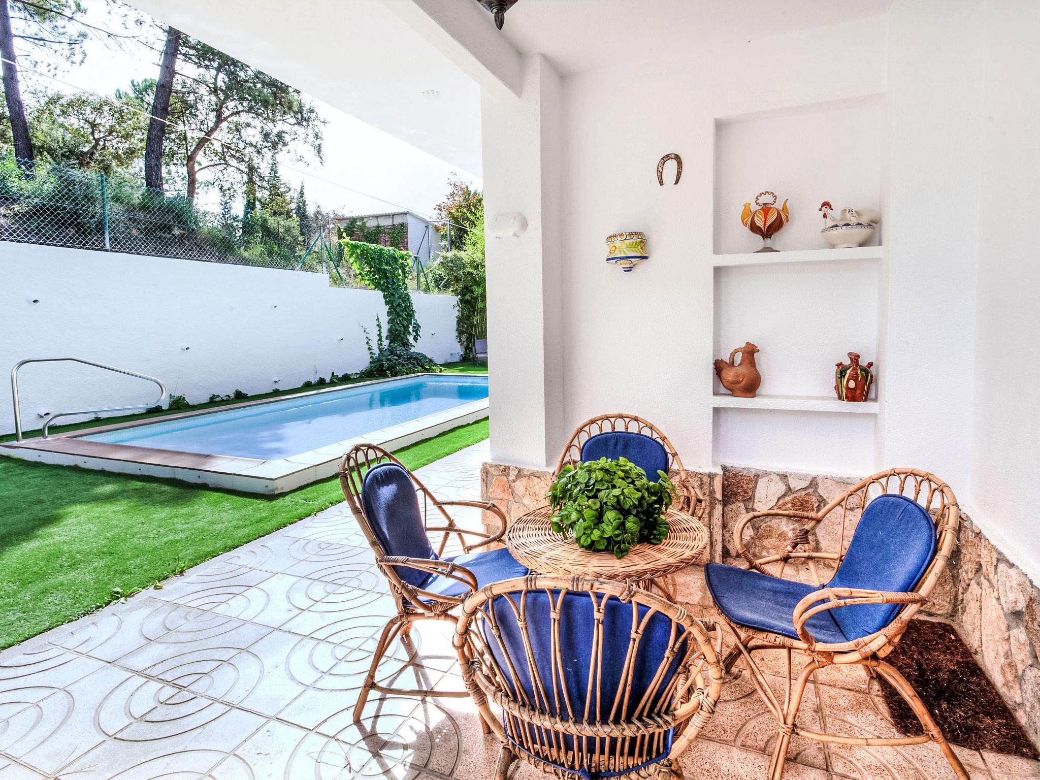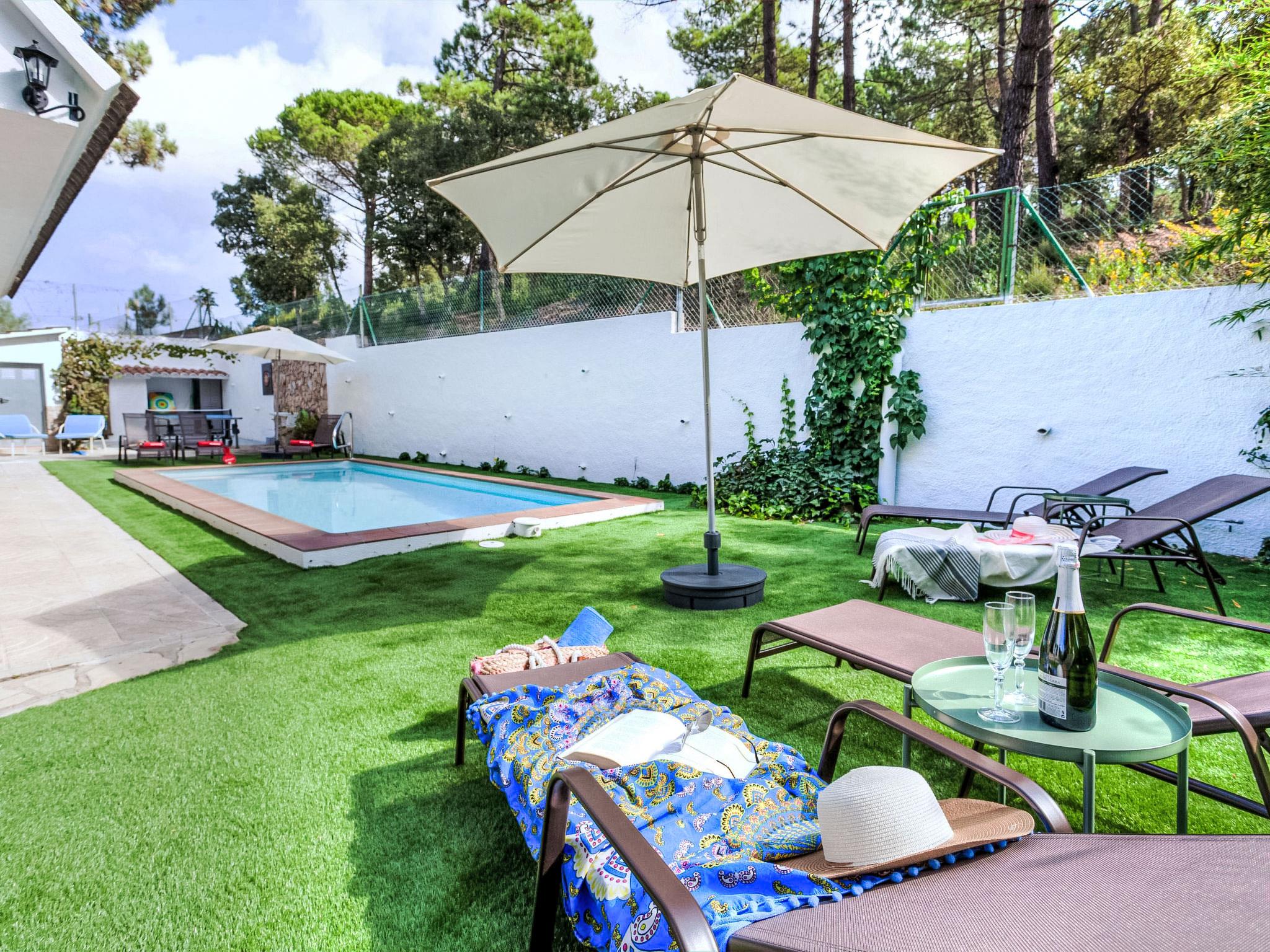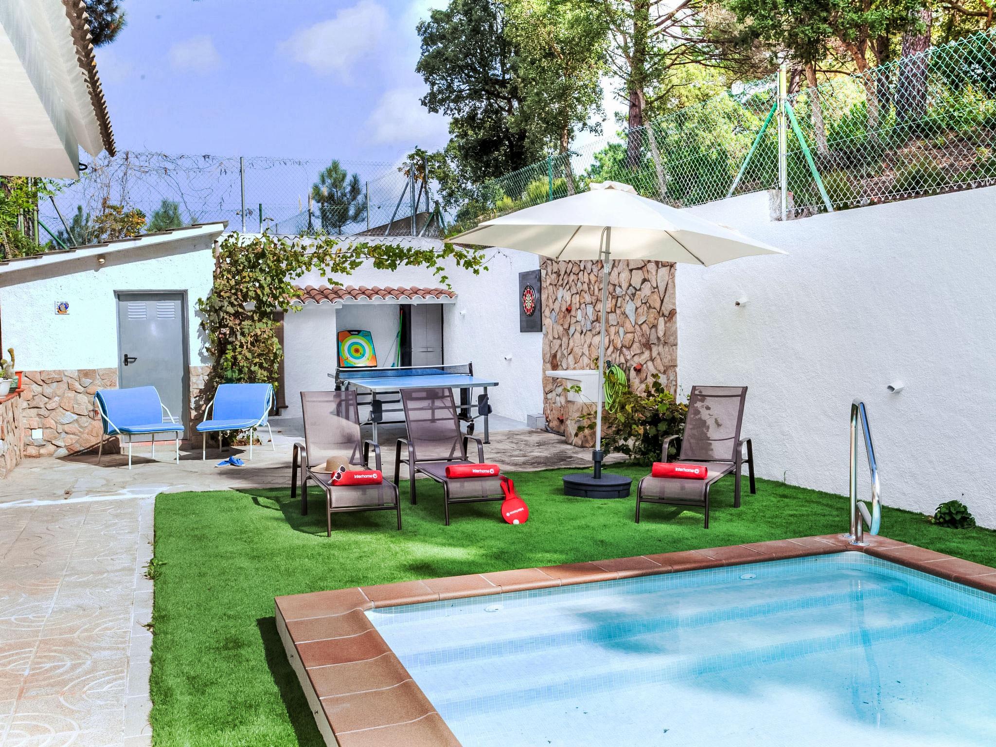 Urb. Puigventós: 10 km from Playa de Lloret de Mar: Large, cosy, rustic hillside complex "Paradis", 2 storeys, surrounded by trees. Outside the resort, 10 km from the centre of Lloret de Mar, in the district Urbanizacion Puigventos, in a quiet, sunny position, 10 km from the sea, located by a road, south facing position. For shared use: swimming pool fenced (depth 50 - 200 cm, seasonal availability: 15.May. - 15.Oct.). Tennis (extra), basketball (extra), children's playground. Private: garden 1'200 m2 (fenced) with lawn and wildlife garden, swimming pool angular (7 x 3 m, depth 200 cm, seasonal availability: 01.May. - 20.Oct.) with internal staircase and salt-electrolysis pool-cleaning system. Outdoor shower, pool house with fridge, table tennis, patio, arbour, pergola, garden furniture, barbecue. In the house: playroom. Parking (for 2 cars) at the house on the premises. Grocery 6.9 km, supermarket 6.9 km, shopping centre 9 km, sandy beach 10 km, outdoor swimming pool 500 m. Tennis 500 m. Nearby attractions: water world 7.5 km, marineland 17.5 km, gnomo park 10.5 km. Hiking paths: cami de ronda GR-92 14.4 km. Please note: car recommended. Suitable for families. Groups of teenagers on request only. Neighbourhood highly sensitive to noise. Quietness and good behaviour expected.