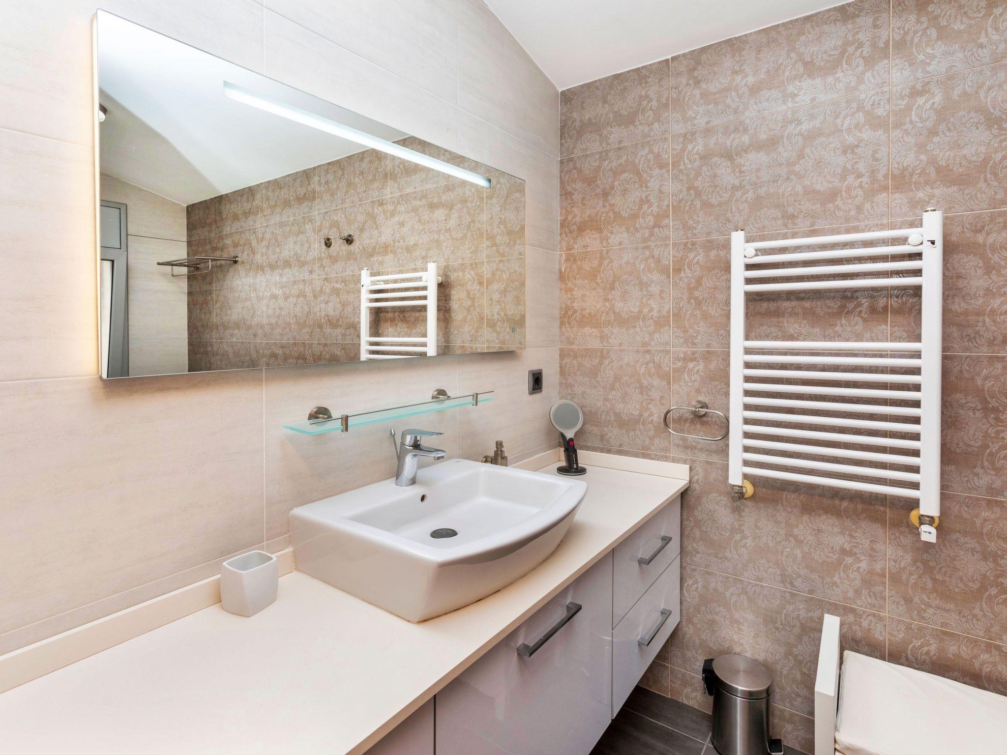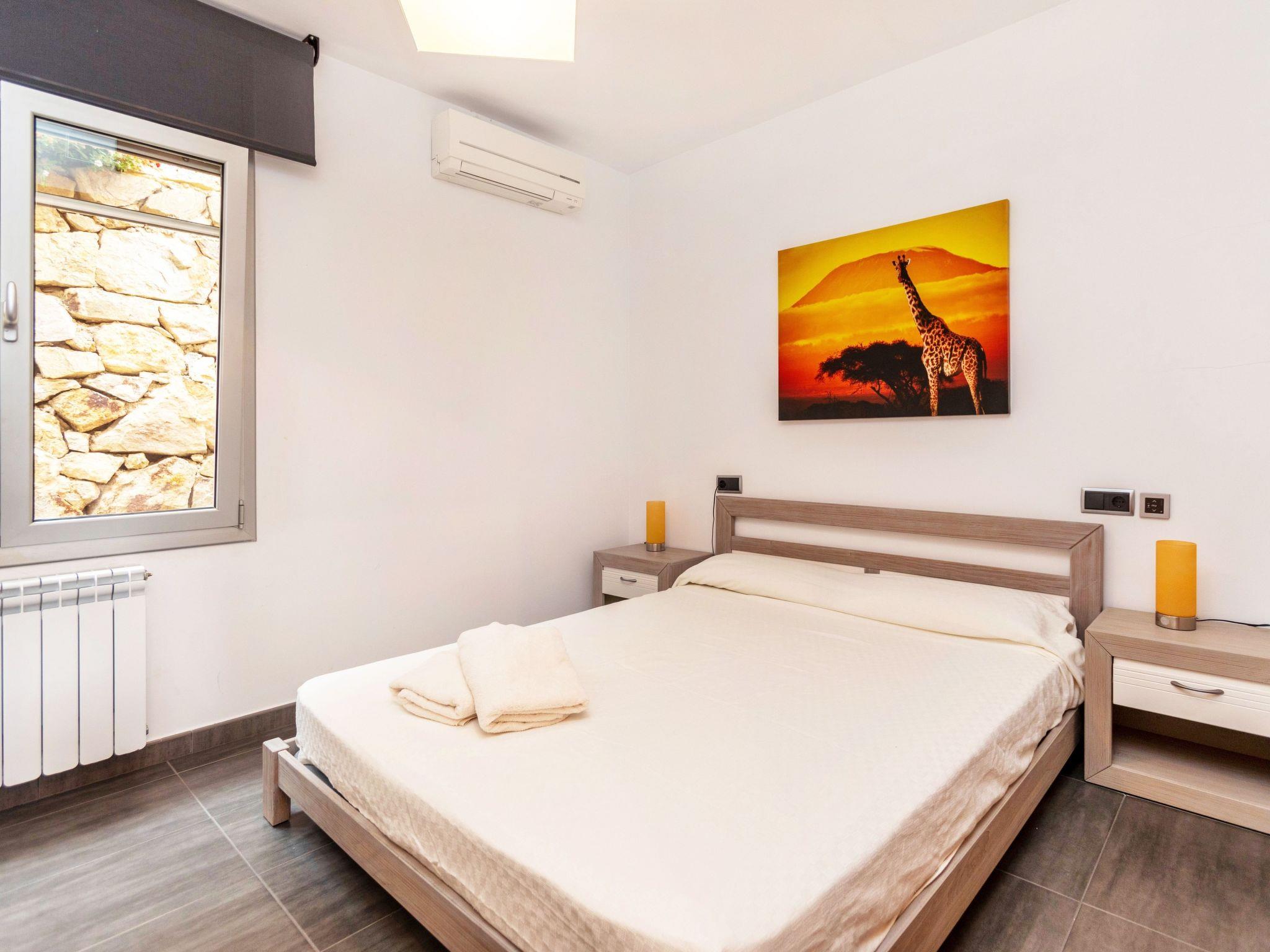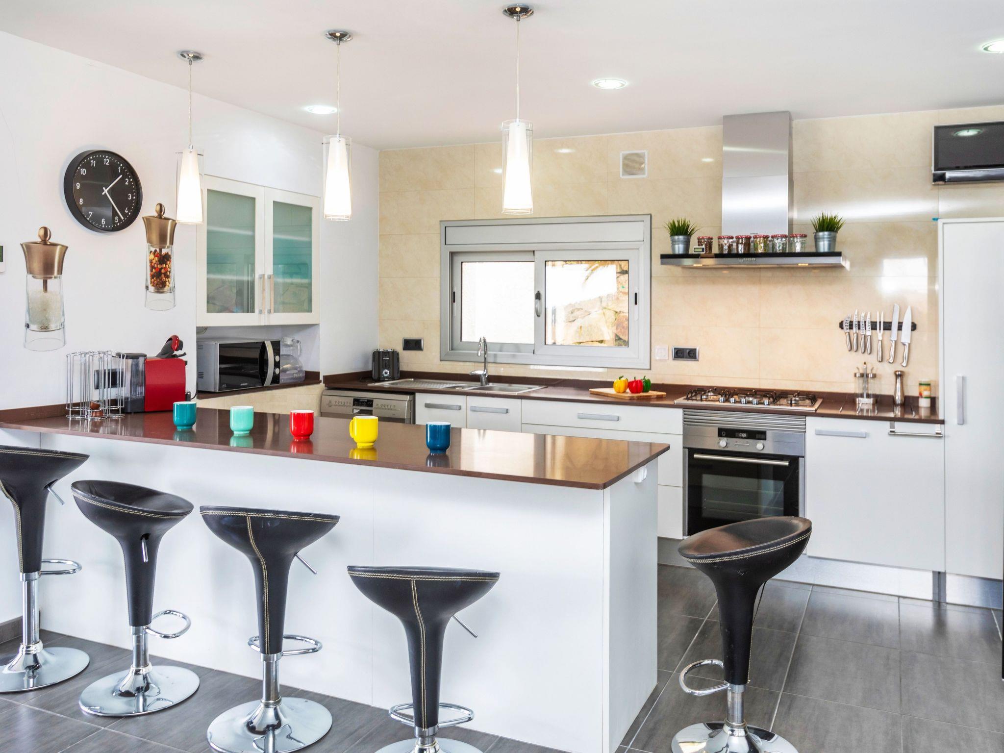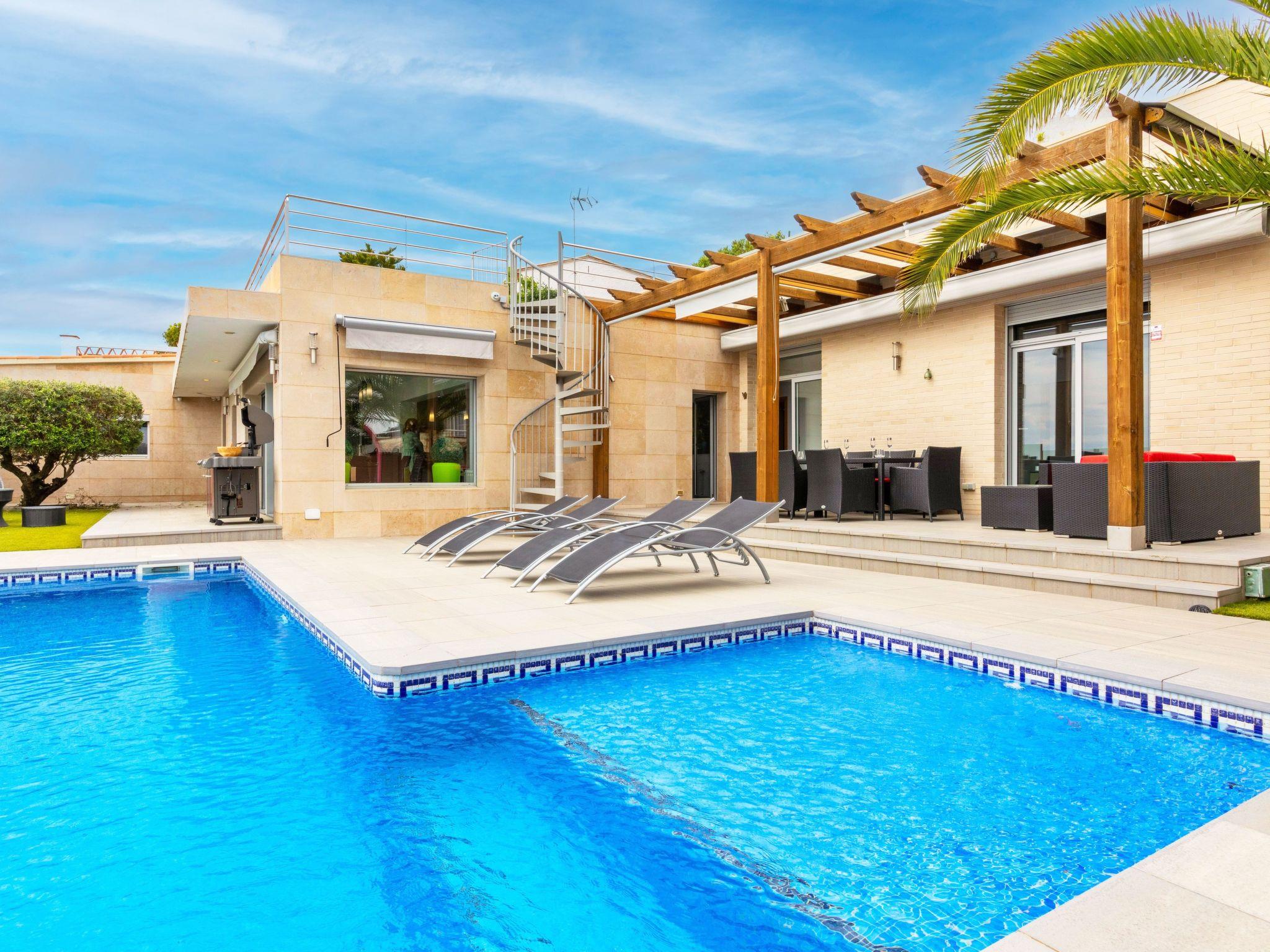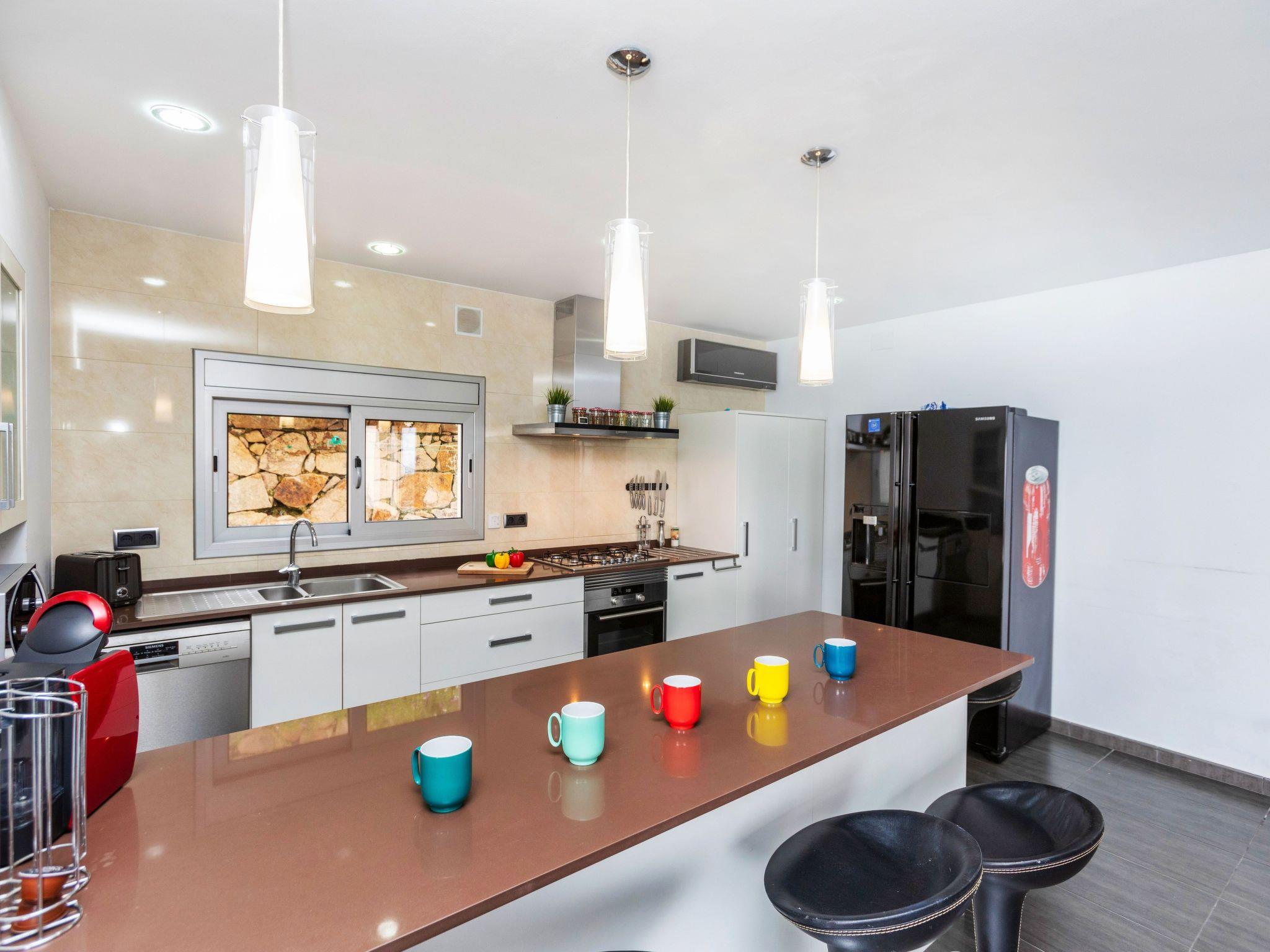 "Chill", 5-room villa 250 m2. Spacious and bright, very comfortable and modern furnishings: living/dining room with dining table, digital TV, air conditioning and forced-air heating. Exit to the terrace, to the swimming pool. 1 double bedroom with 2 beds (90 cm, length 190 cm), digital TV. 2 double bedrooms, each room with 1 french bed (160 cm, length 190 cm), shower/WC. 1 large double bedroom with 1 french bed (160 cm, length 190 cm), bath/bidet/WC and digital TV. Exit to the terrace, to the swimming pool. Large, open kitchen (oven, dishwasher, 4 ceramic glass hob hotplates, toaster, kettle, microwave, freezer, electric coffee machine) with bar. Shower/WC. Terrace furniture, deck chairs. Distant view of the sea and the resort. Facilities: washing machine, dryer, iron, children's high chair, baby cot for up to 2 year olds, hair dryer. Internet (WiFi, free). Please note: suitable for families. TV only ES. HUTG-024555 // Reg. Nr.: ESFCTU00001702100009519300000000000000000HUTG-0245550