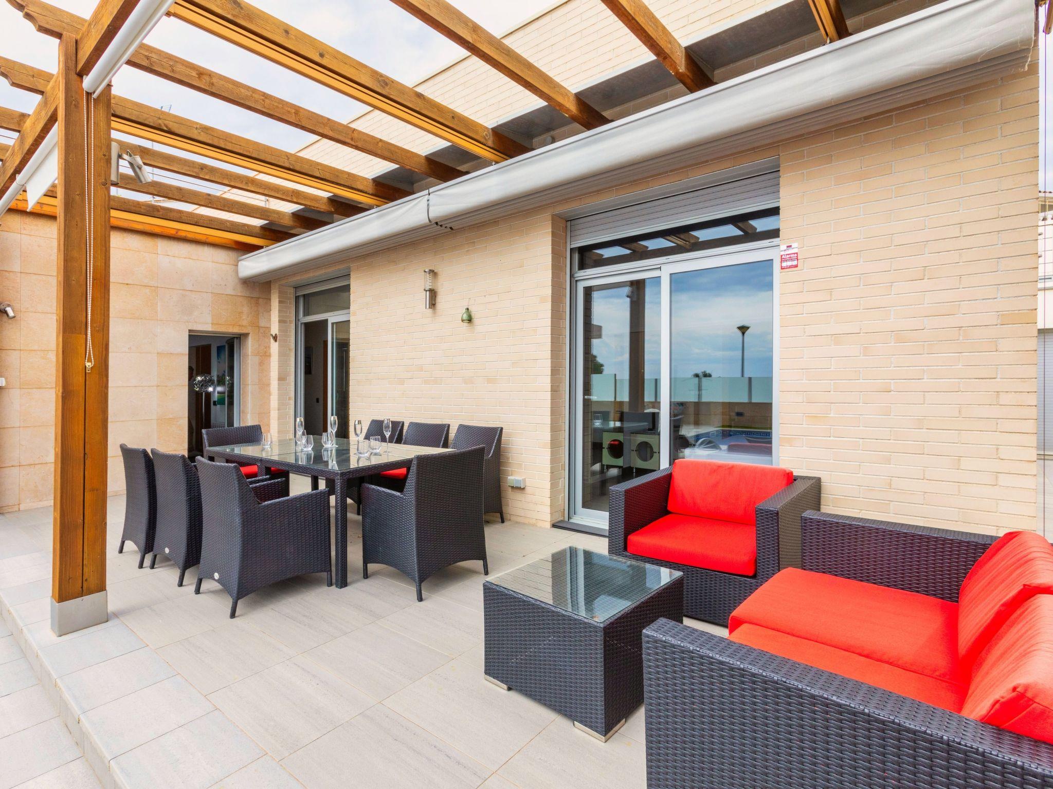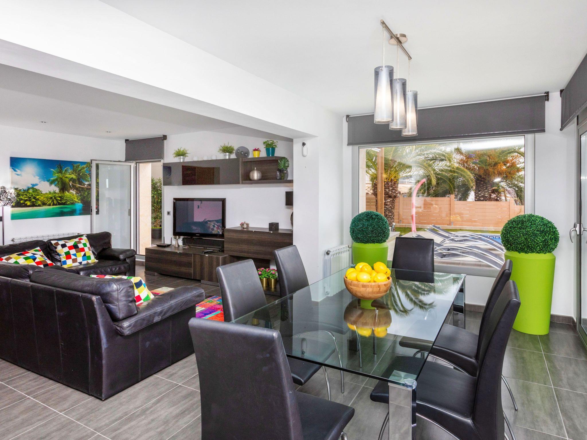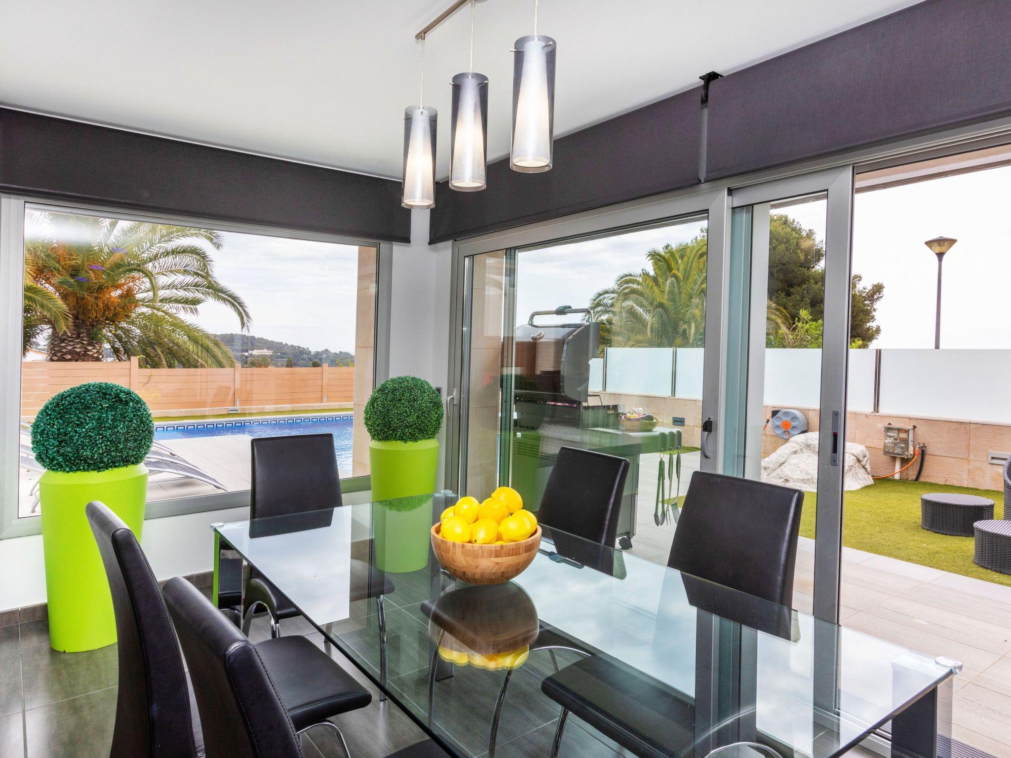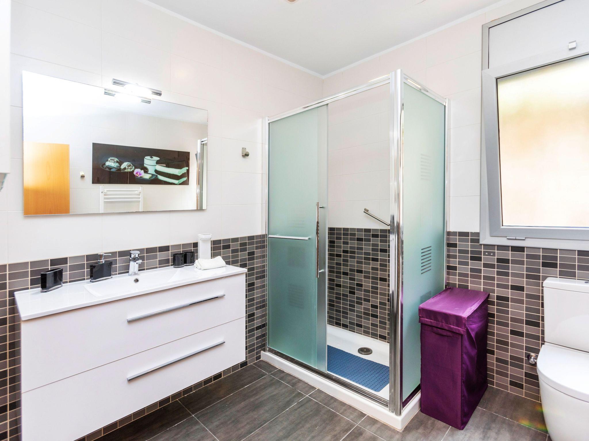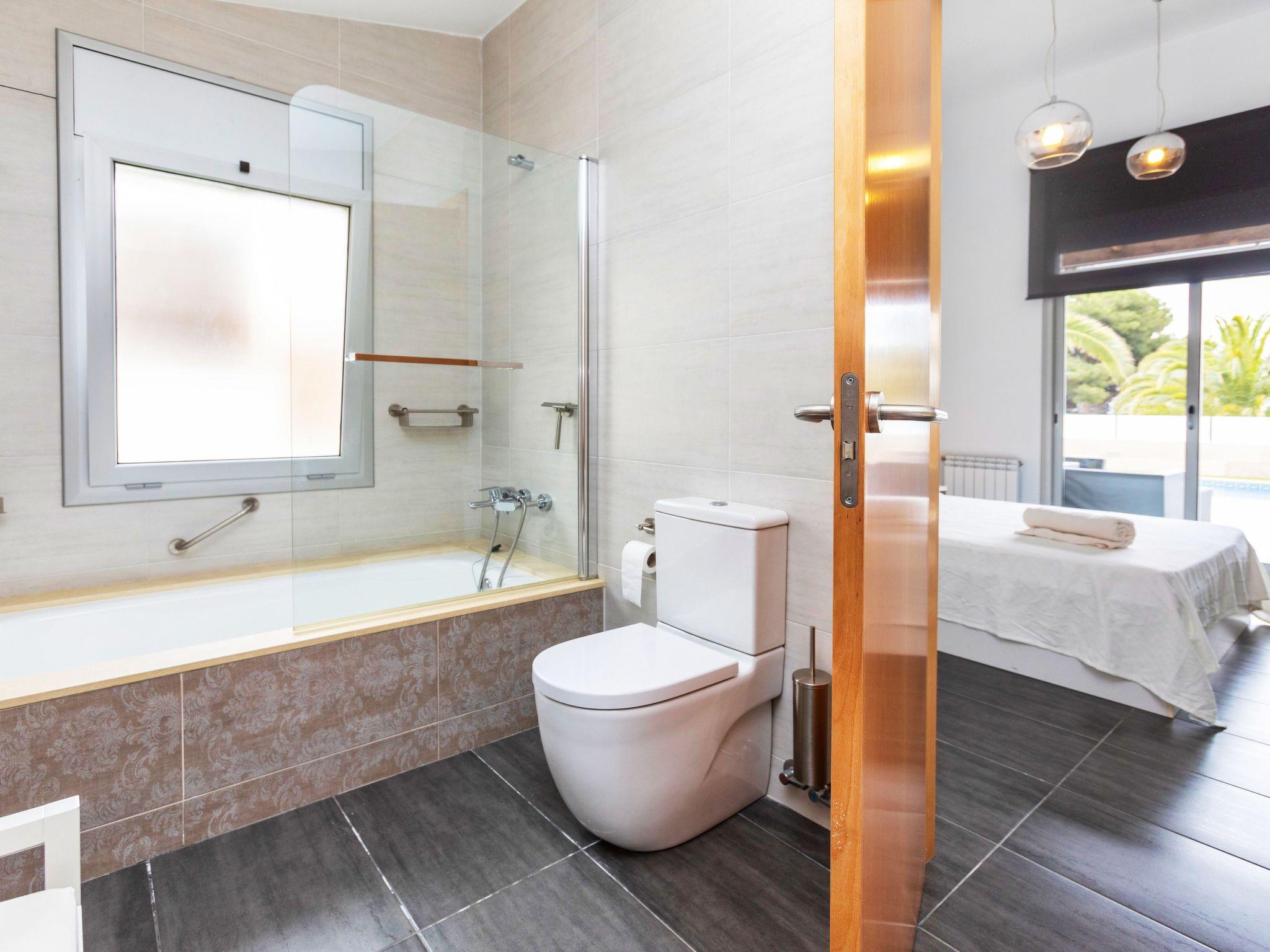 "Chill", 5-room villa 250 m2. Spacious and bright, very comfortable and modern furnishings: living/dining room with dining table, digital TV, air conditioning and forced-air heating. Exit to the terrace, to the swimming pool. 1 double bedroom with 2 beds (90 cm, length 190 cm), digital TV. 2 double bedrooms, each room with 1 french bed (160 cm, length 190 cm), shower/WC. 1 large double bedroom with 1 french bed (160 cm, length 190 cm), bath/bidet/WC and digital TV. Exit to the terrace, to the swimming pool. Large, open kitchen (oven, dishwasher, 4 ceramic glass hob hotplates, toaster, kettle, microwave, freezer, electric coffee machine) with bar. Shower/WC. Terrace furniture, deck chairs. Distant view of the sea and the resort. Facilities: washing machine, dryer, iron, children's high chair, baby cot for up to 2 year olds, hair dryer. Internet (WiFi, free). Please note: suitable for families. TV only ES. HUTG-024555 // Reg. Nr.: ESFCTU00001702100009519300000000000000000HUTG-0245550