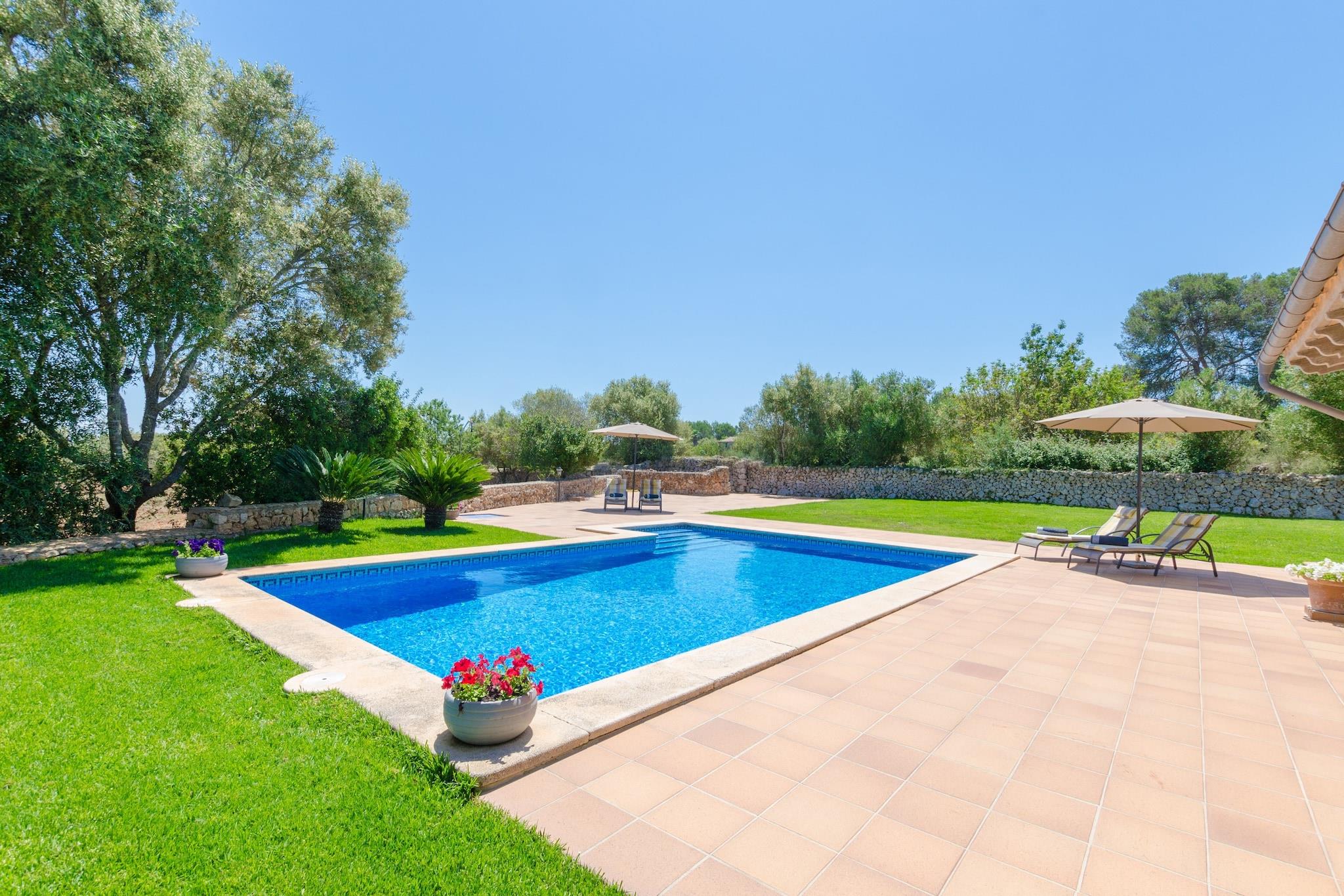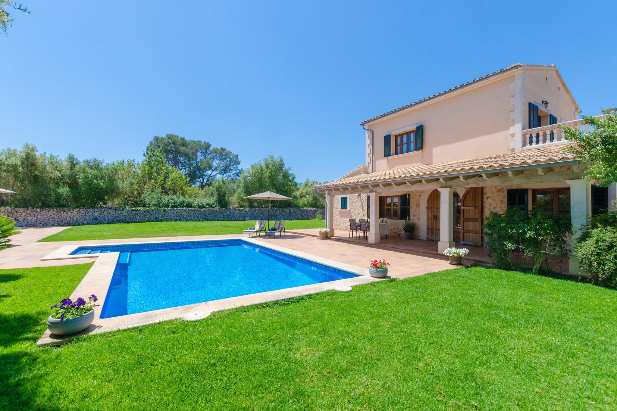 Slap af i rolige landskabelige omgivelser, hvor den private 9x5m pool er i centrum, omgivet af en grøn græsplæne og seks liggestole perfekt til lange eftermiddage i solen. En skyggefuld veranda tilbyder det ideelle sted til grill og udendørs spisning, hvilket gør aftenen lige så afslappende som dagene. Med masser af friluftsrum og udsigt over det rustikke to-etagers hjem føles hvert øjeblik udenfor forfriskende og roligt. Indvendigt blander villaen moderne komfort med varmt design. Det rummelige opholds- og spiseområde, komplet med aircondition, satellit-tv og musikanlæg, skaber et indbydende rum for familier og venner. Et fuldt udstyret køkken med gaskomfur, sammen med vaskefaciliteter, gør længere ophold ubesværet. Tre soveværelser, hver med dobbeltsenge og opbevaring, suppleres af tre badeværelser - to af dem en-suite - for ekstra privatliv. Centralvarme, aircondition, barneseng og høj stol sikrer komfort året rundt for alle gæster. Villaen er beliggende kun 2,4 km fra Lloret de Vistalegre og tilbyder nemme forbindelser på tværs af Mallorca. Den charmerende landsby Sineu, med sit ugentlige marked, ligger få minutter væk, mens Palma og strandene i Can Picafort er inden for en kort køretur. Gæsterne kan nyde autentisk mallorcansk spisning i nærliggende landsbyer eller udforske en række restauranter i Palma, kendt for sin blanding af tapasbarer og moderne køkken. Med golfbaner, kulturelle byer og sandstrande i nærheden gør denne villa det nemt at udforske øen.