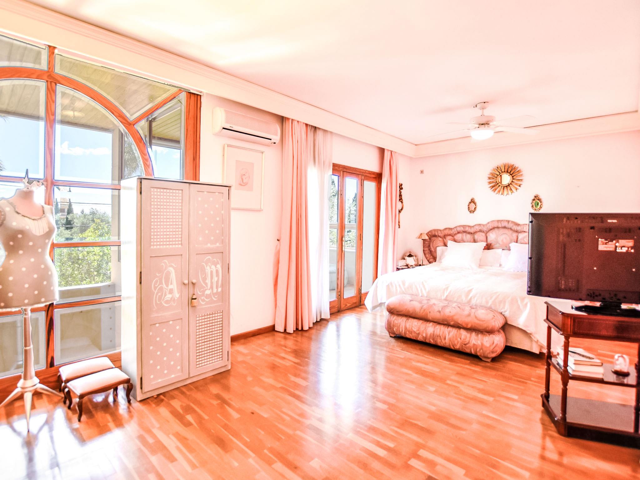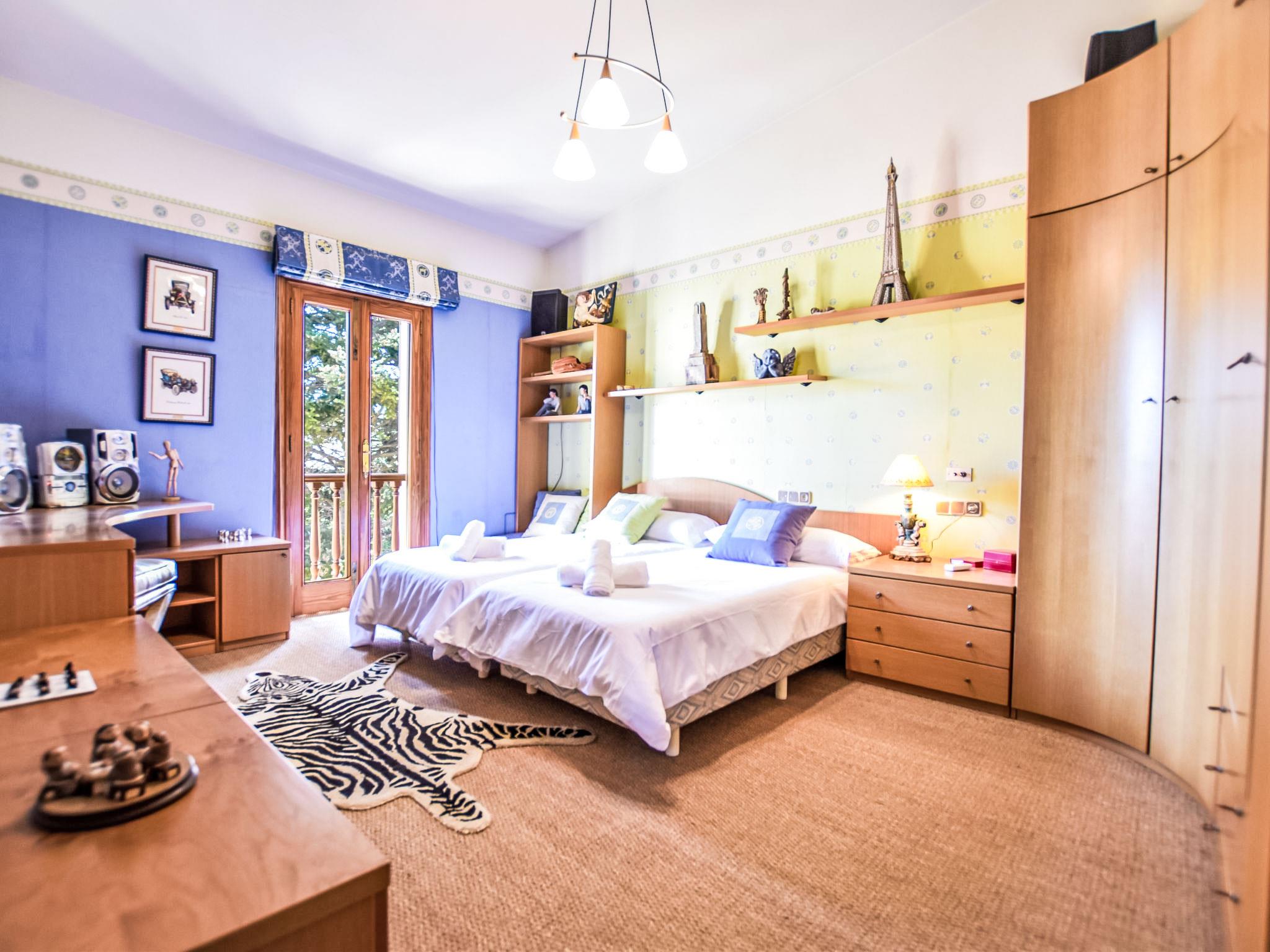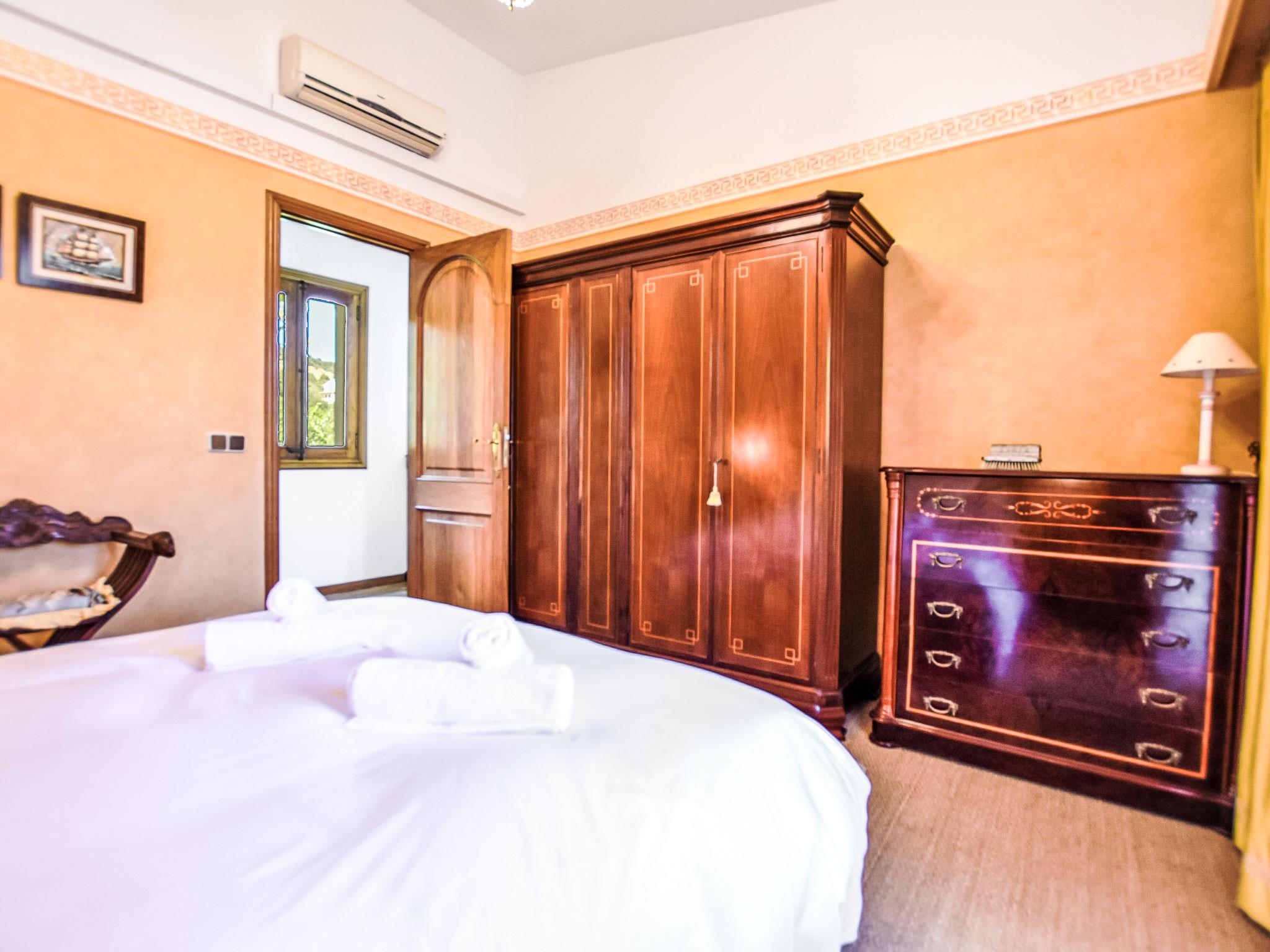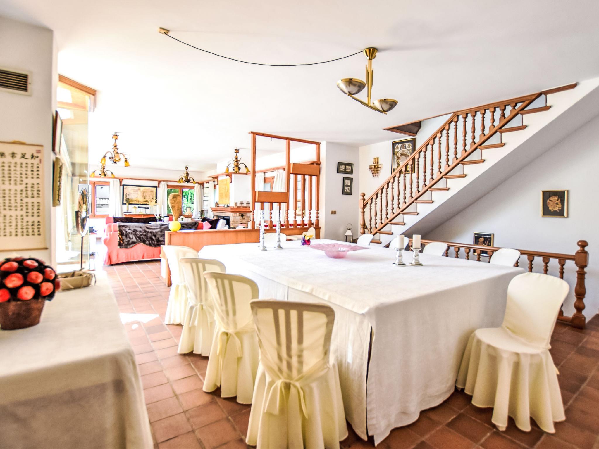 "Can Joan", 9-room villa 450 m2 on 2 levels. Object suitable for 10 adults. Spacious and bright, very comfortable and tasteful furnishings: open large living room with sliding door, panoramic window. Exit to the garden. Large dining room with dining table. Large living room with sliding door, panoramic window with dining table, satellite TV and flat screen. Exit to the patio. Lounge with panoramic window with satellite TV, air conditioning and forced-air heating. 1 large double bedroom with panoramic window with 1 french bed. Kitchen-/living room (oven, dishwasher, 3 ceramic glass hob hotplates, toaster, kettle, microwave, freezer, electric coffee machine) with dining table, air conditioning and forced-air heating. Exit to the terrace. Bath/WC, bath/shower/WC. Upper floor: 1 large double bedroom with panoramic window Dressing room with 1 double bed, bath/shower/WC, TV, flat screen, air conditioning, fan and forced-air heating. 2 large double bedrooms with panoramic window, each room with 1 french bed, air conditioning and forced-air heating. 1 double bedroom with panoramic window with 2 beds (90 cm), air conditioning and forced-air heating. Bath/shower/WC, double hand-basin with corner bath. Comfortable furnishings in the country house style. Large patio, lawn. Terrace furniture, barbecue, deck chairs (6), covered balcony. View of the mountains and the resort. Facilities: washing machine, dryer, iron, hair dryer. Internet (WiFi, free). Suitable for families. ETV/12285 // Reg. Nr.: ESFCTU0000070220001404350000000000000000000ETV/122856