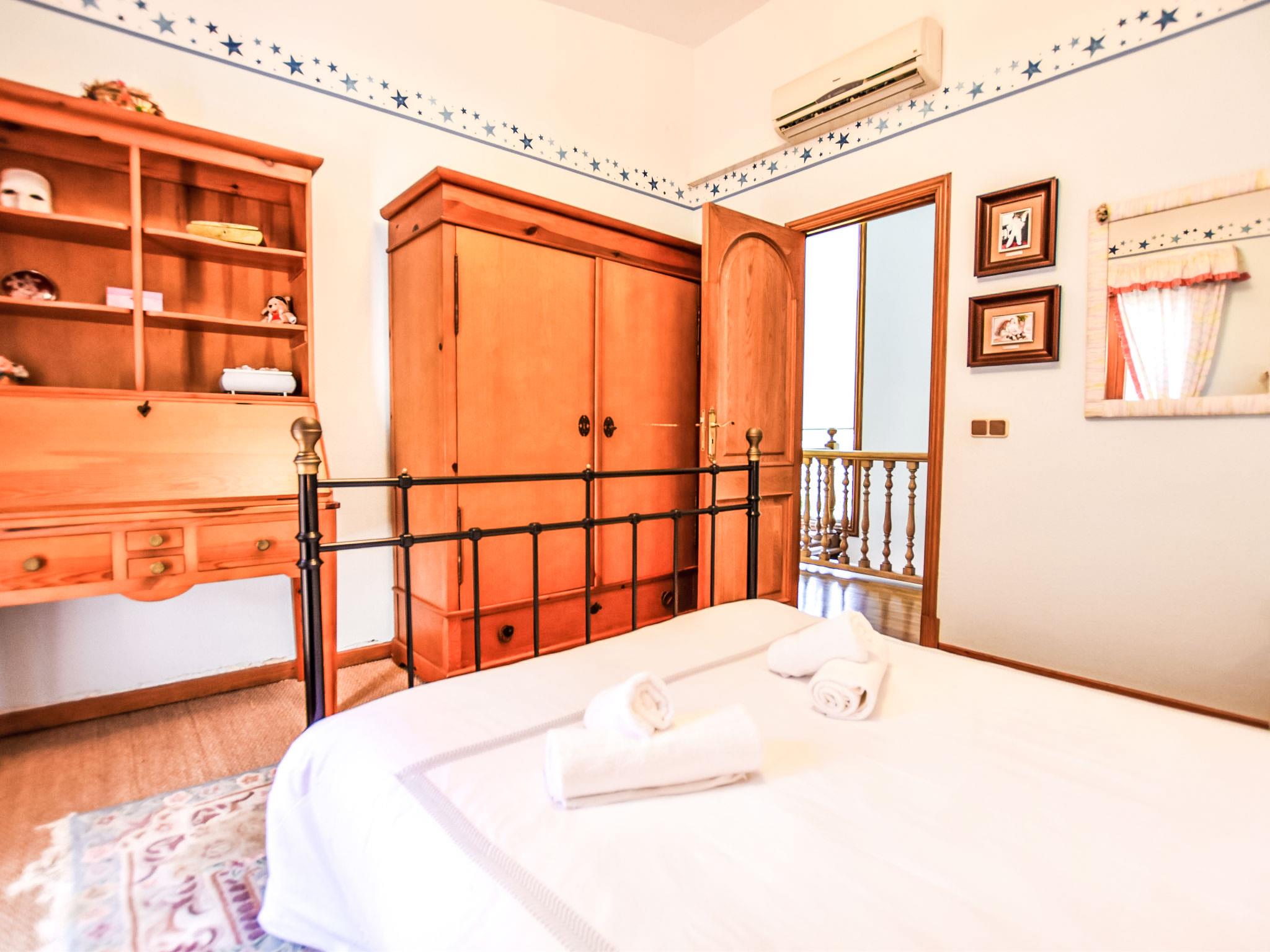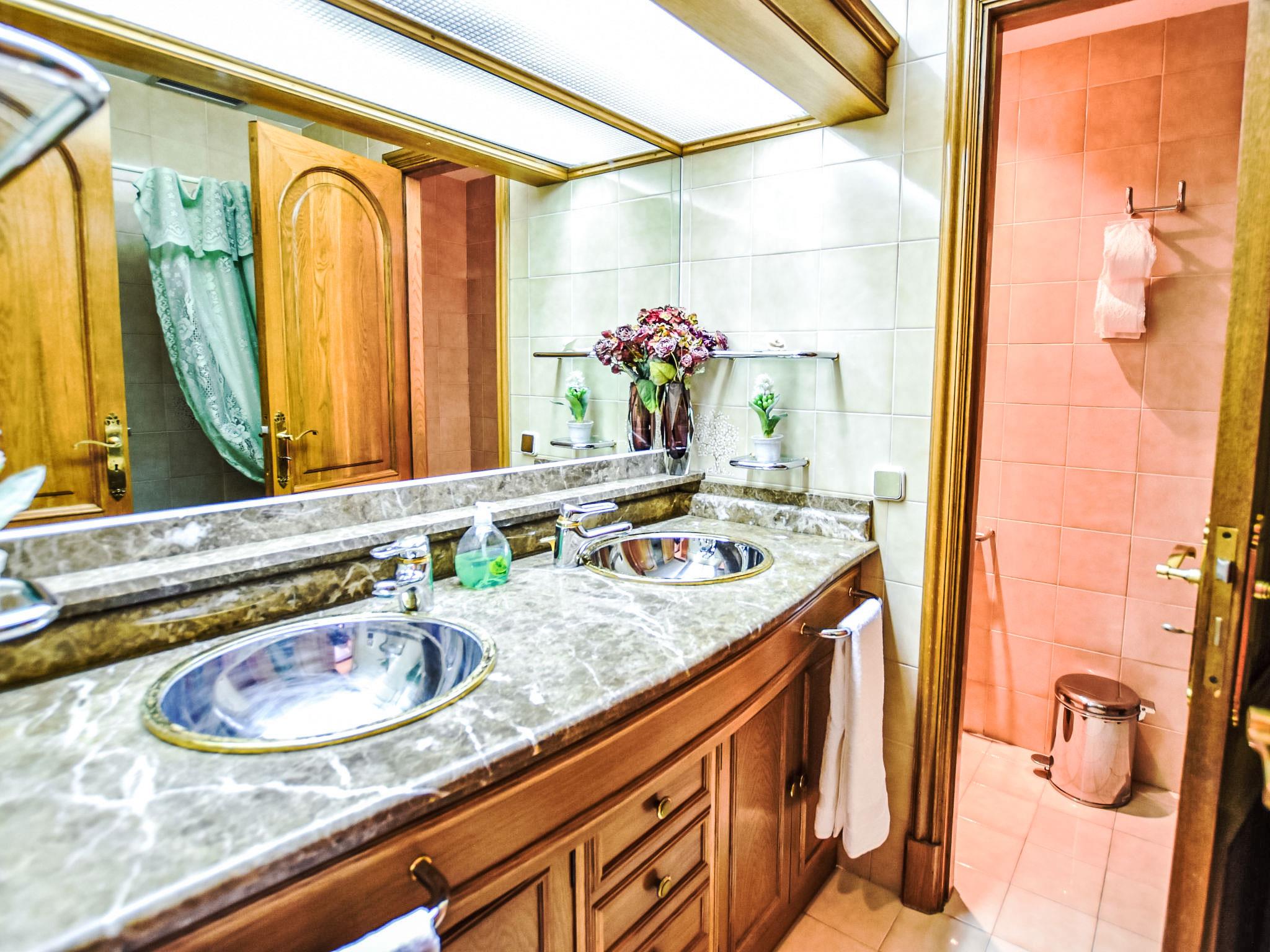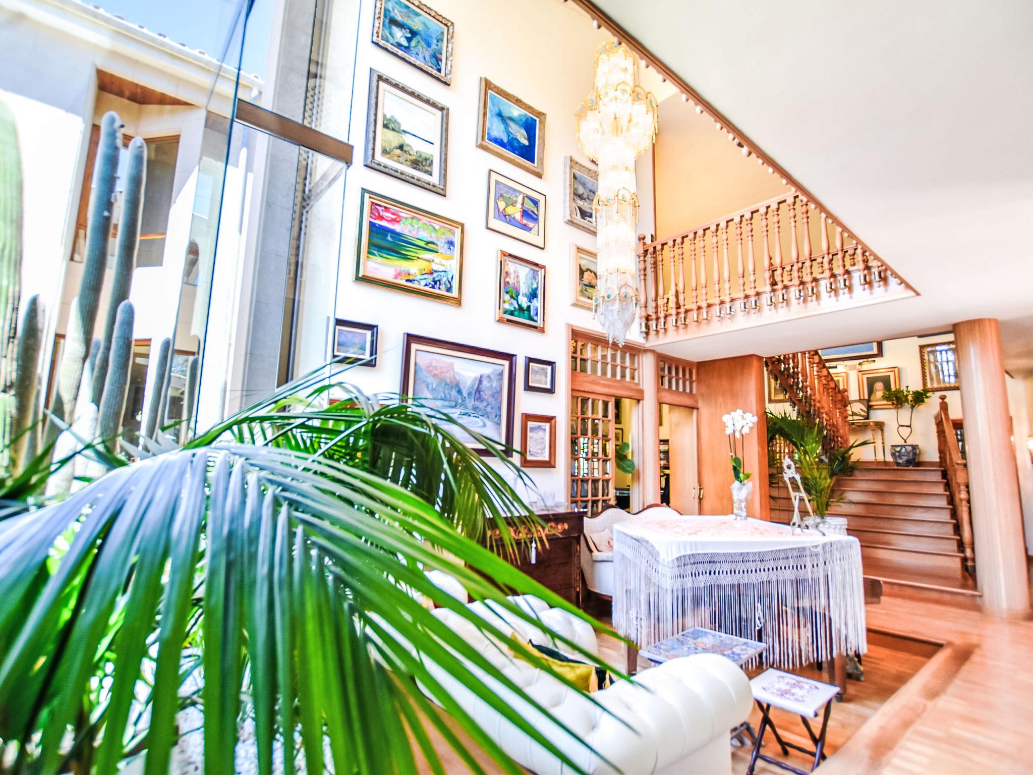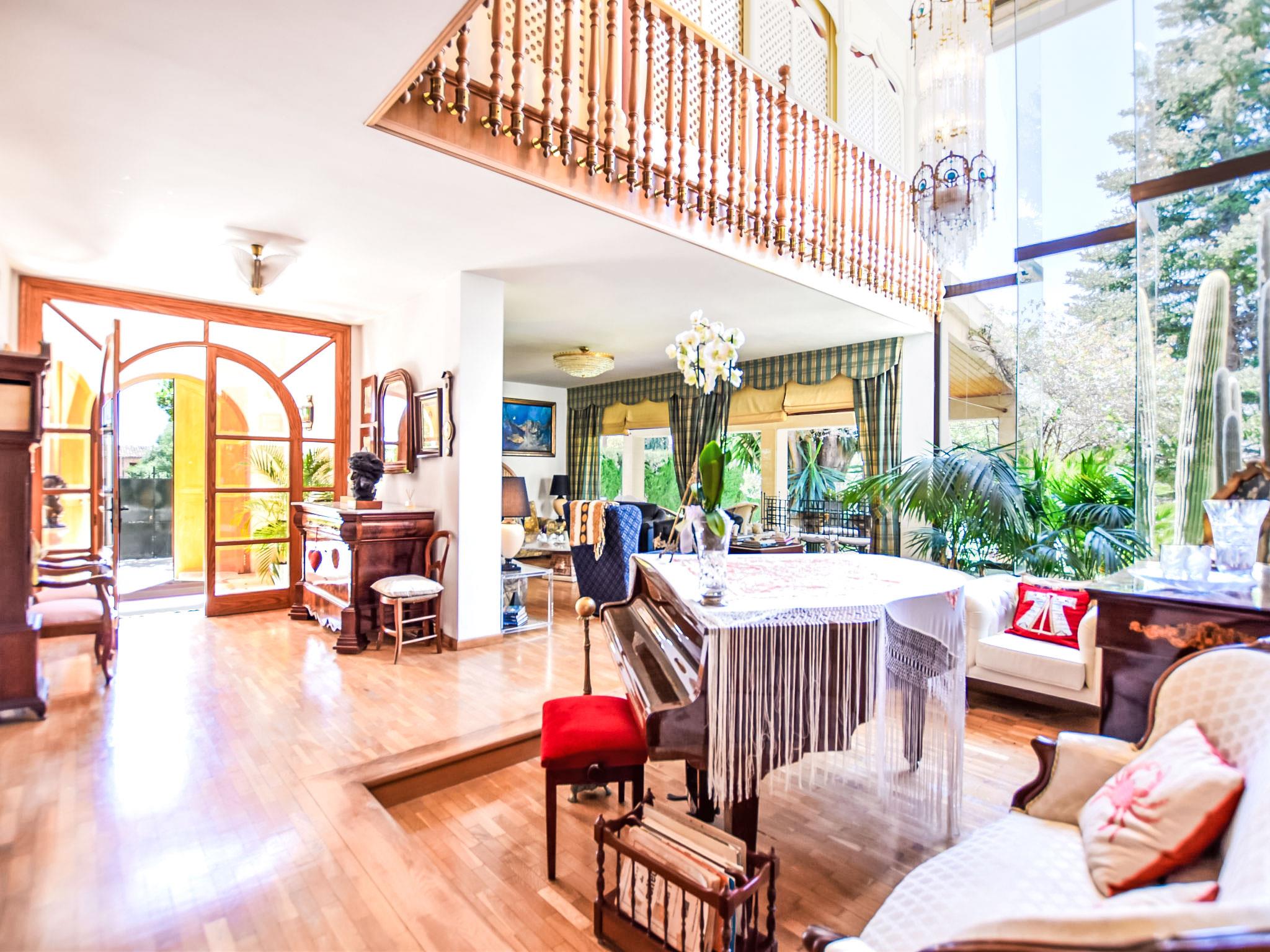 "Can Joan", 9-room villa 450 m2 on 2 levels. Object suitable for 10 adults. Spacious and bright, very comfortable and tasteful furnishings: open large living room with sliding door, panoramic window. Exit to the garden. Large dining room with dining table. Large living room with sliding door, panoramic window with dining table, satellite TV and flat screen. Exit to the patio. Lounge with panoramic window with satellite TV, air conditioning and forced-air heating. 1 large double bedroom with panoramic window with 1 french bed. Kitchen-/living room (oven, dishwasher, 3 ceramic glass hob hotplates, toaster, kettle, microwave, freezer, electric coffee machine) with dining table, air conditioning and forced-air heating. Exit to the terrace. Bath/WC, bath/shower/WC. Upper floor: 1 large double bedroom with panoramic window Dressing room with 1 double bed, bath/shower/WC, TV, flat screen, air conditioning, fan and forced-air heating. 2 large double bedrooms with panoramic window, each room with 1 french bed, air conditioning and forced-air heating. 1 double bedroom with panoramic window with 2 beds (90 cm), air conditioning and forced-air heating. Bath/shower/WC, double hand-basin with corner bath. Comfortable furnishings in the country house style. Large patio, lawn. Terrace furniture, barbecue, deck chairs (6), covered balcony. View of the mountains and the resort. Facilities: washing machine, dryer, iron, hair dryer. Internet (WiFi, free). Suitable for families. ETV/12285 // Reg. Nr.: ESFCTU0000070220001404350000000000000000000ETV/122856