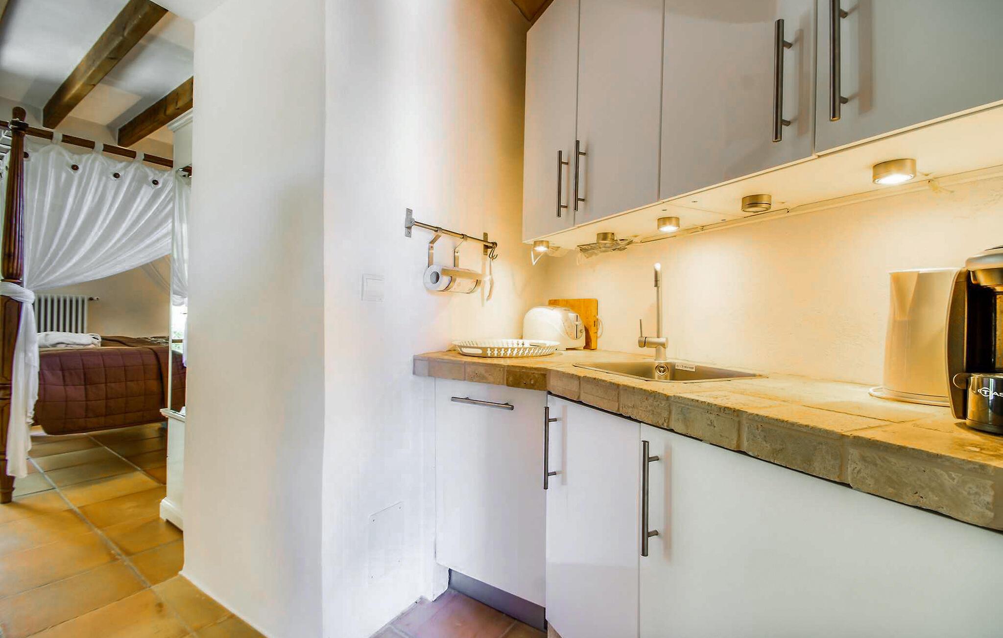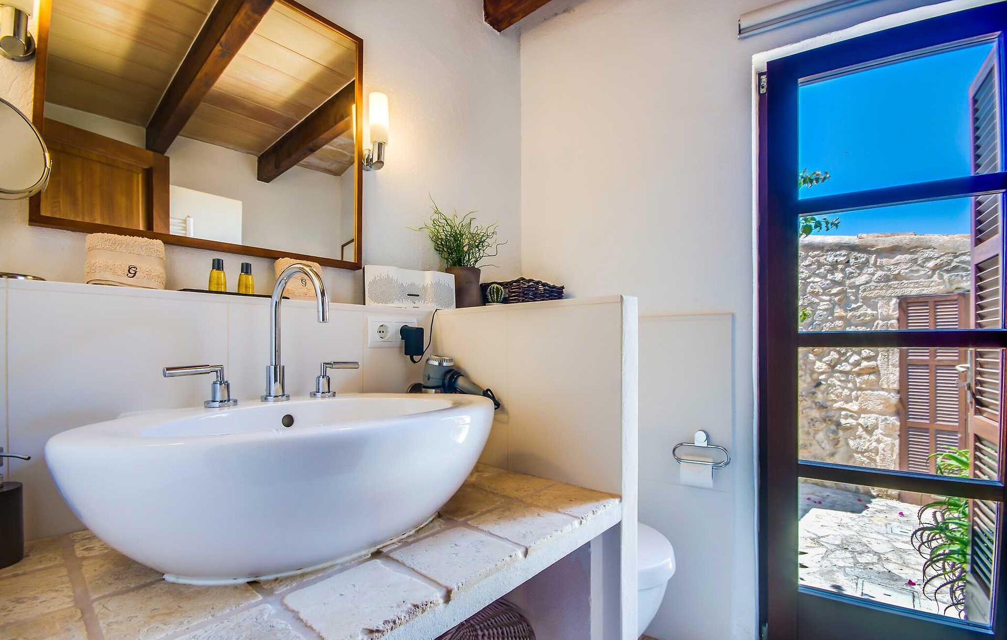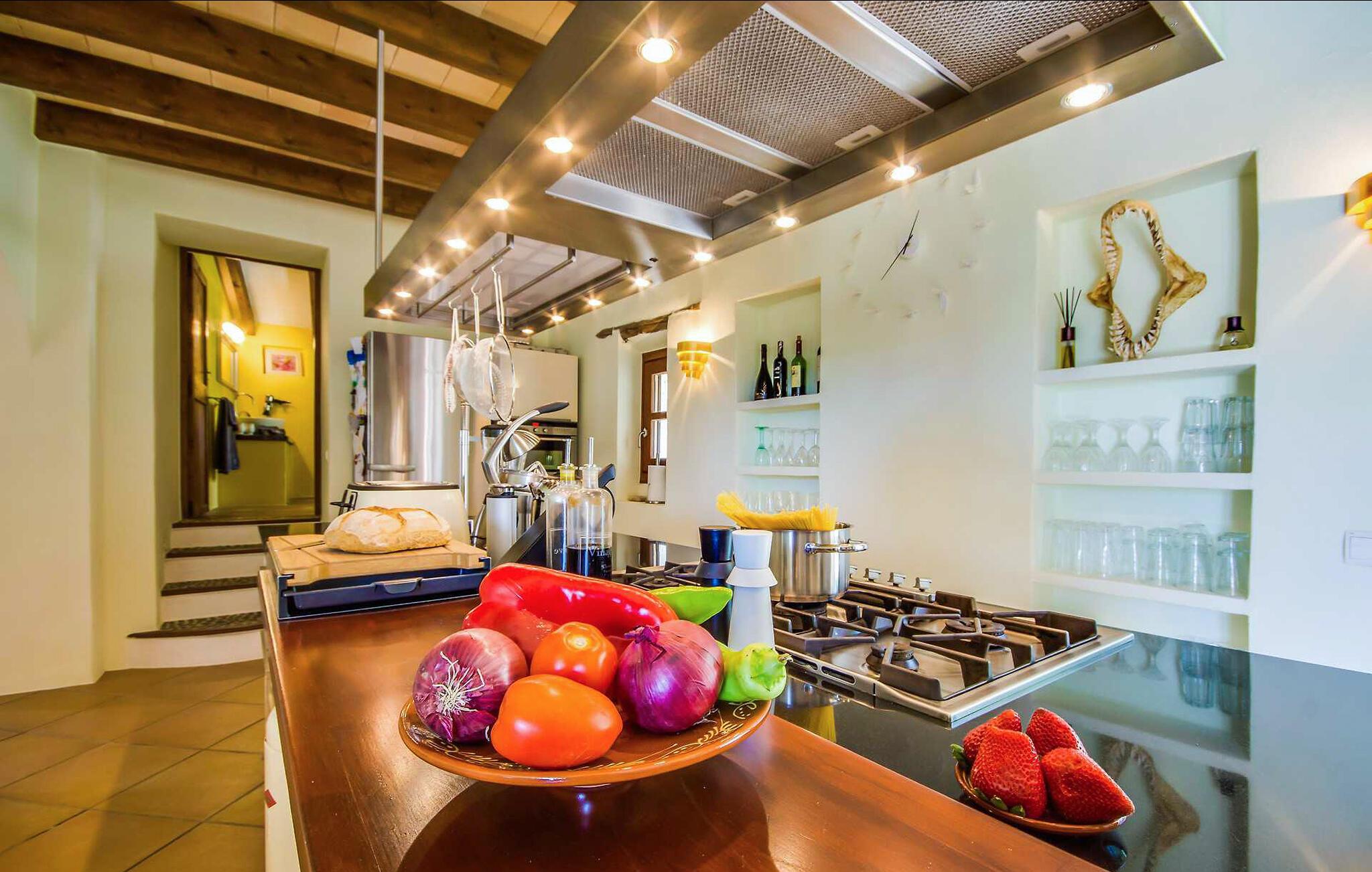 Et højdepunkt er det veludstyrede højglanskøkken, hvor hjemmekokken rigtig kan boltre sig. Skræddersyede skulpturer og farverige malerier af den cubanske kunstner Ernesto Rodriguez skaber en vellykket kontrast til de historiske genstande i den rummelige stue. Dele af en gammel talayot ??er indlejret i bygningens grundvægge. Stuen giver jer gode rammer til at slappe af og læne sig tilbage i de behagelige stole, hvor der er et stort smart-tv. De tykke naturstensvægge holder huset behageligt køligt om sommeren, mens kraftfuld oliecentralvarme og gulvvarme i stuen sørger for et behageligt indeklima på kølige dage.